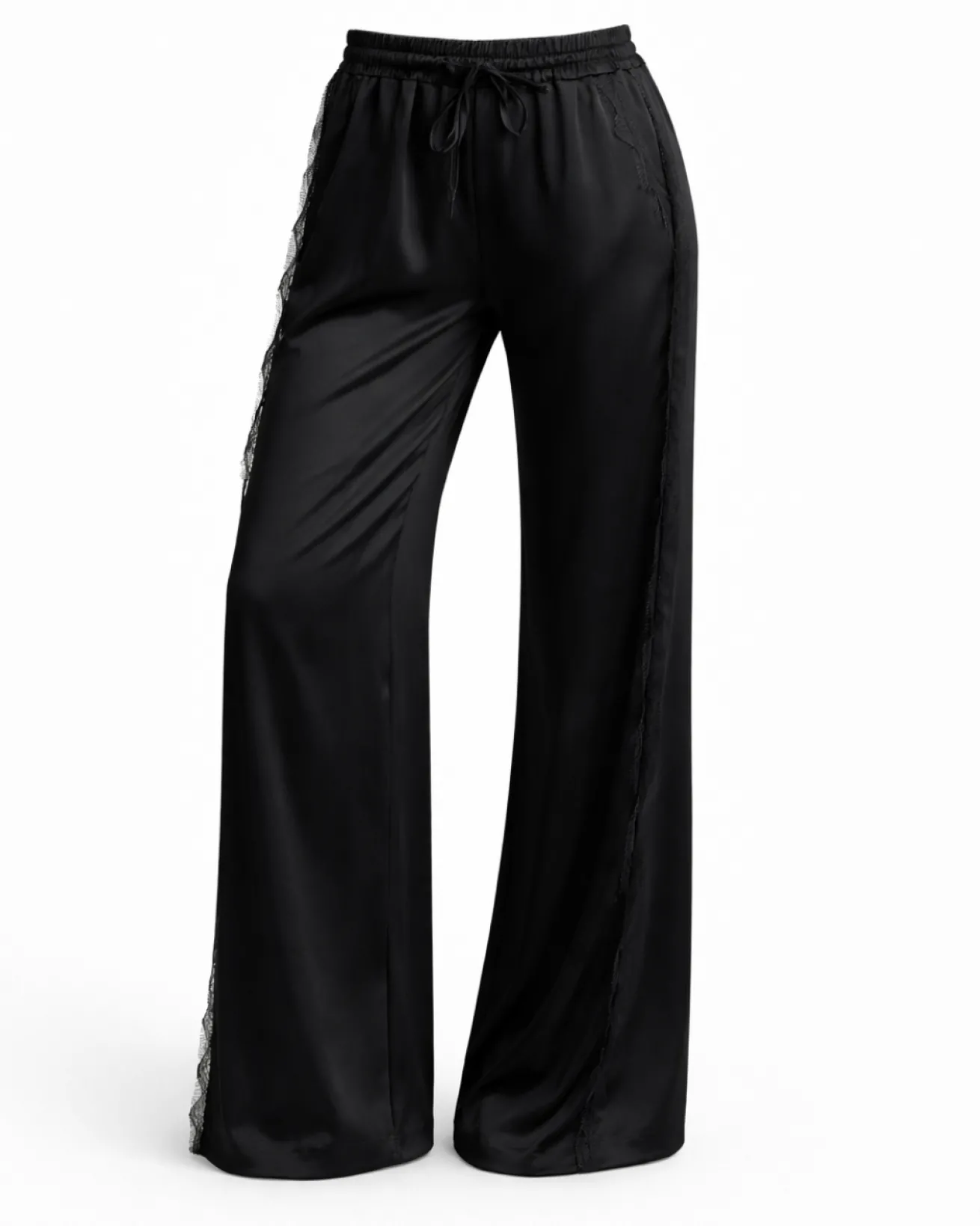 De diskrete blondepaneler langs ydersiden af benene tilfører et sofistikeret touch og gør bukserne perfekte til både hverdagsbrug og mere festlige anledninger. Det lette og bløde materiale giver et smukt fald og gør dem ideelle til styling med både sneakers, sandaler eller hæle.