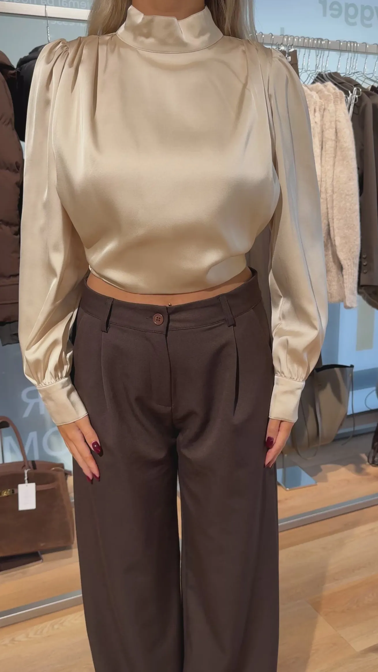 Ana blusen har en åben ryg og lukkes i nakken. Den har knapper på ærmerne som har en ballon form og går ind omkring håndleddet.