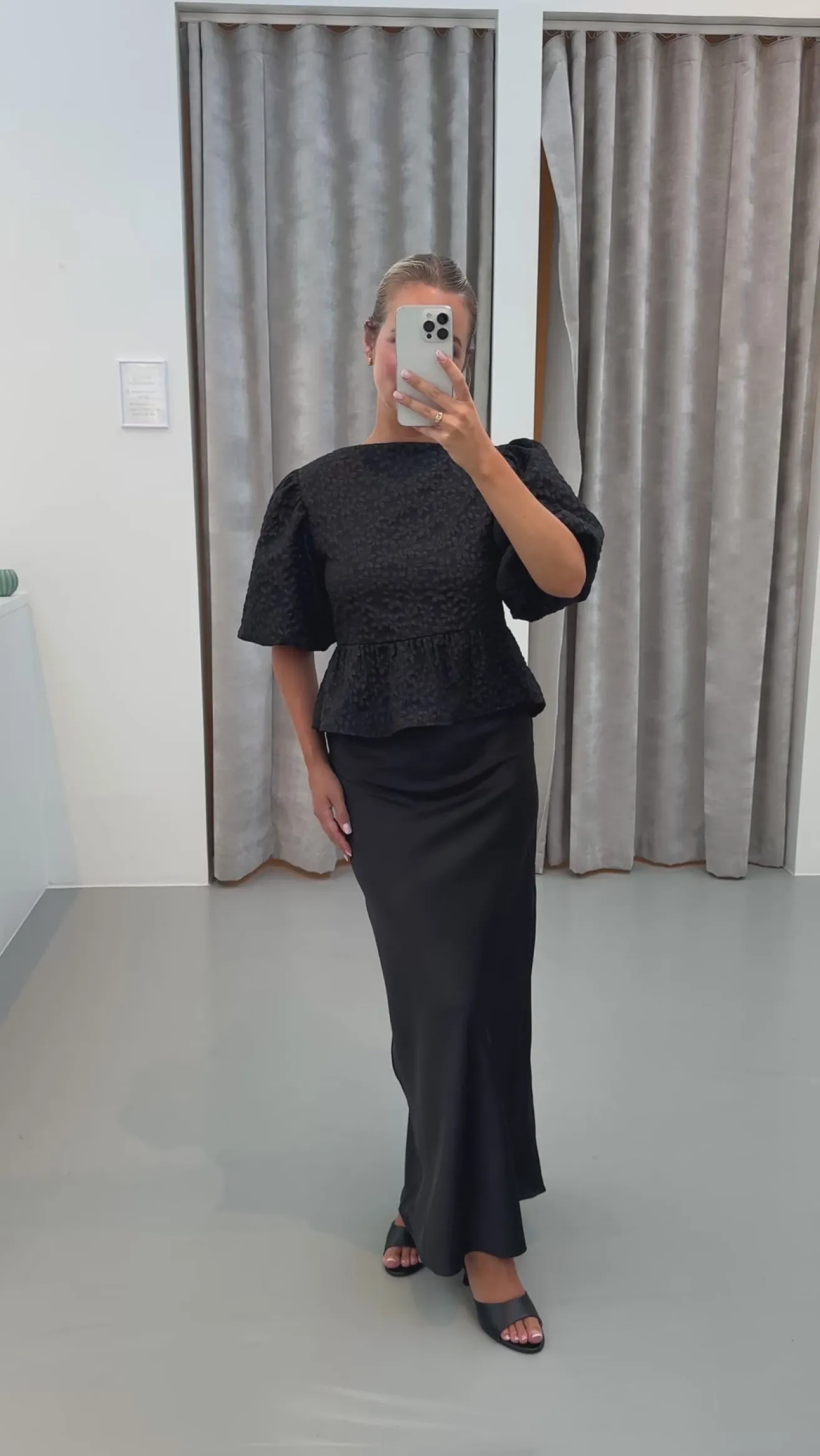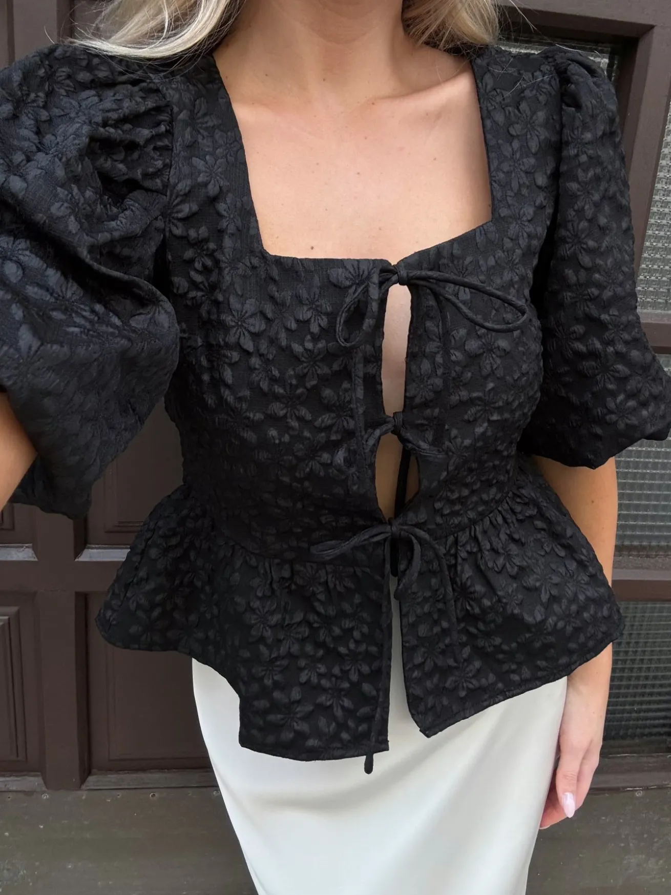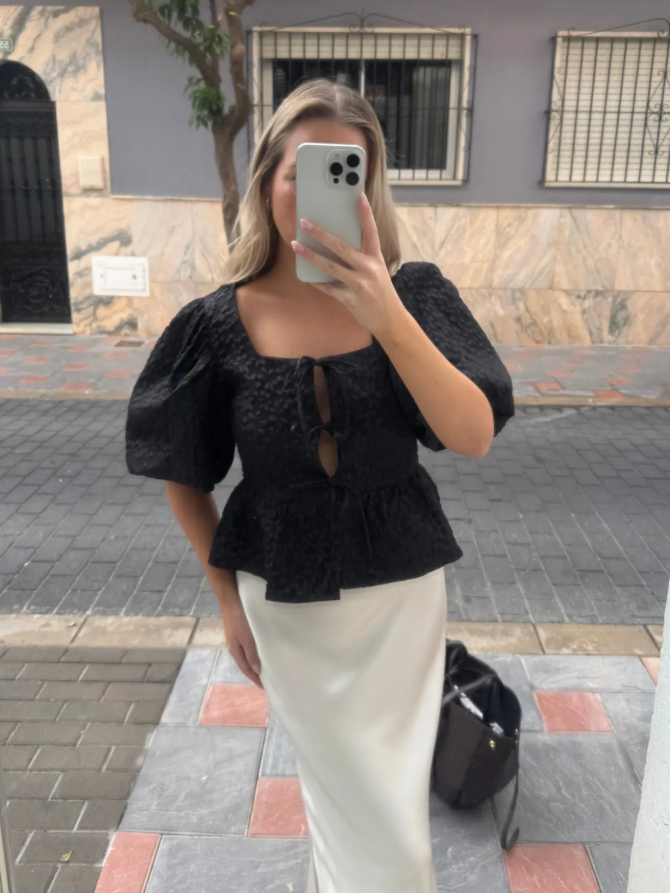 Elena blusen har de fineste puff-ærmer. Den bindes fortil og er den perfekte forårs bluse. Toppen kan vendes, så at du binder den på ryggen. Så giver den et klassisk og mindre åbent look.