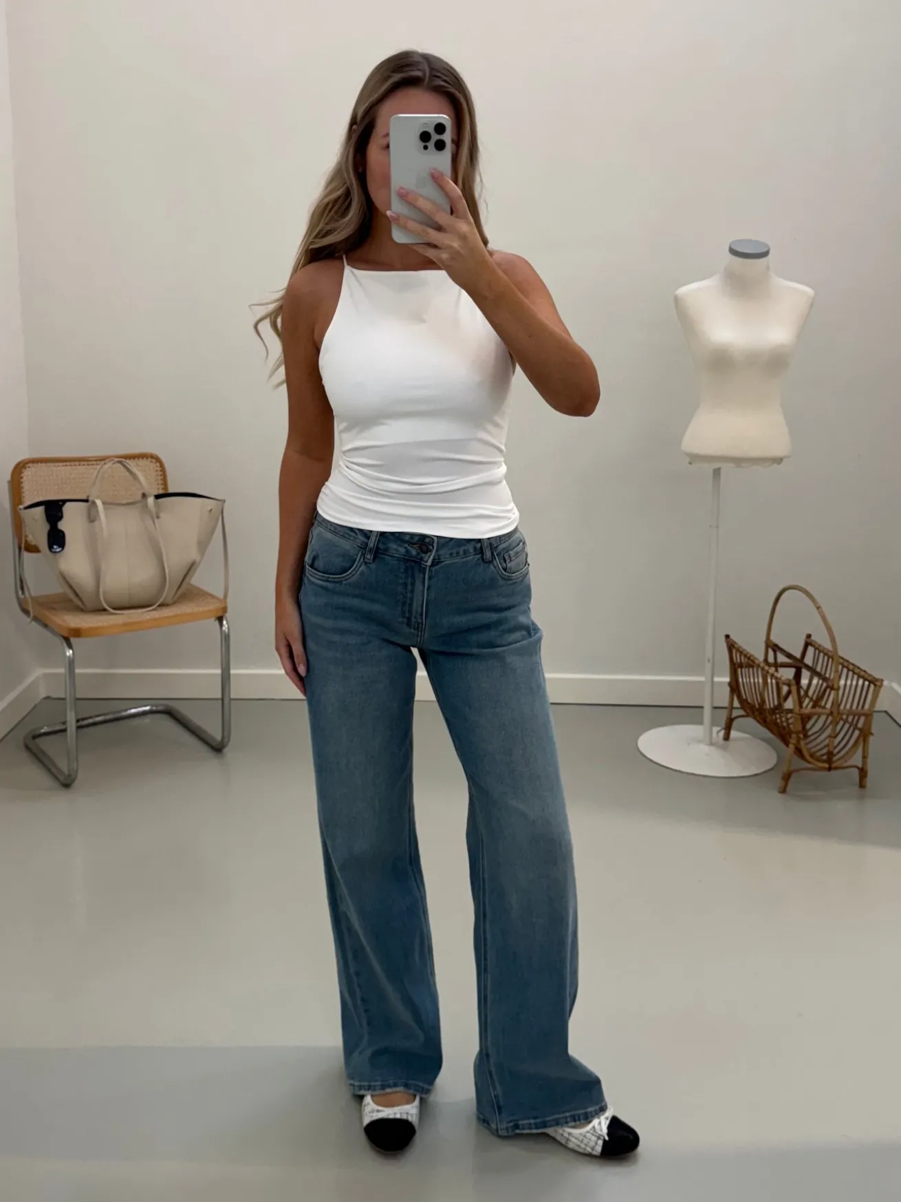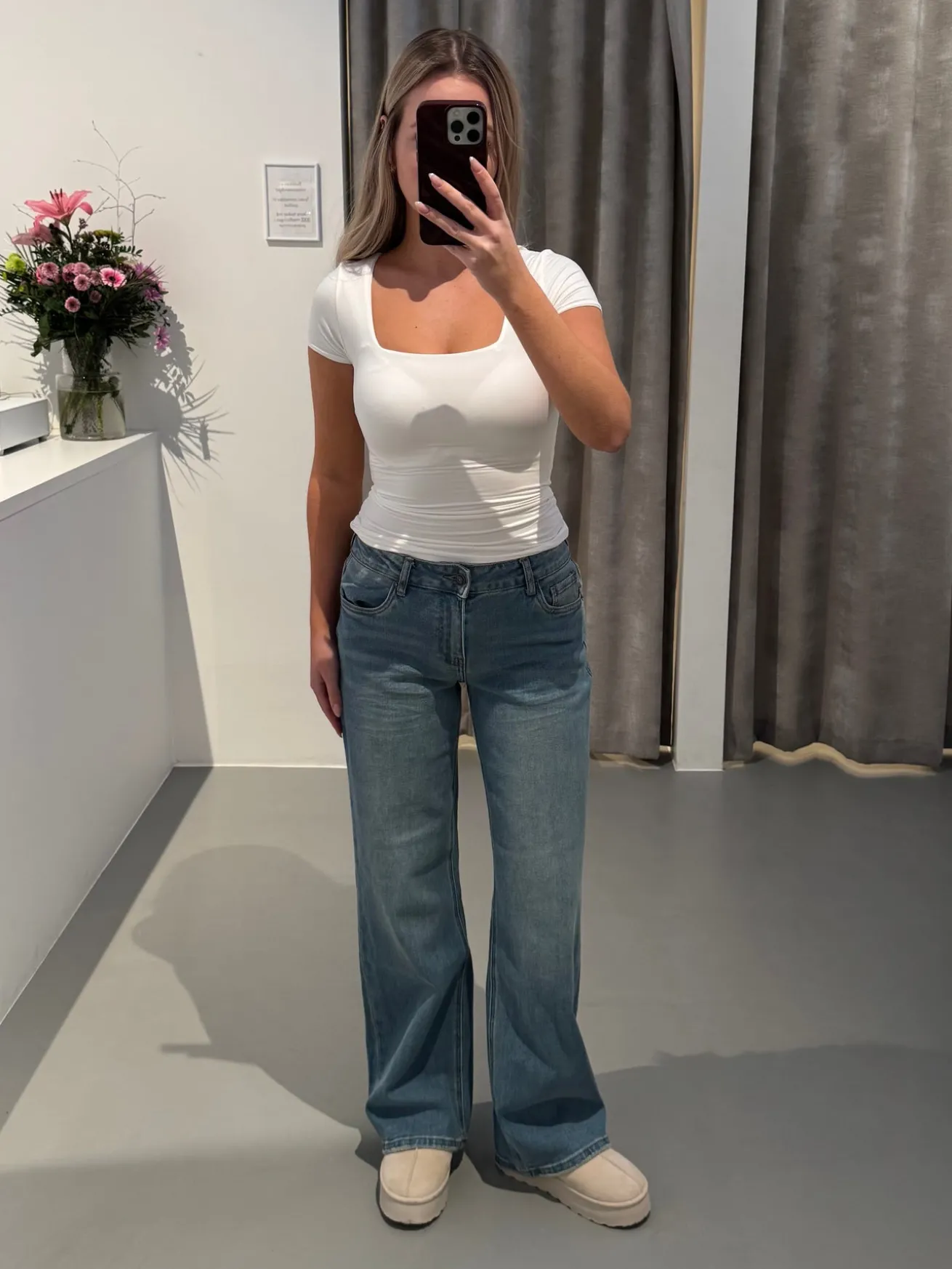 Vores Esther jeans har brede ben. De er lavtaljet og er så behagelige. De er perfekte til hverdag med enten sneakers eller en ballerina.