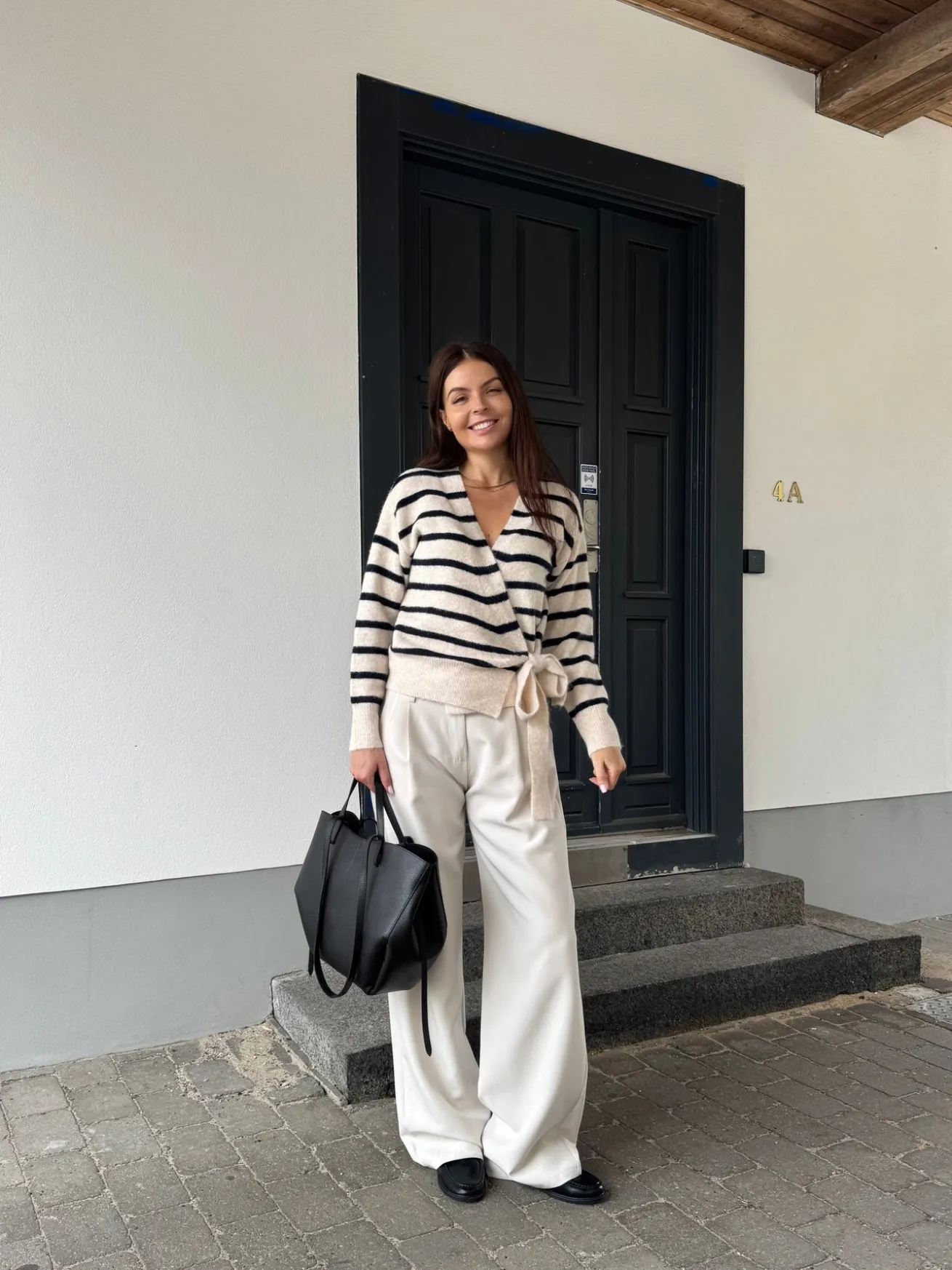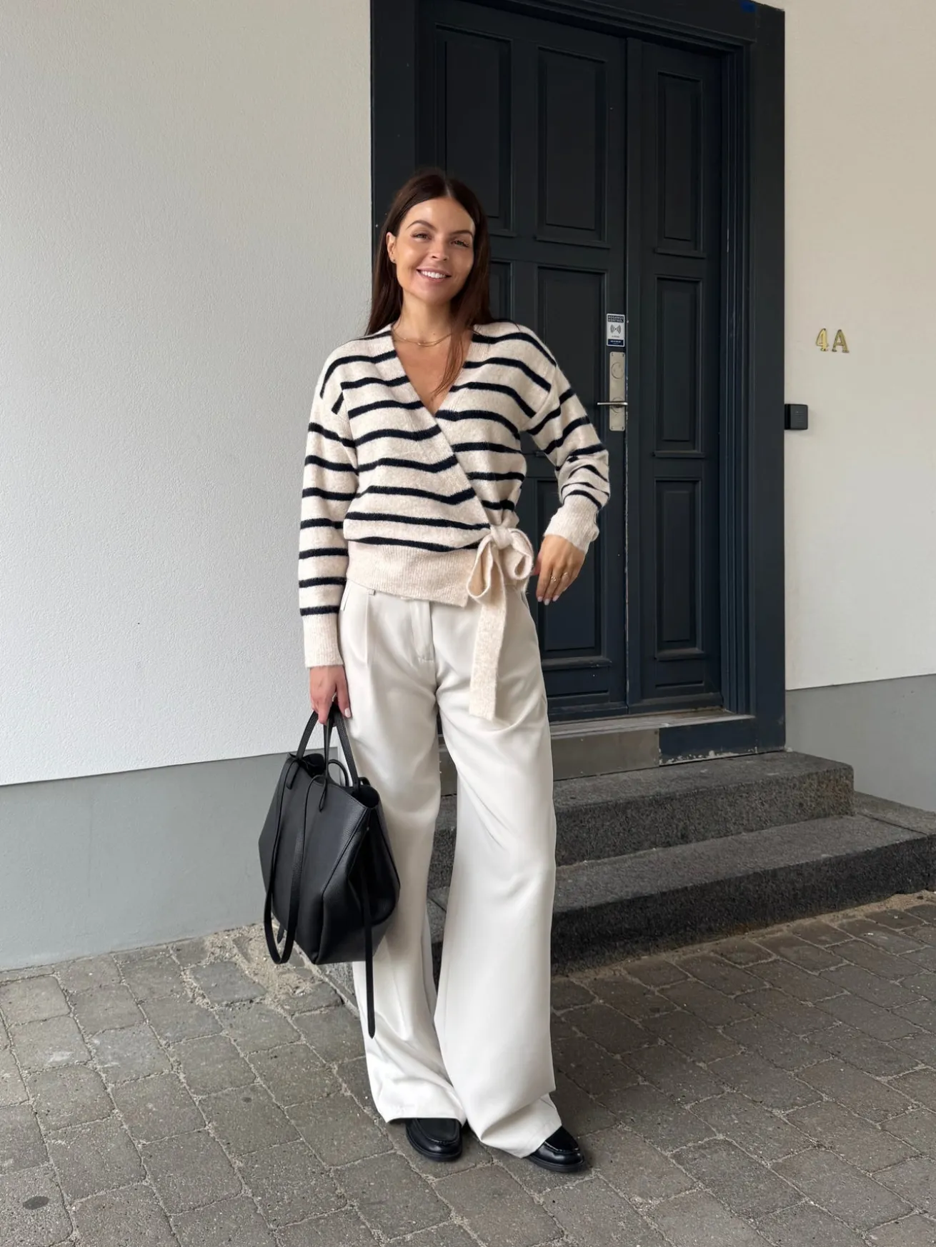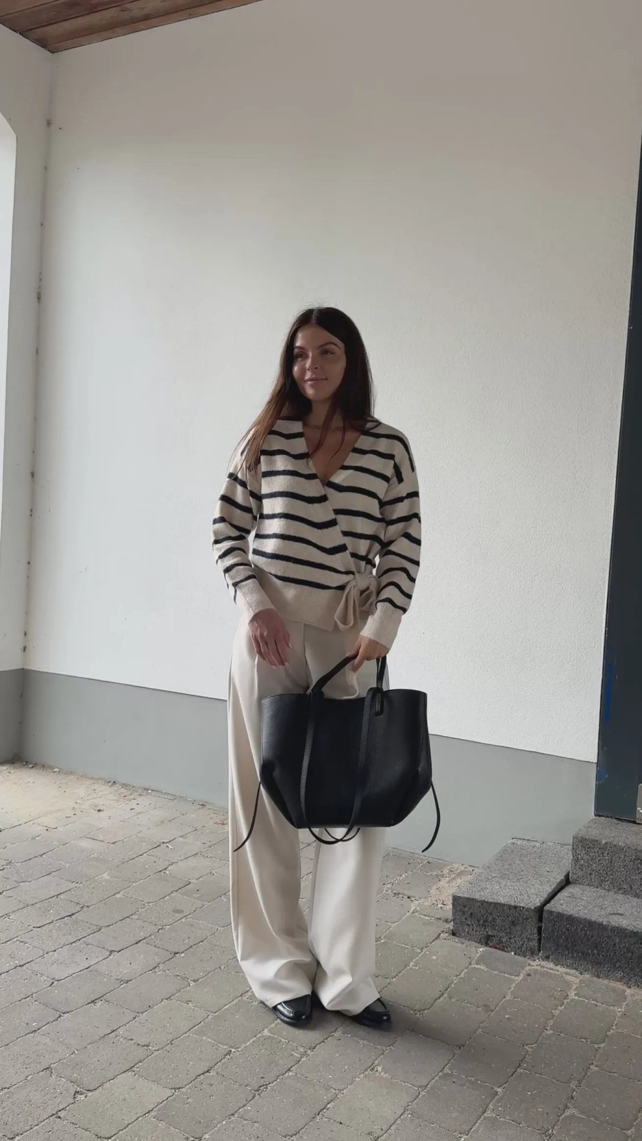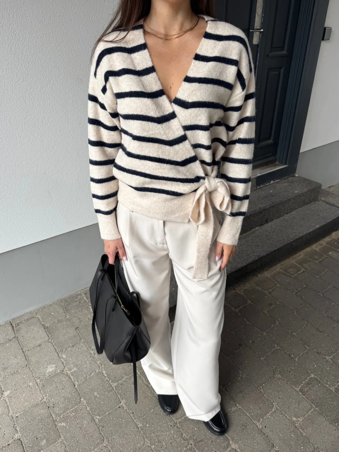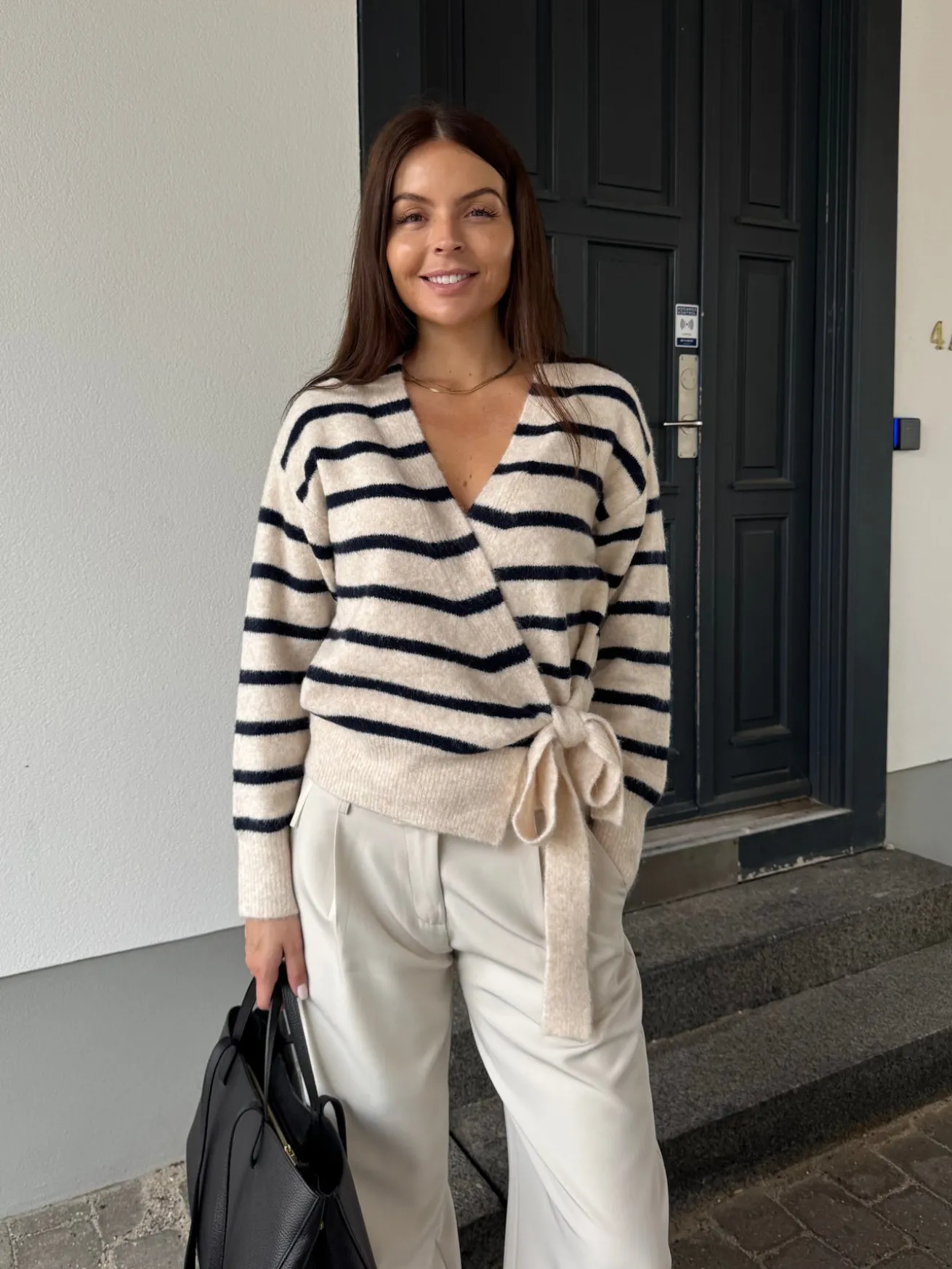 Esther strikken bindes i siden og har en løs pasform. Den har en v-udskæring.