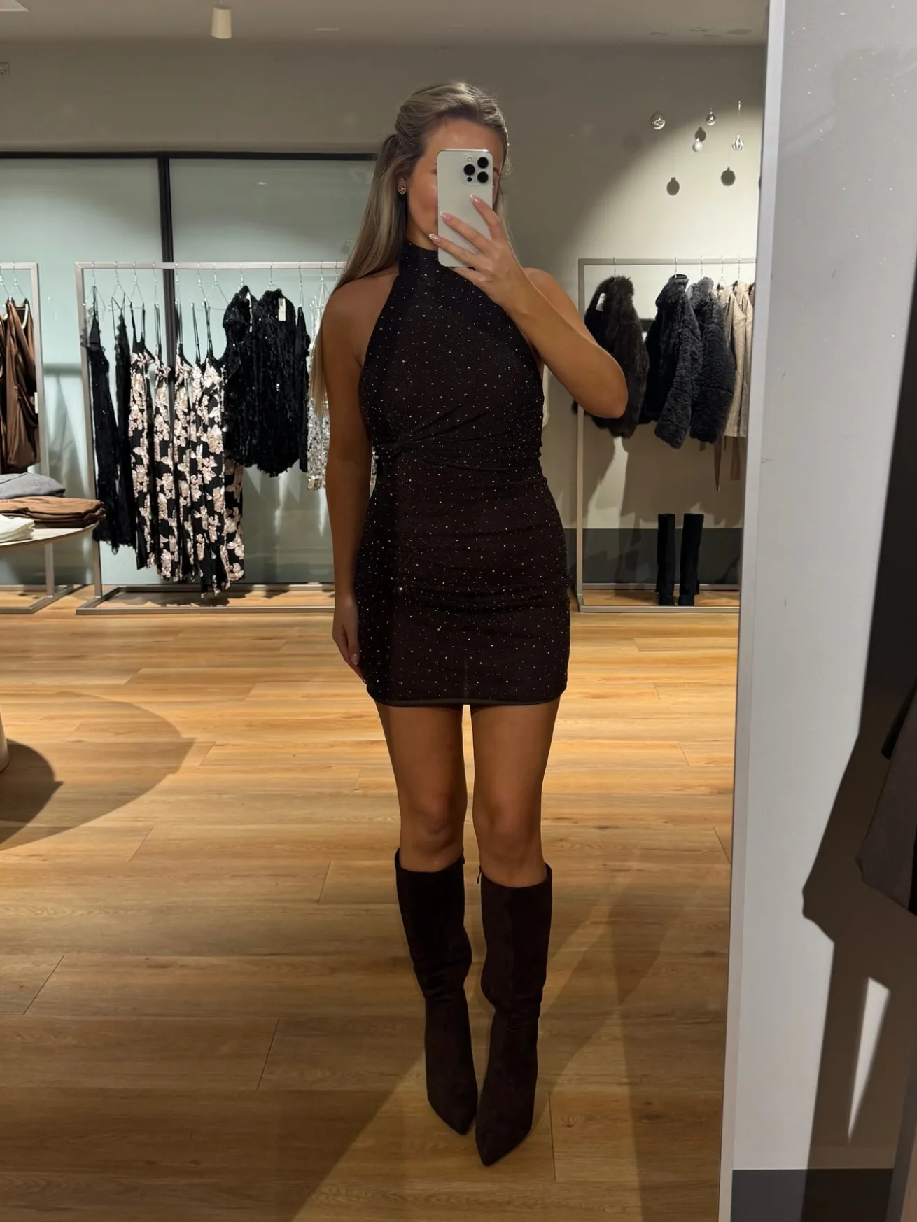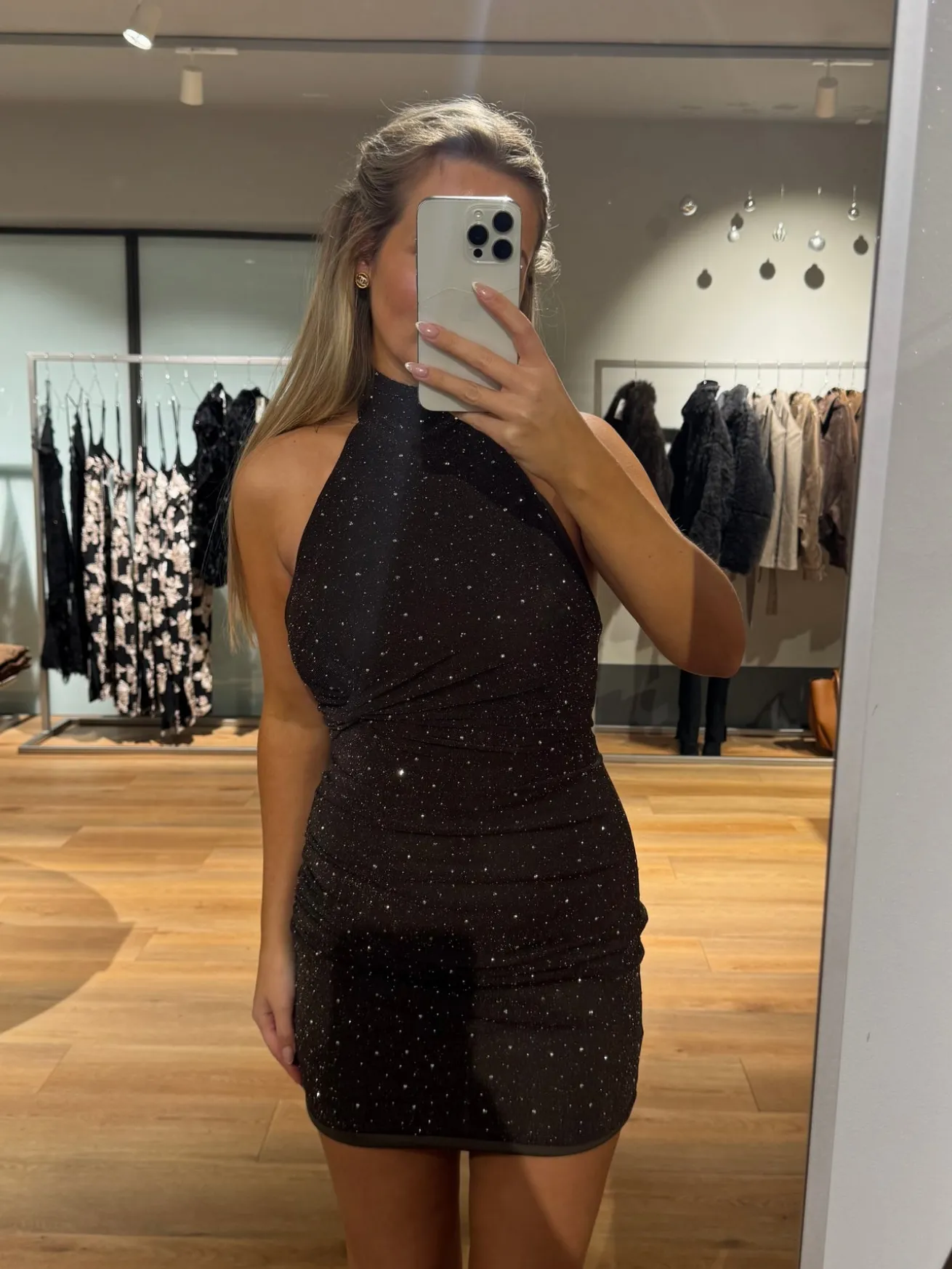 Denne smukke glimmer kjole er perfekt til nytåret – den bindes i nakken og er åben på ryggen. Kjolen er kort og tætsiddende.
