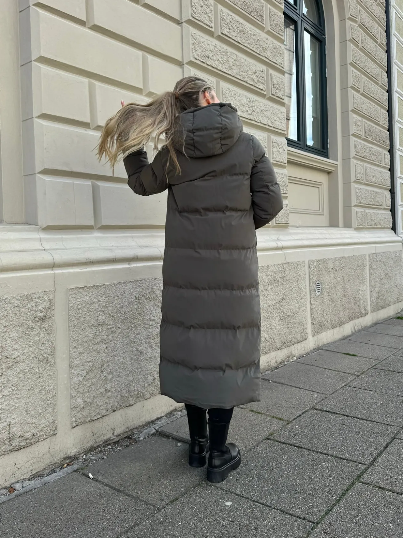 Gianna jakken er skøn at have på den er lang og har en ekstra brystlomme, den har en høj hals og hætte.