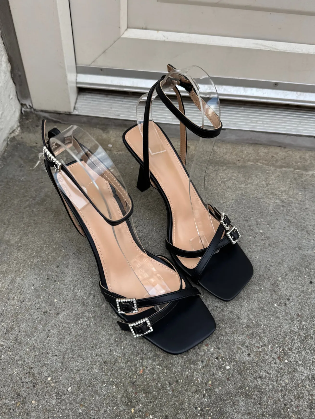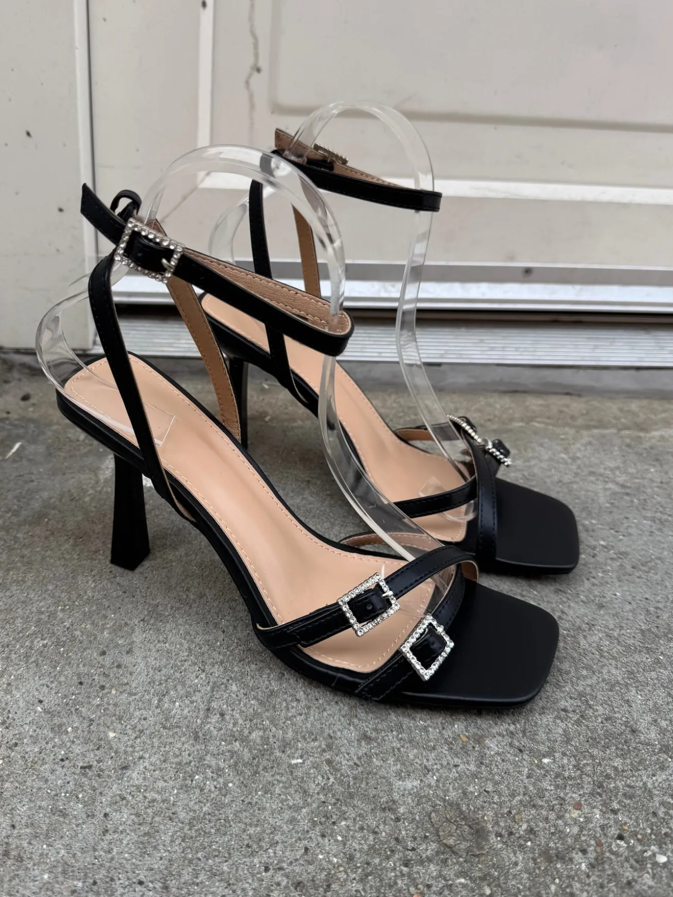 Lucia stiletterne går op omkring ankel of spændes der. De har en glimmer spænde omkring anklen, men også foran omkring fødderne.