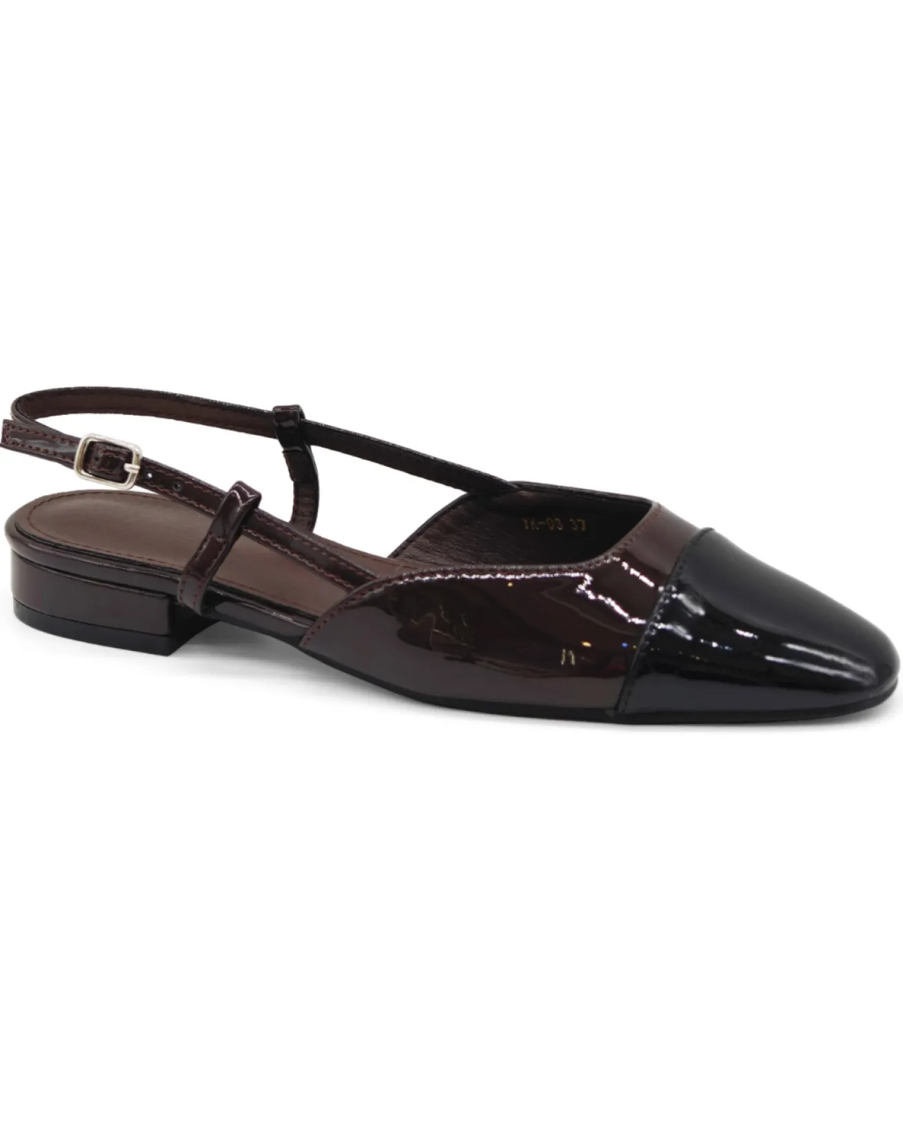 Disse mørkebrune slingback-sko i lak har et elegant og tidløst design med spids snude og lav hæl. Den blanke finish giver et sofistikeret udtryk, mens den justerbare rem sikrer en god pasform og komfort hele dagen. Skoene er perfekte til både arbejde og fest og kan nemt styles med både kjoler, bukser og nederdele. Et stilfuldt valg med fokus på komfort og klassisk elegance.