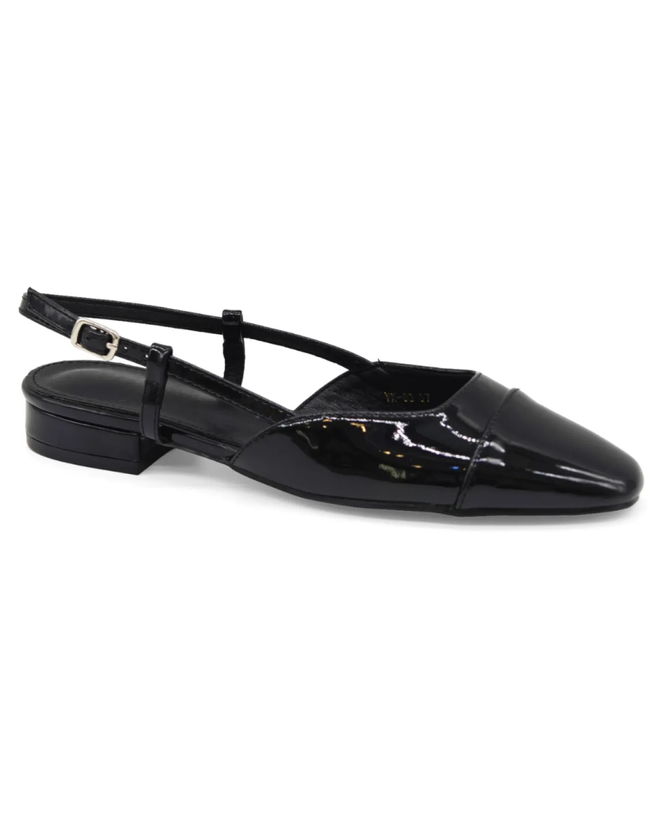 Disse sorte slingback-sko i lak har et elegant og tidløst design med spids snude og lav hæl. Den blanke finish giver et sofistikeret udtryk, mens den justerbare rem sikrer en god pasform og komfort hele dagen. Skoene er perfekte til både arbejde og fest og kan nemt styles med både kjoler, bukser og nederdele. Et stilfuldt valg med fokus på komfort og klassisk elegance.