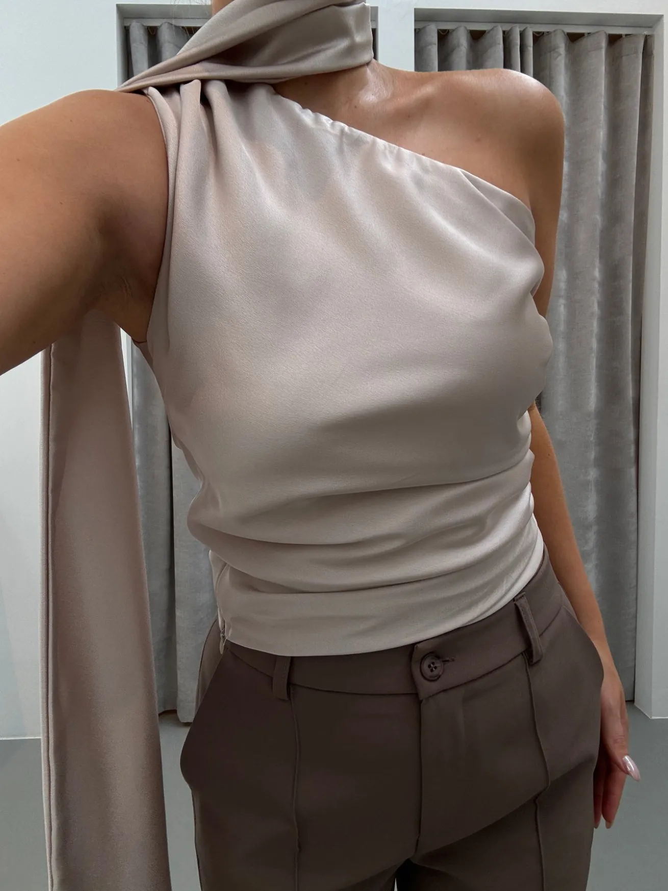 Margot toppen har en fri skulder og et fint stykke stof som går omkring halsen. Den er tætsiddende men har de fineste rynker, som giver blusen lidt mere form.