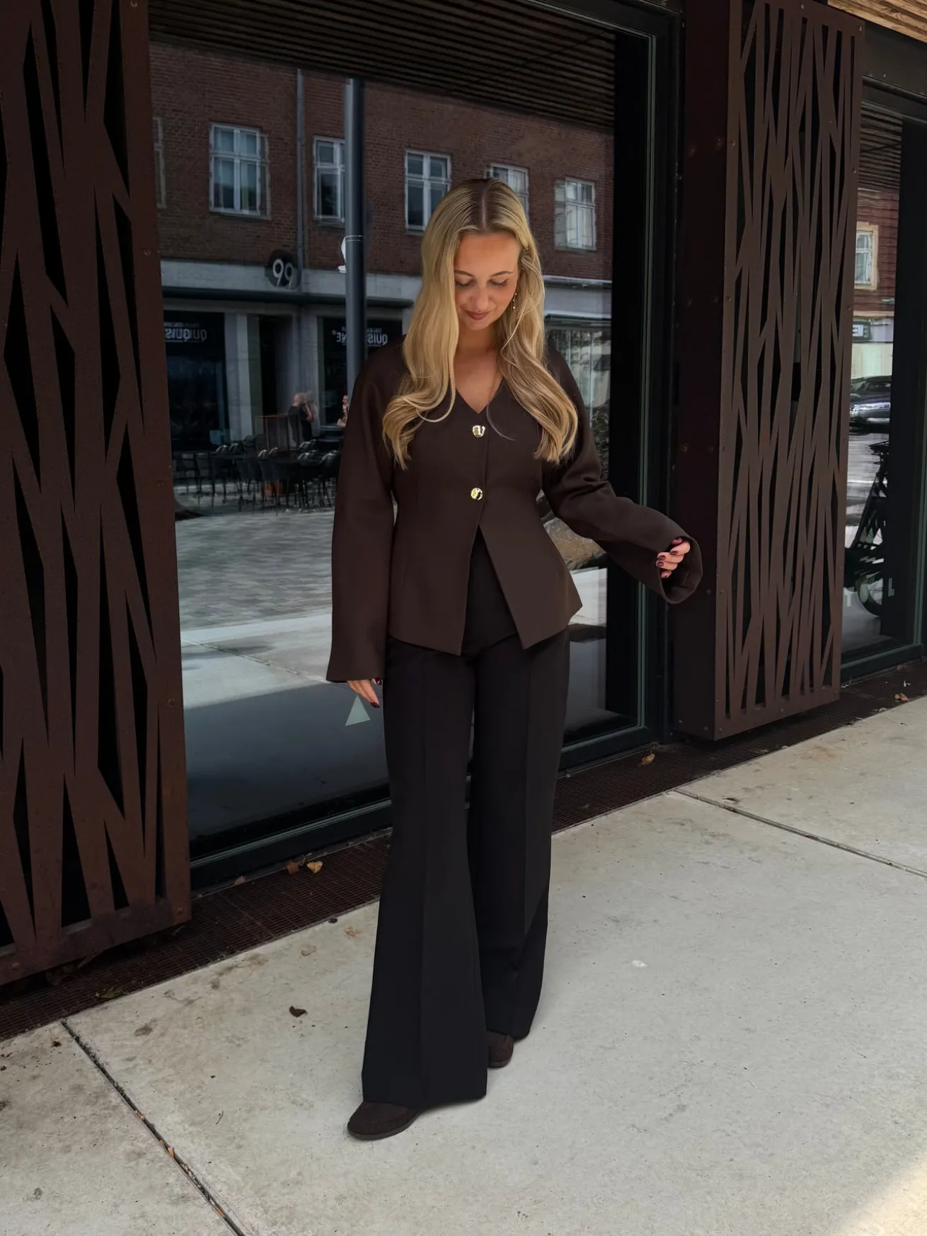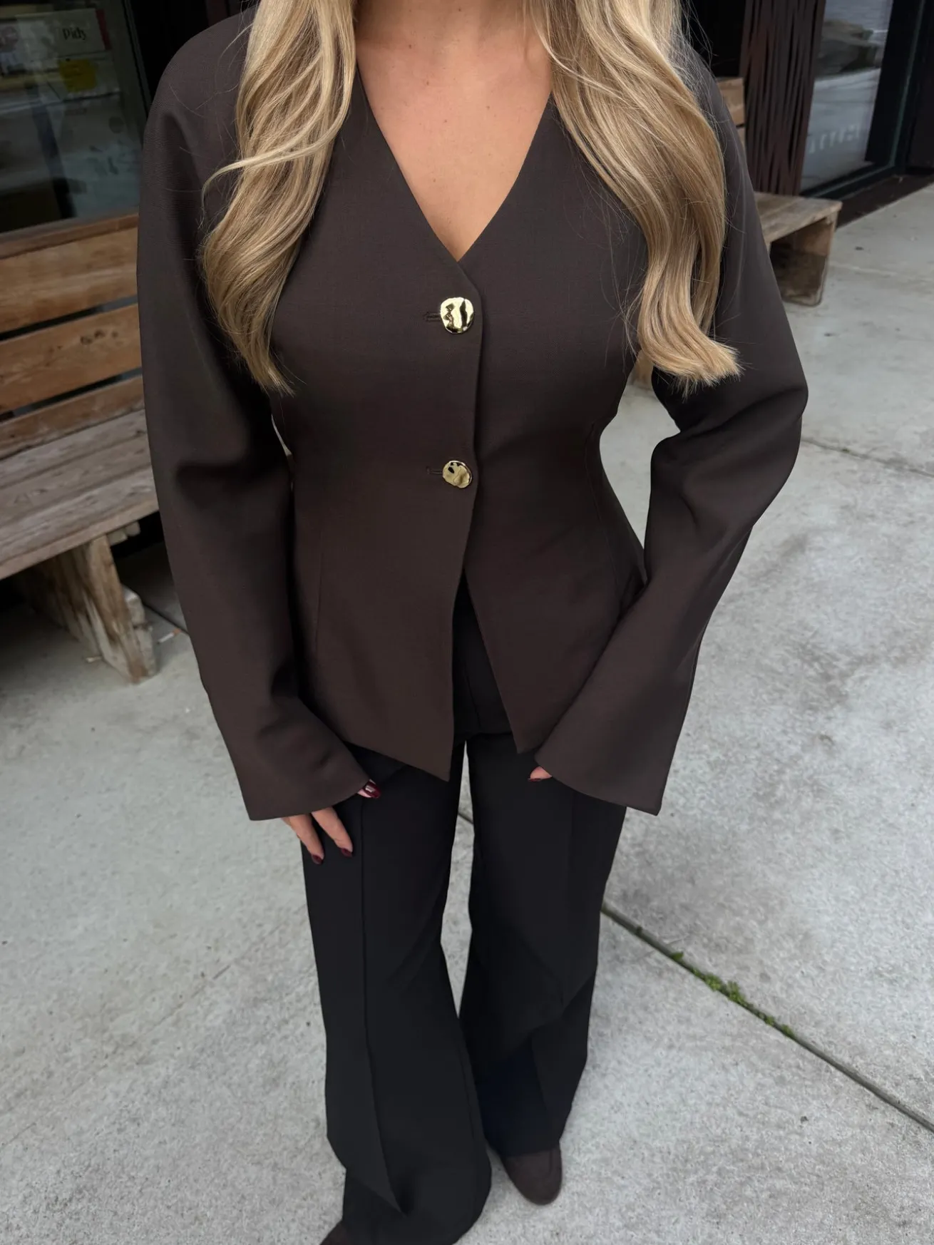 Vores Mia blazer lukkes fortil med 2 knapper. Den går ind i taljen og fremhæver figuren. Blazeren har en v-udskæring og brede ærmer.