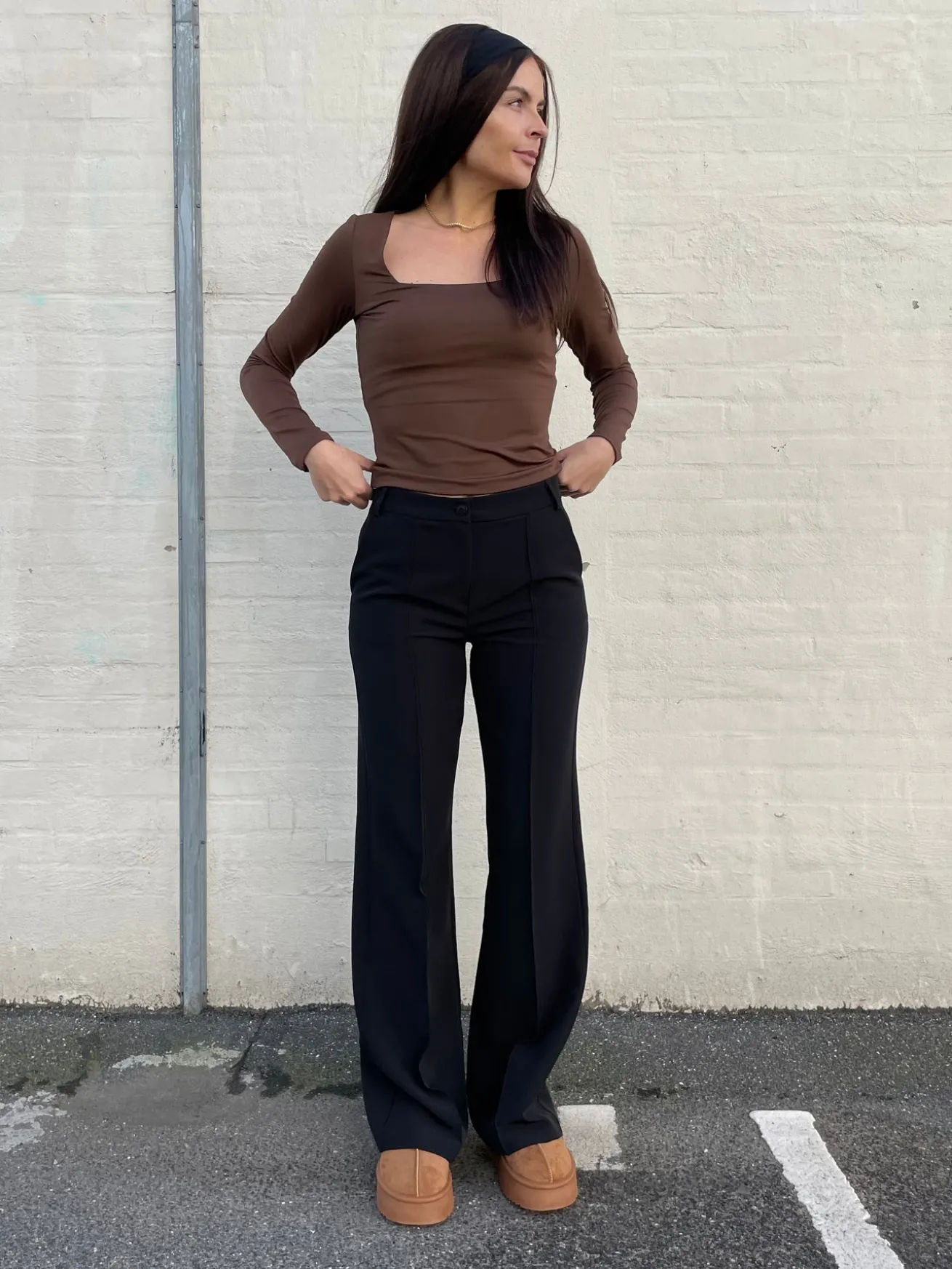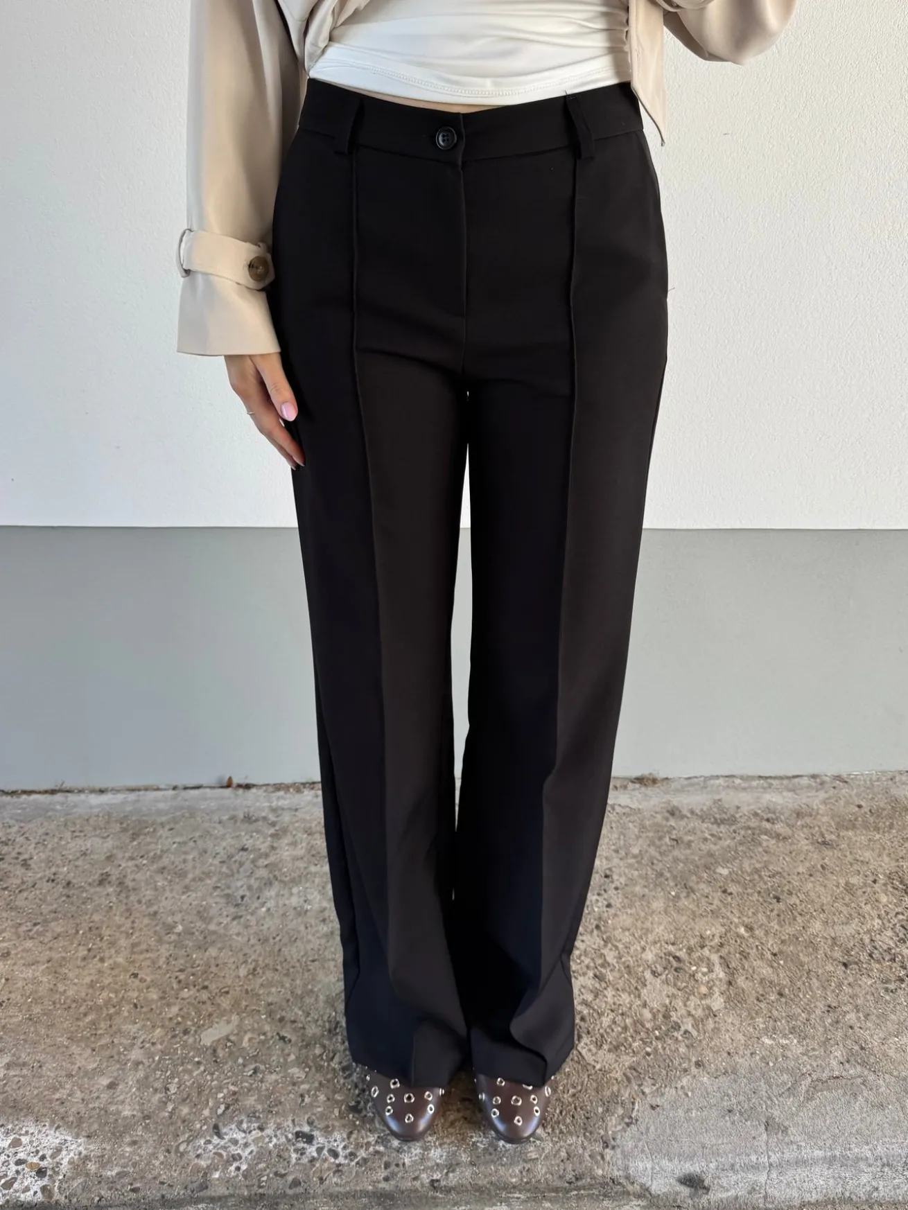 Elegante og strækbare habitbukser. Bukserne har vidde i bunden og spændes med en knap i livet. Styles perfekt med et par sneakers eller stiletter.