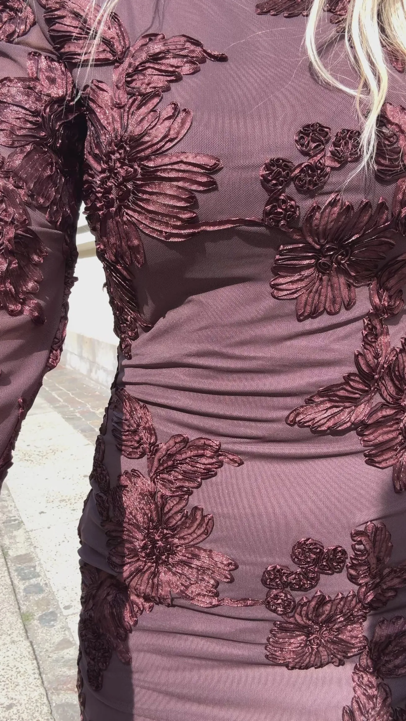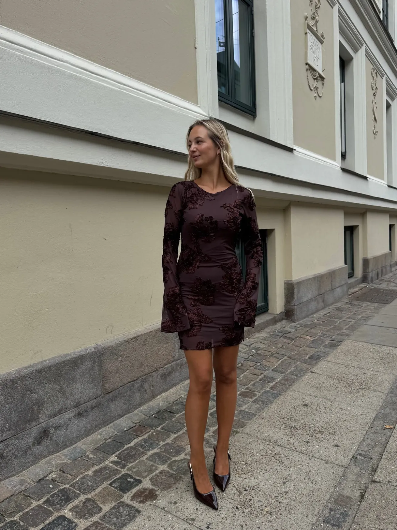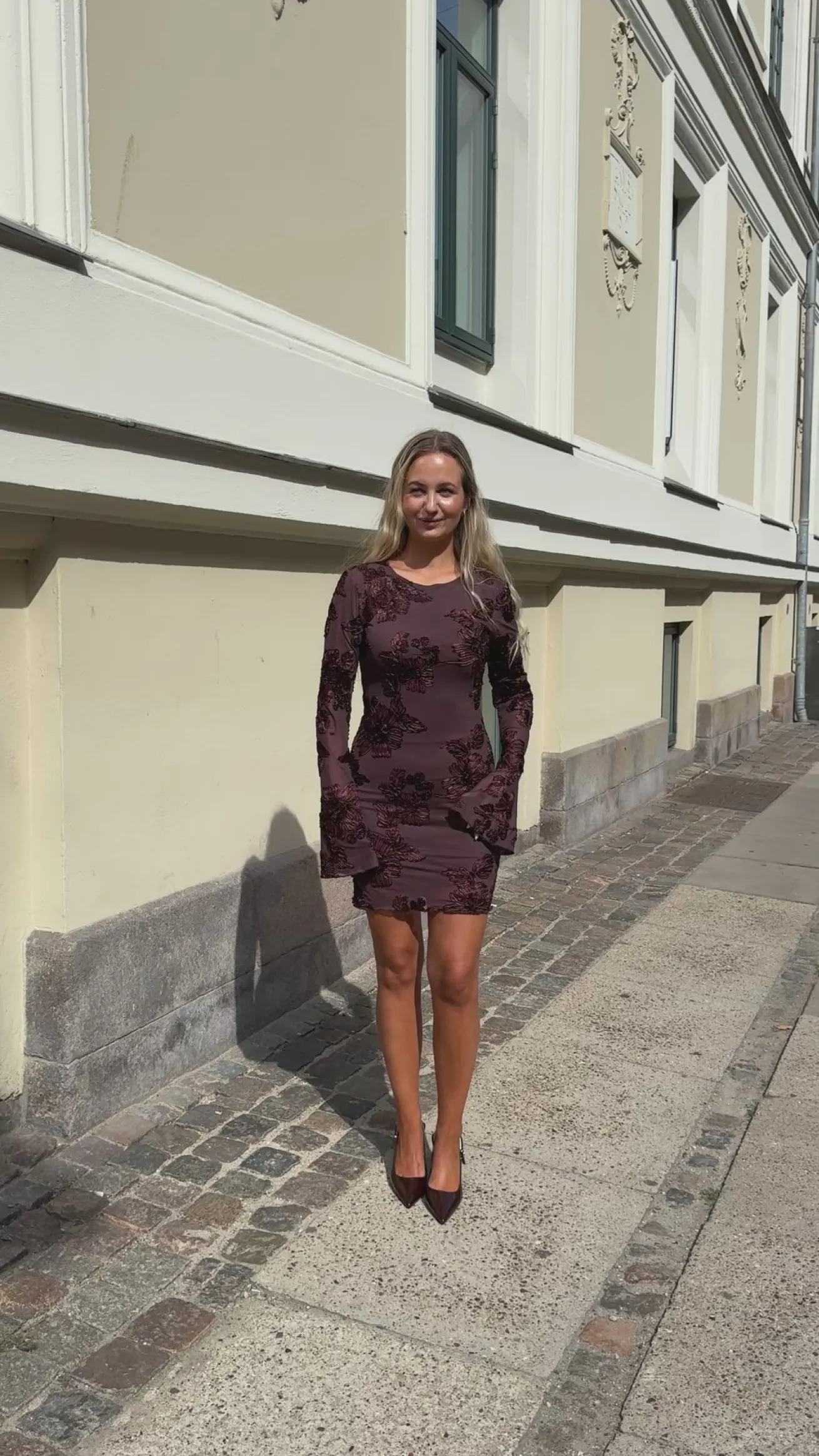 Olivia kjolen har brede ærmer og en rund udskæring. Kjolen har det smukkeste mønster i form af blomster på kjolen og er perfekt til alle årets festligheder.
