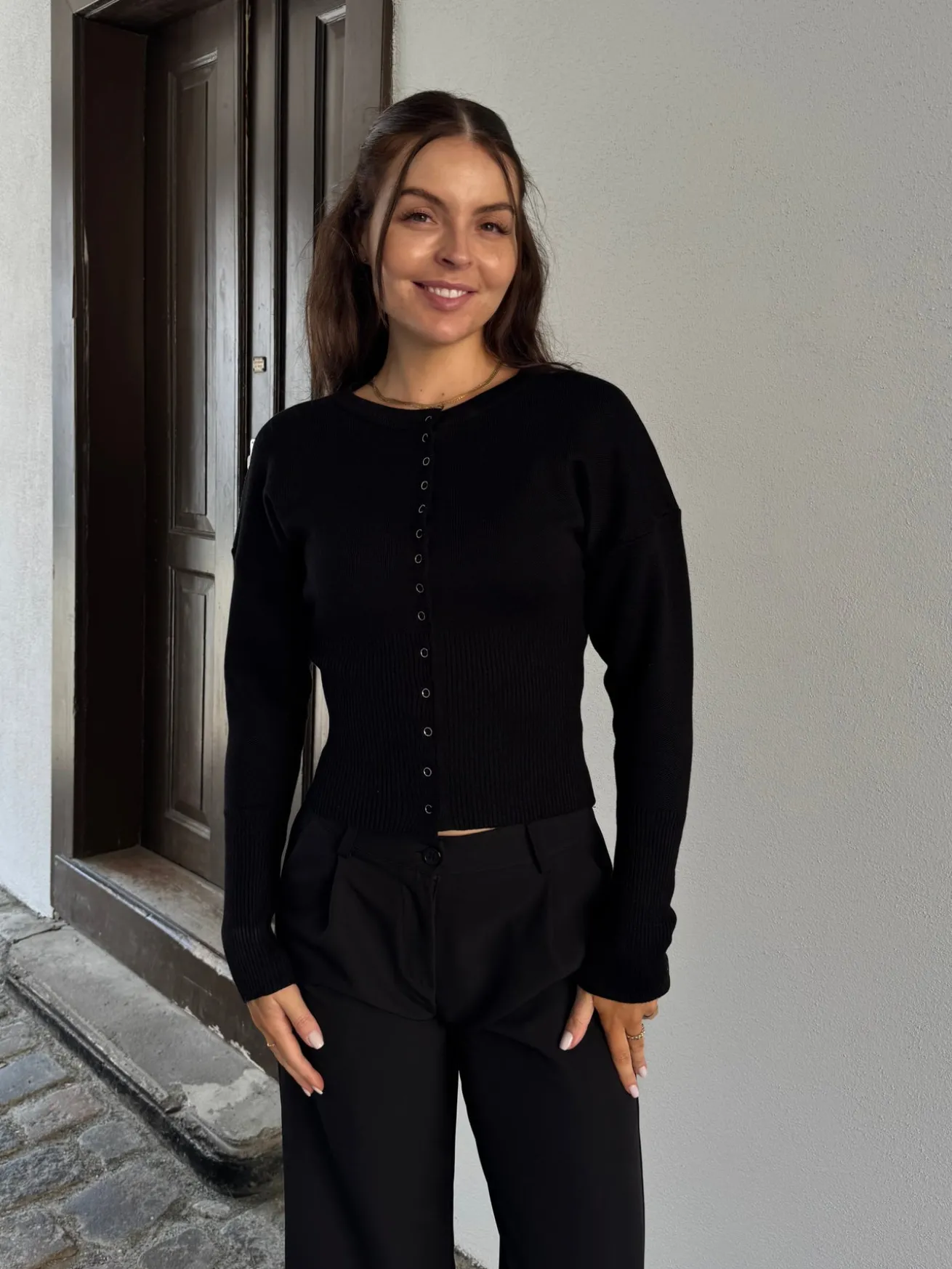 Sabrina cardiganen går ind i taljen, den har en rund udskæring og går ind i ærmerne. Ærmerne har de fineste knapper.