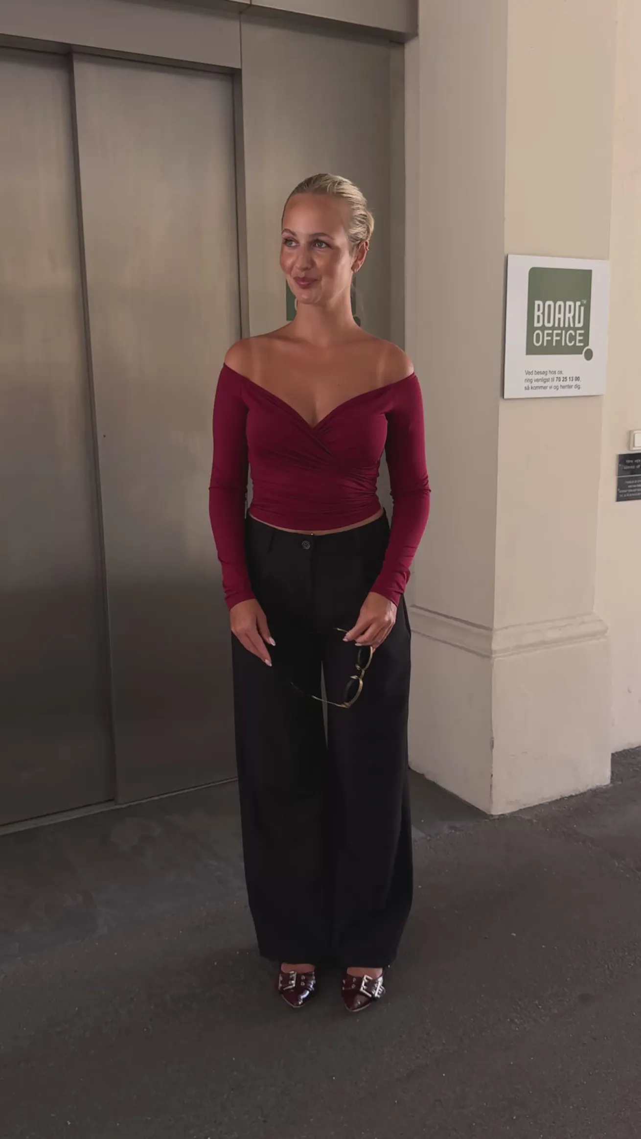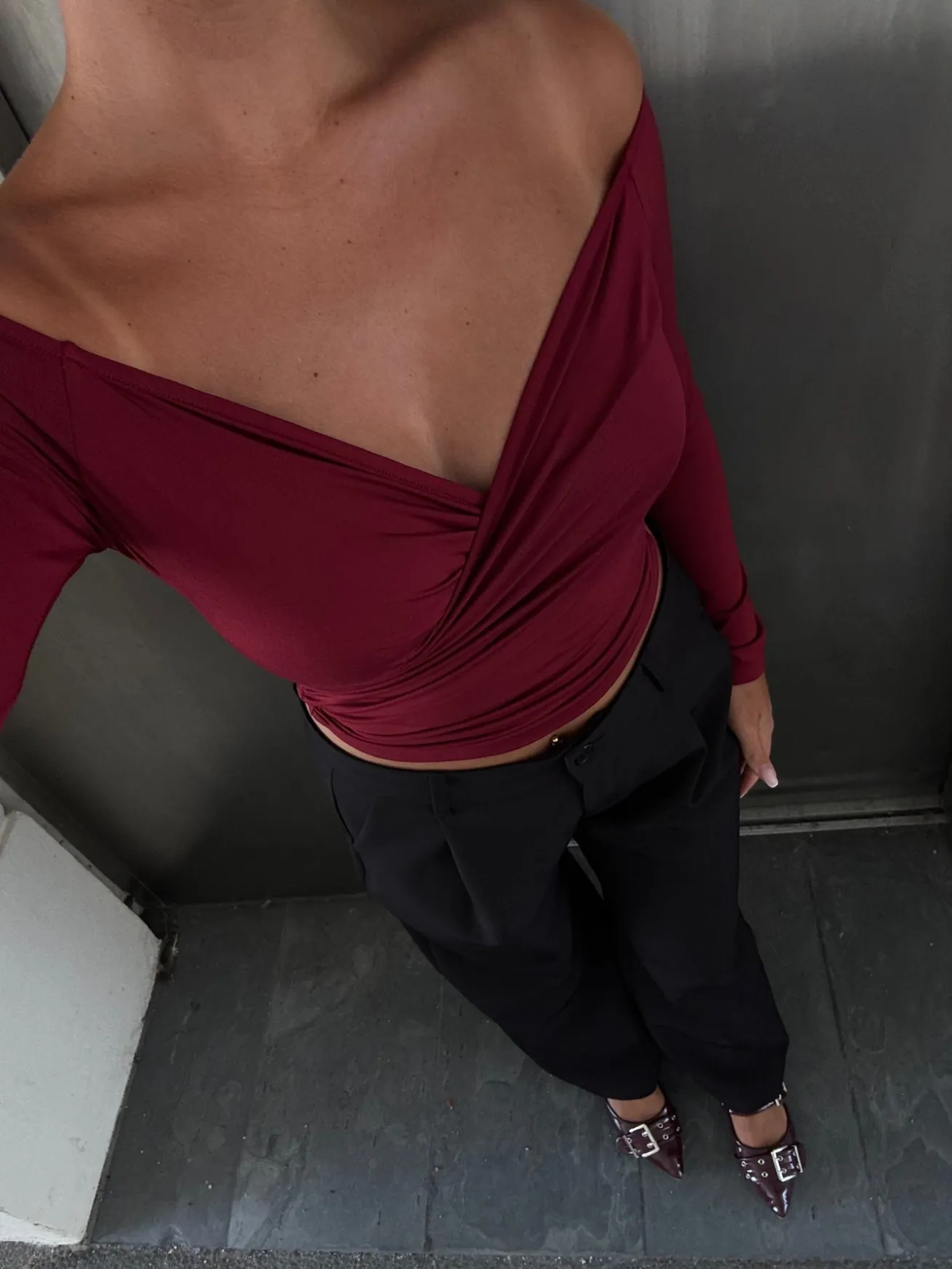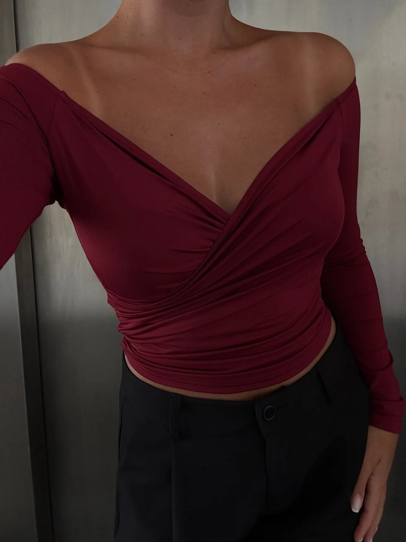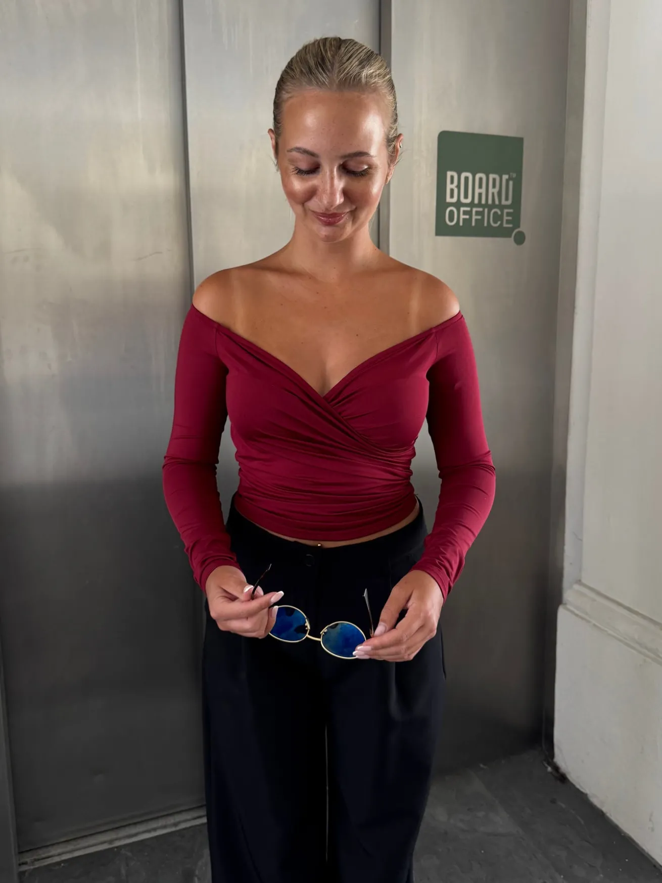 Sienna blusen har et wrap-cut og er strækbar. Blusen kan sættes både off-shoulder og på skulderen. Den fremhæver figuren og er behagelig at have på.