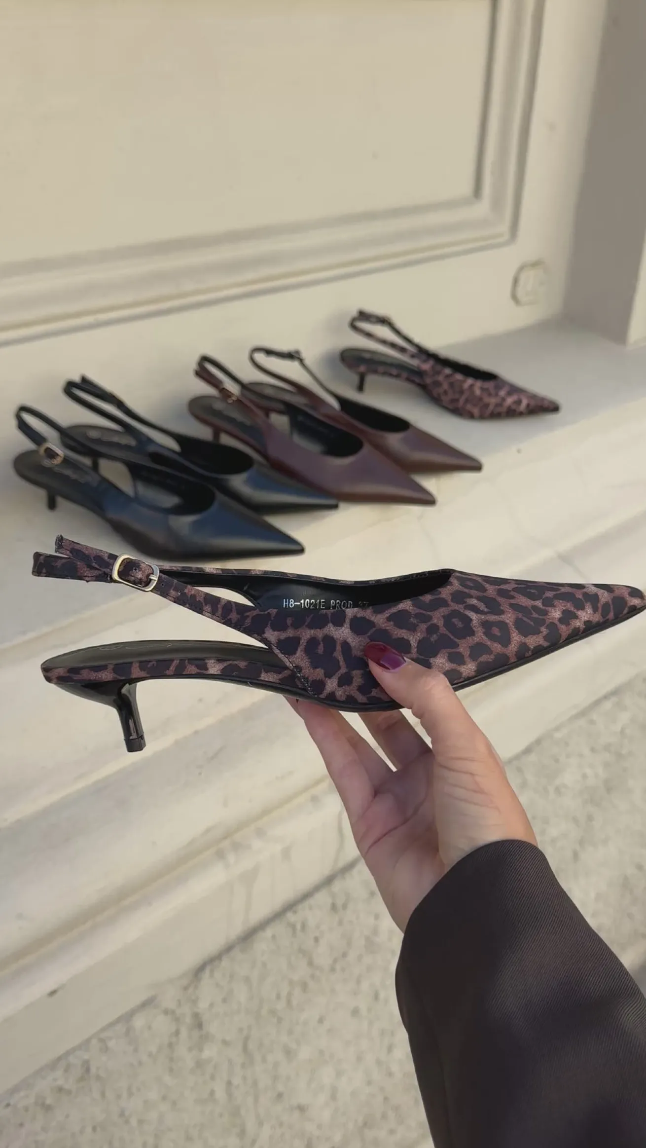 Sofia stiletterne har en spids snude og det fineste leopard look. De har en rem bagtil som kan justeres efter behov.