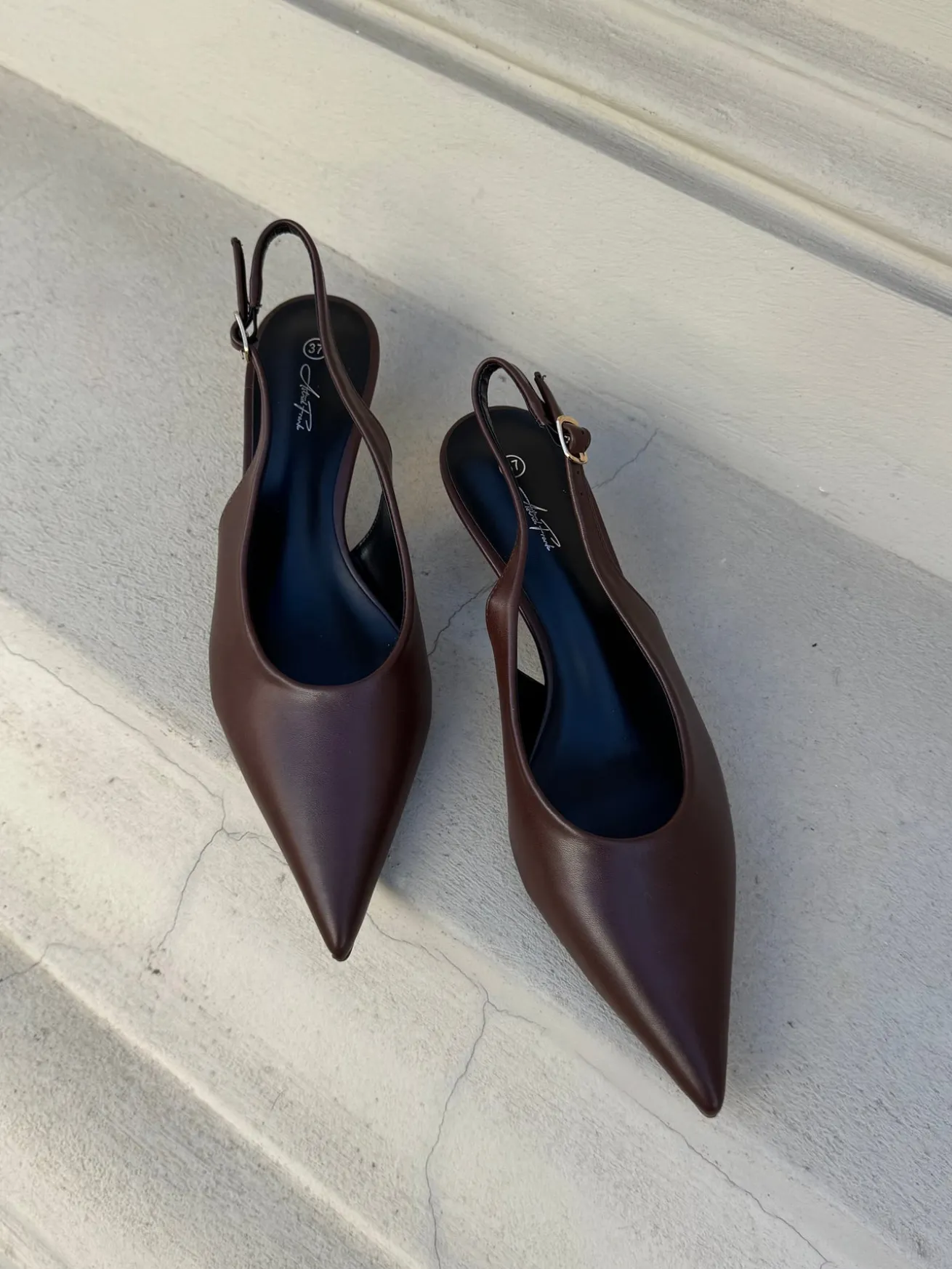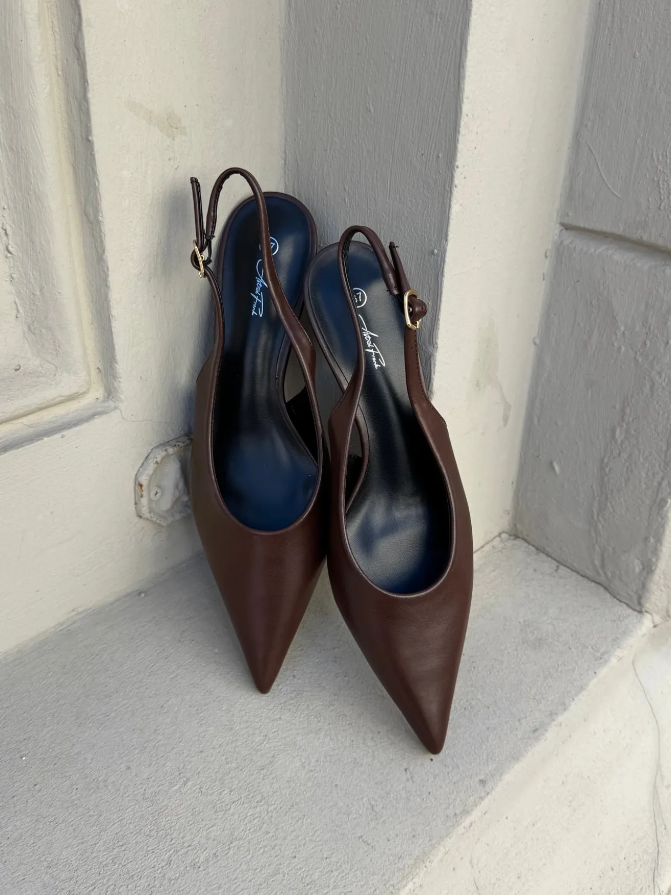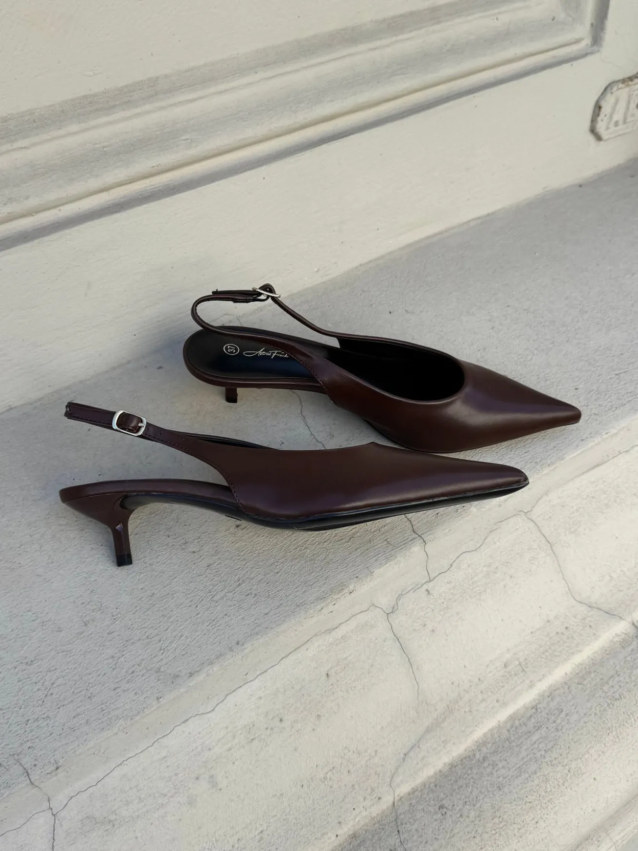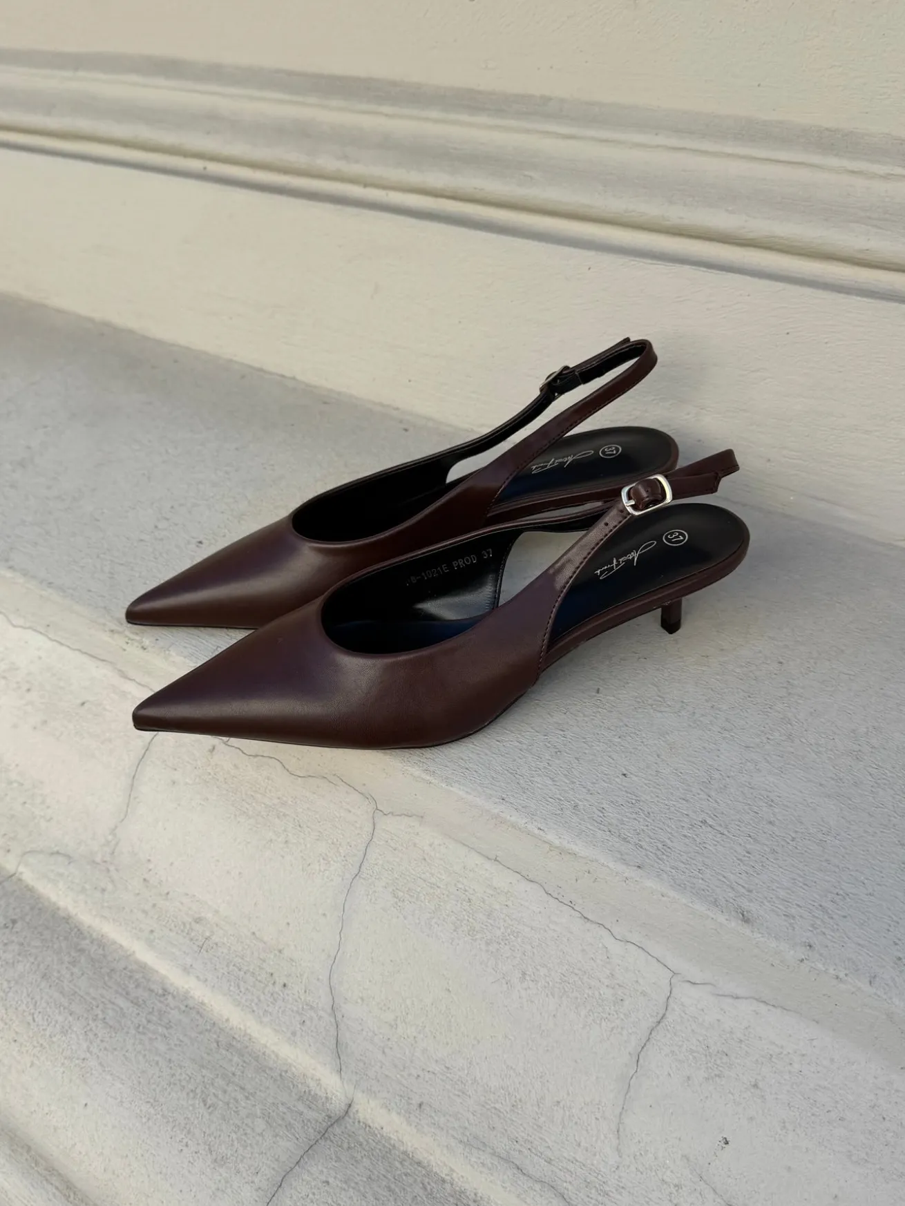 Sofia stiletterne har en spids snude og det fineste læder-look. De har en rem bagtil som kan justeres efter behov.