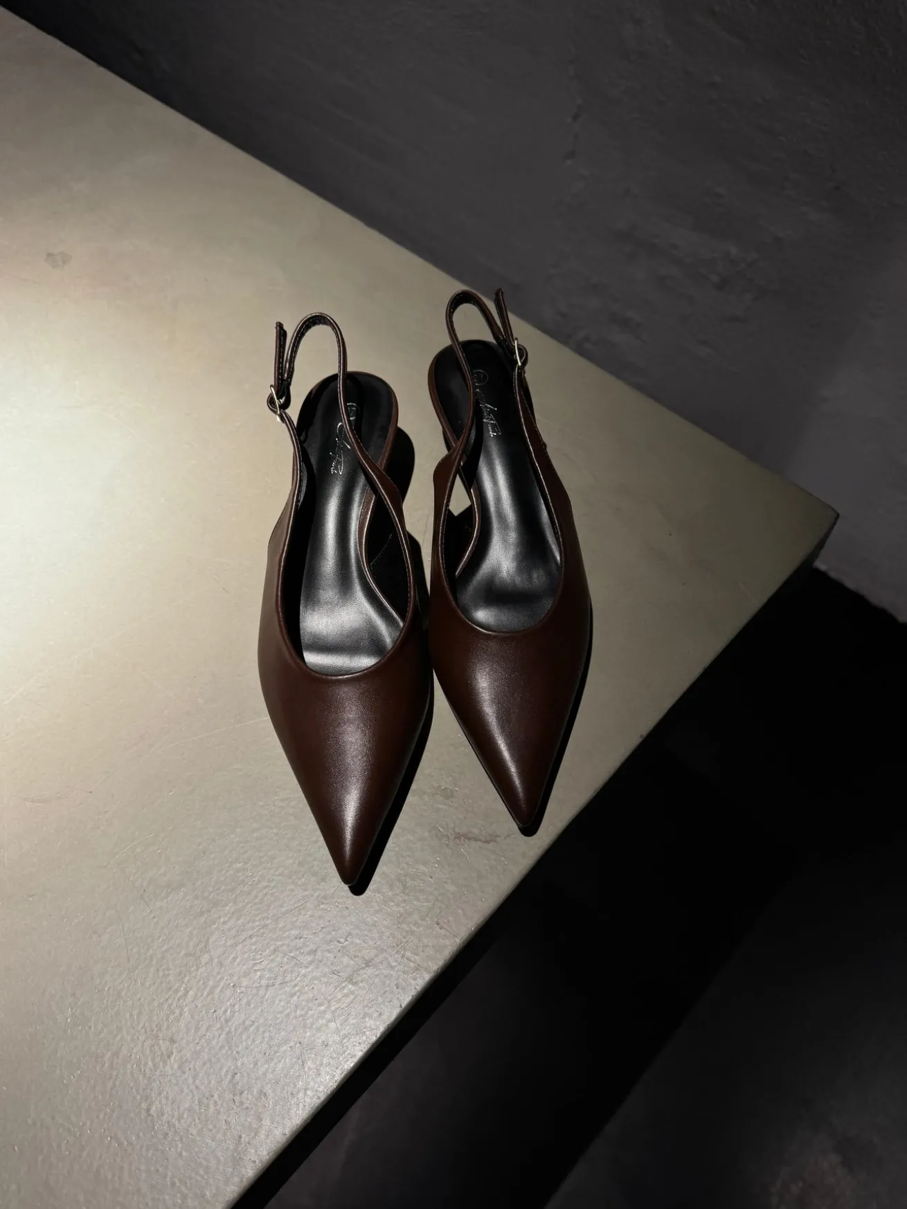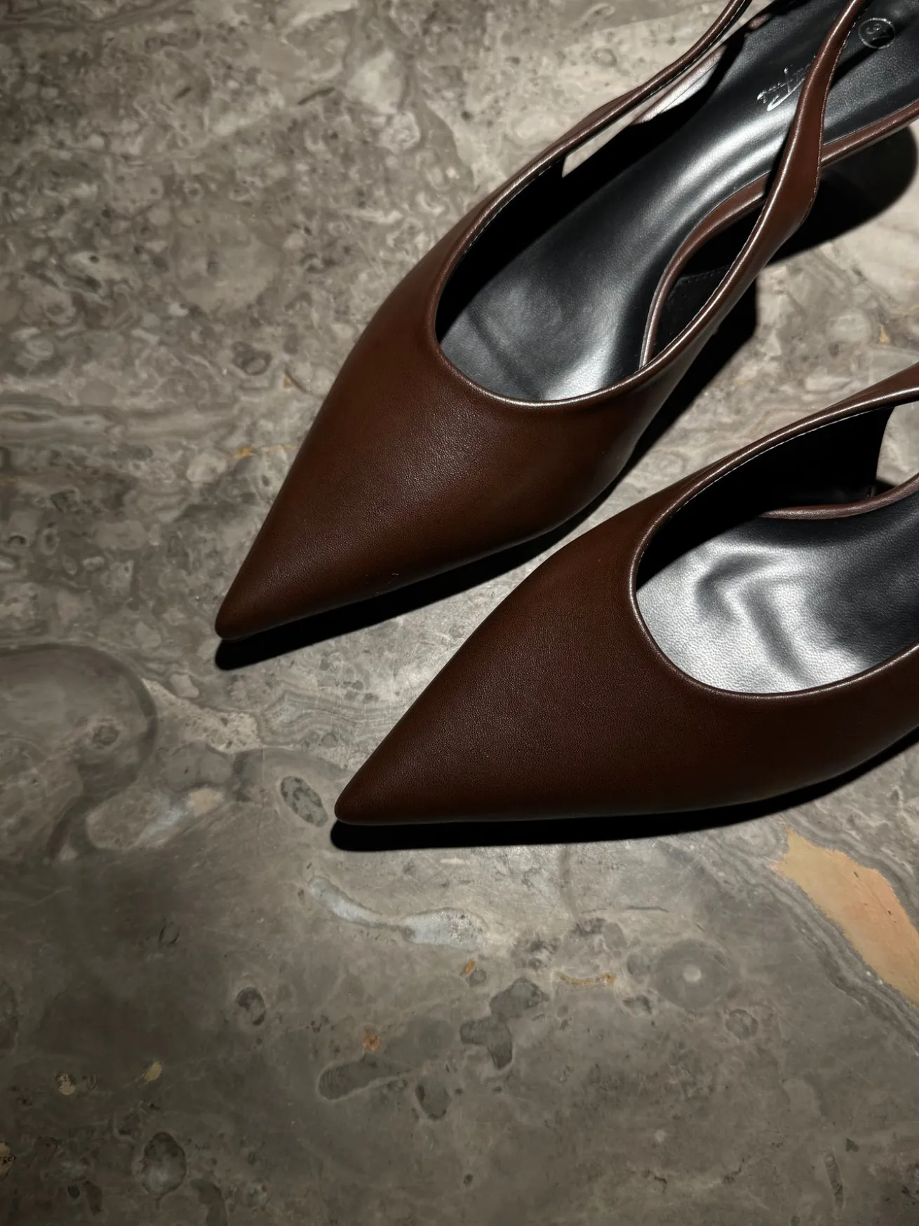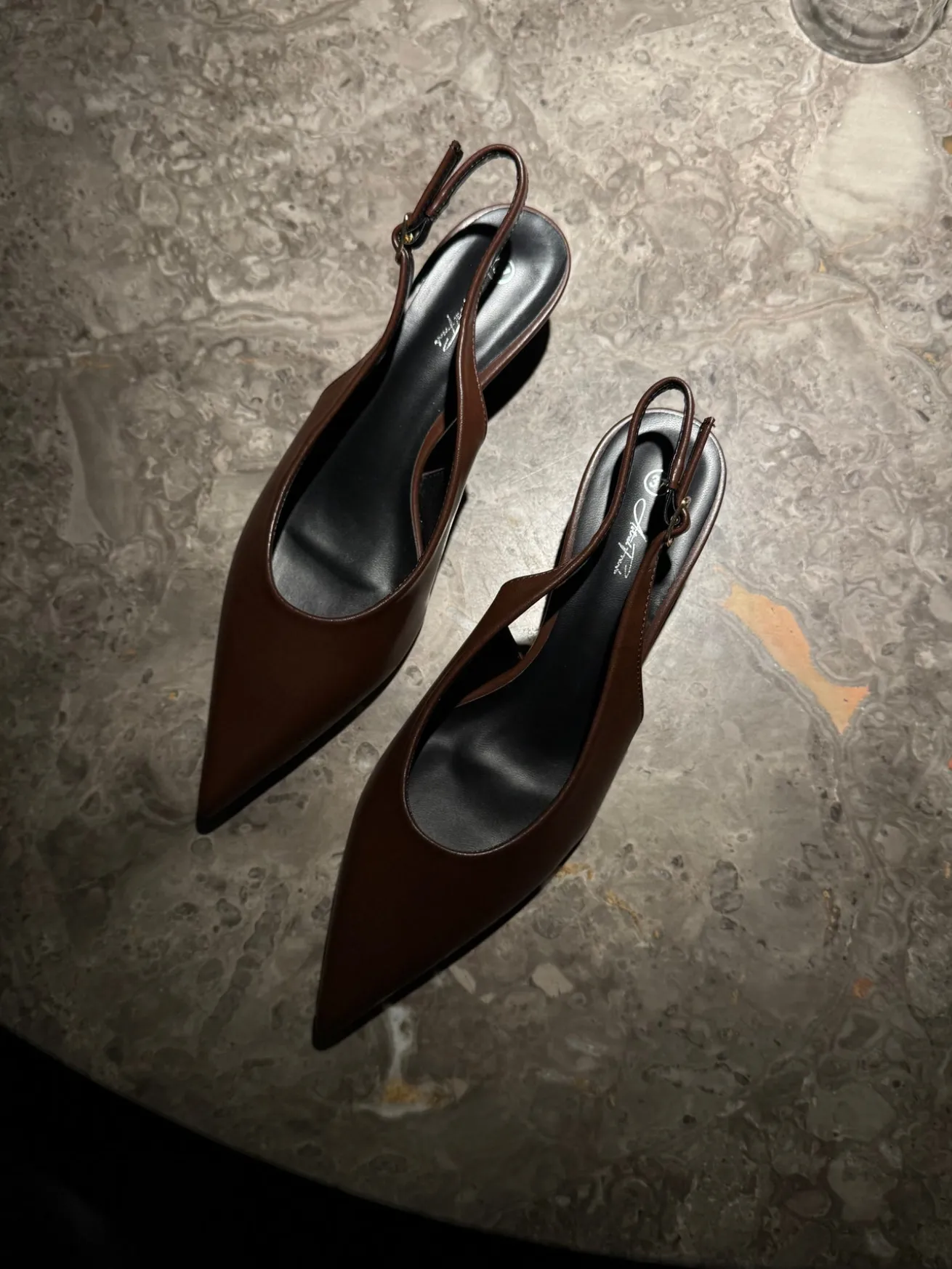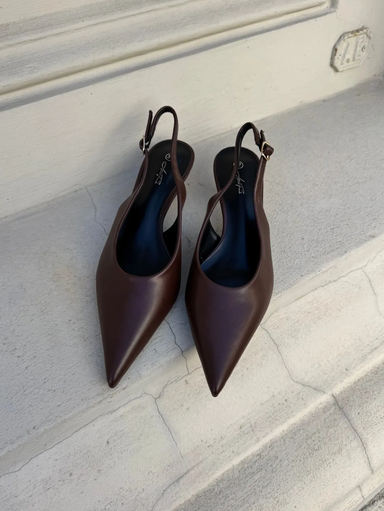 Sofia stiletterne har en spids snude og det fineste læder-look. De har en rem bagtil som kan justeres efter behov.