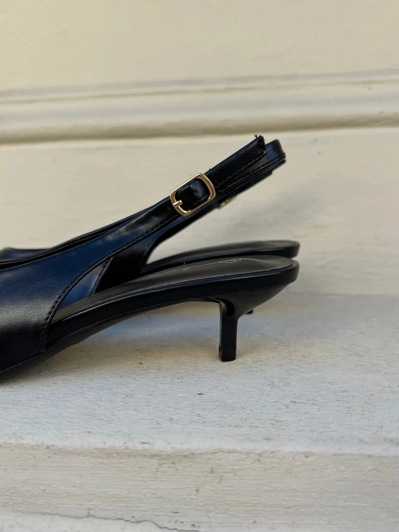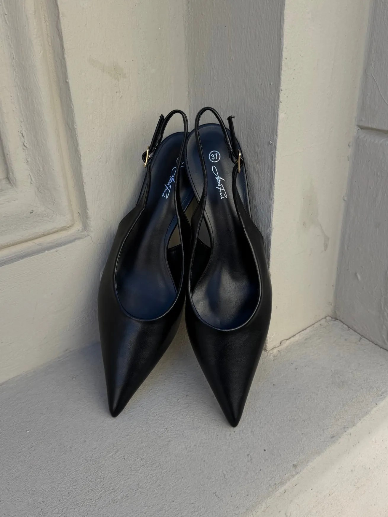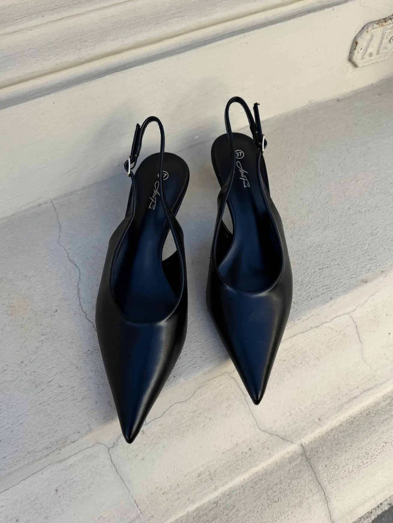 Sofia stiletterne har en spids snude og et læder-look. De har en rem bagtil som kan justeres efter behov.
