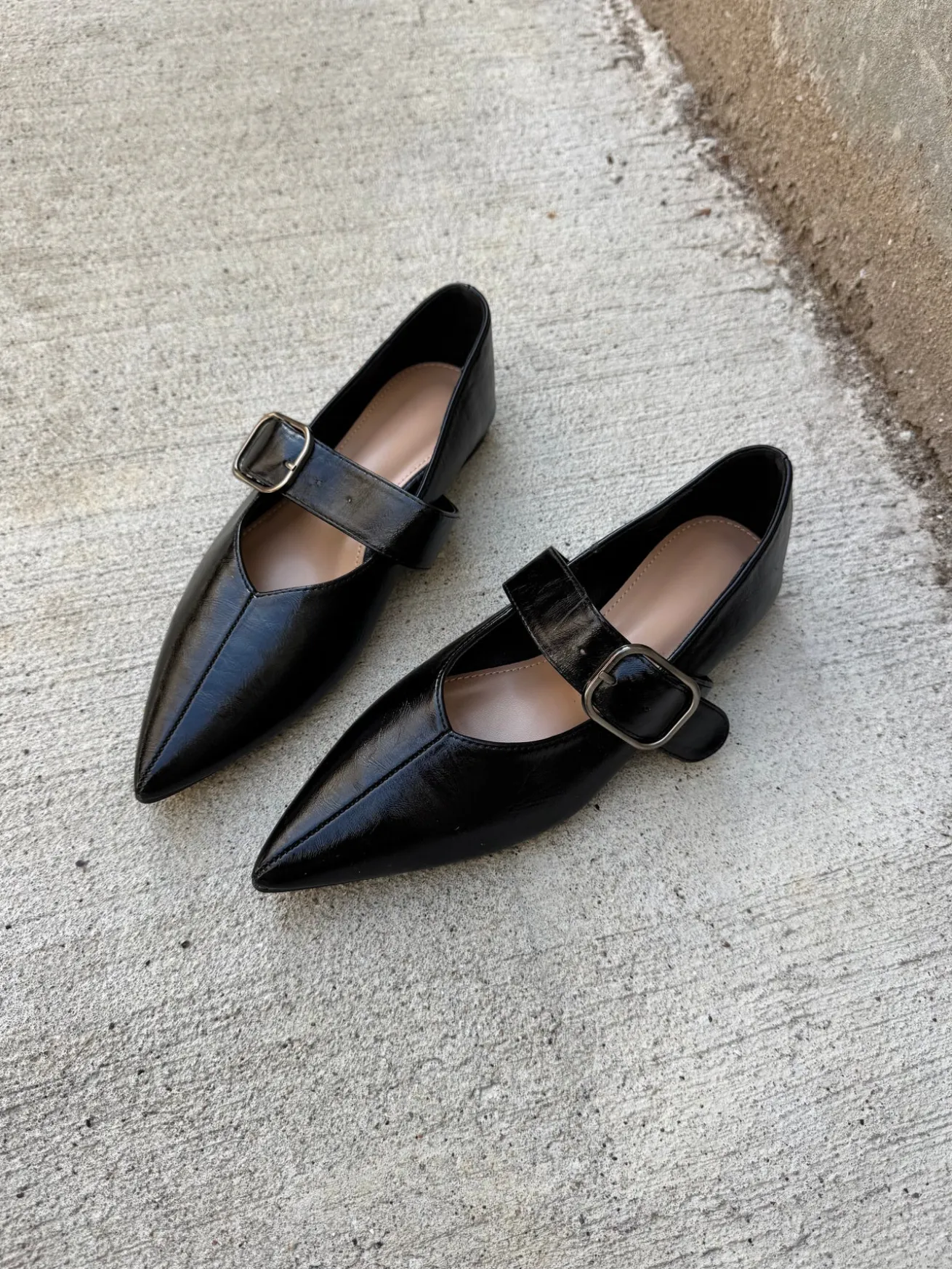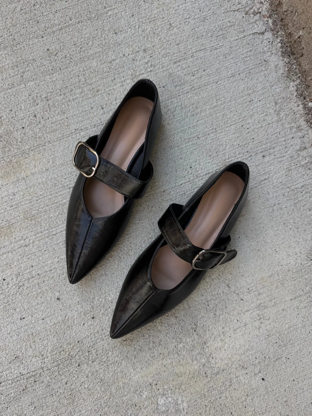 Sofia ballerinaerne har en spids snude. De har en bred rem over foden og en lille hæl. Skoen er perfekt til efteråret og sensommeren og kan bruges både til hverdag og til festlige lejligheder.