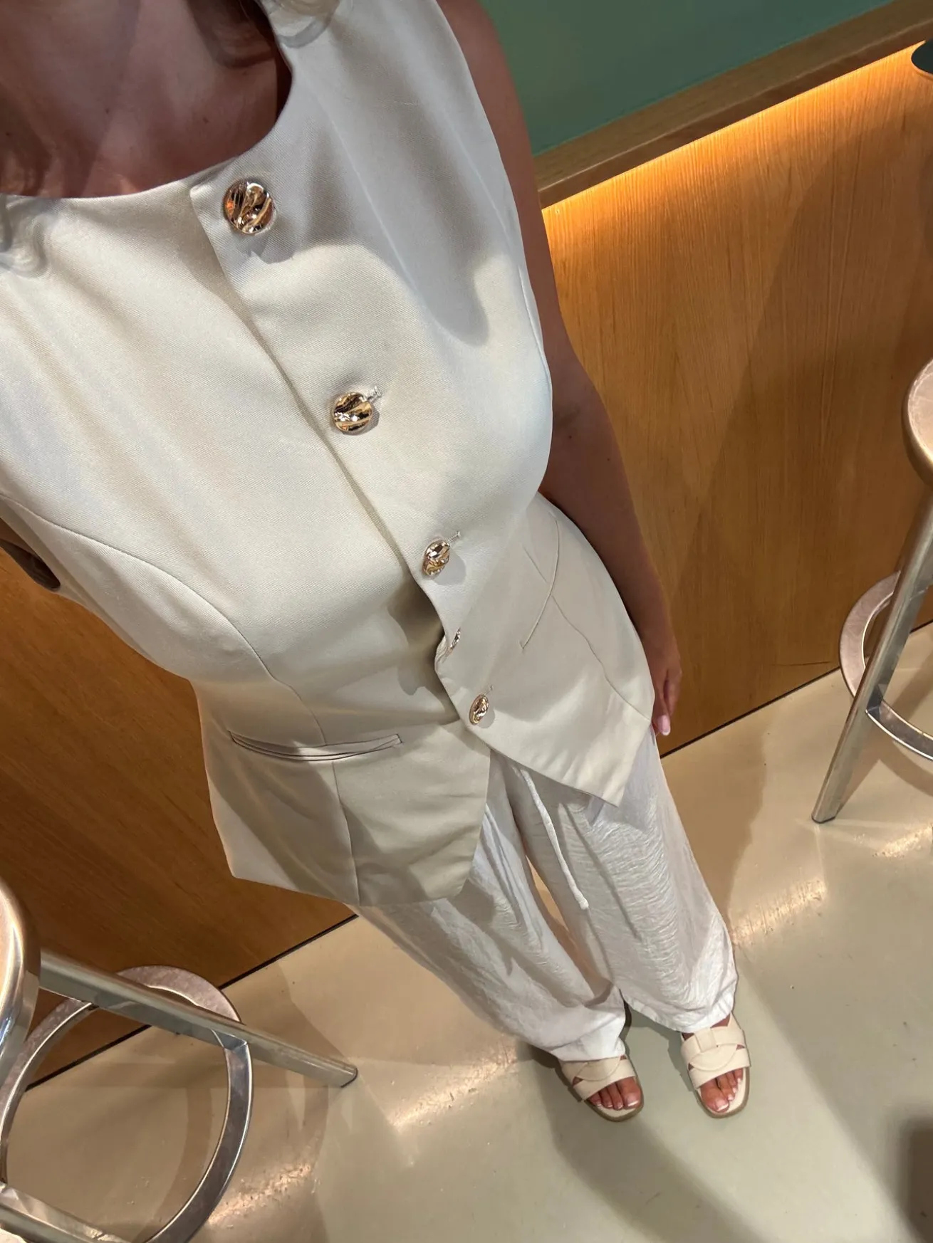 Stella vesten lukkes fortil. Den har en A-åbning i bunden og fremhæver taljen. Vesten er perfekt til hverdag og festlige begivenheder.