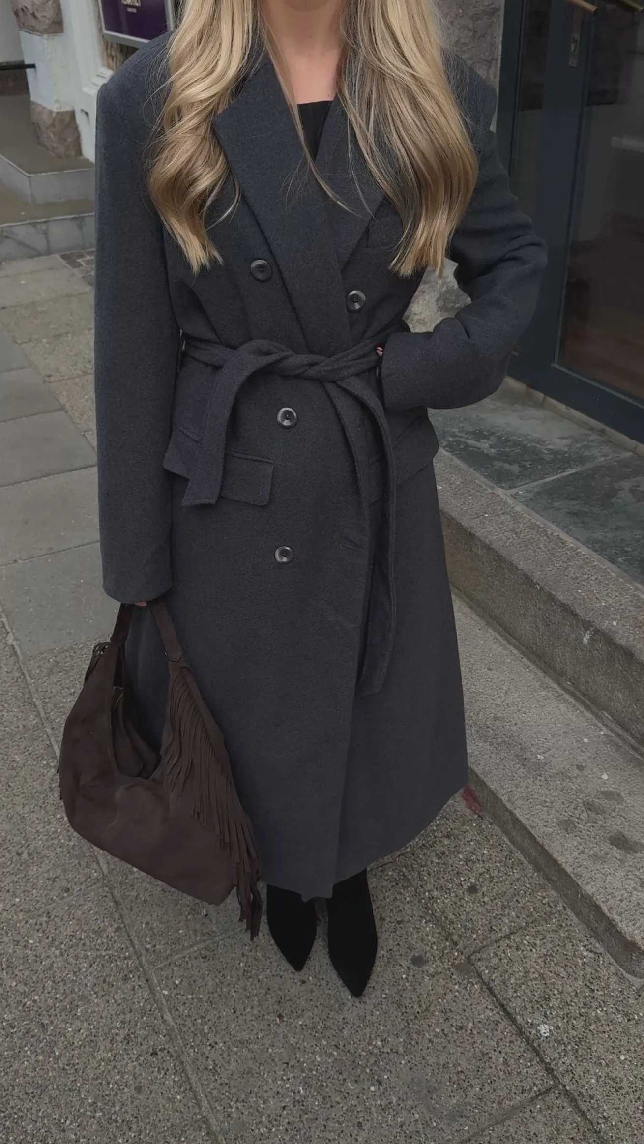 Valeria trenchcoaten har både bælte og knapper. Den er lang og helt perfekt til efterår og vinter. Den har en v-udskæring og et oversized look.