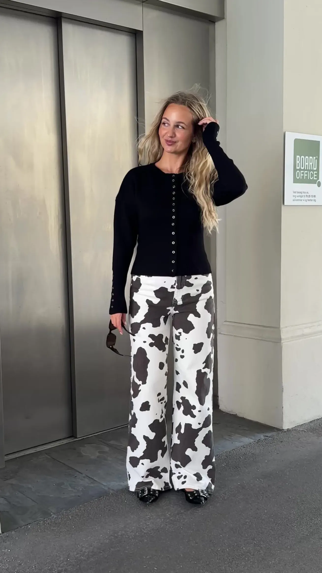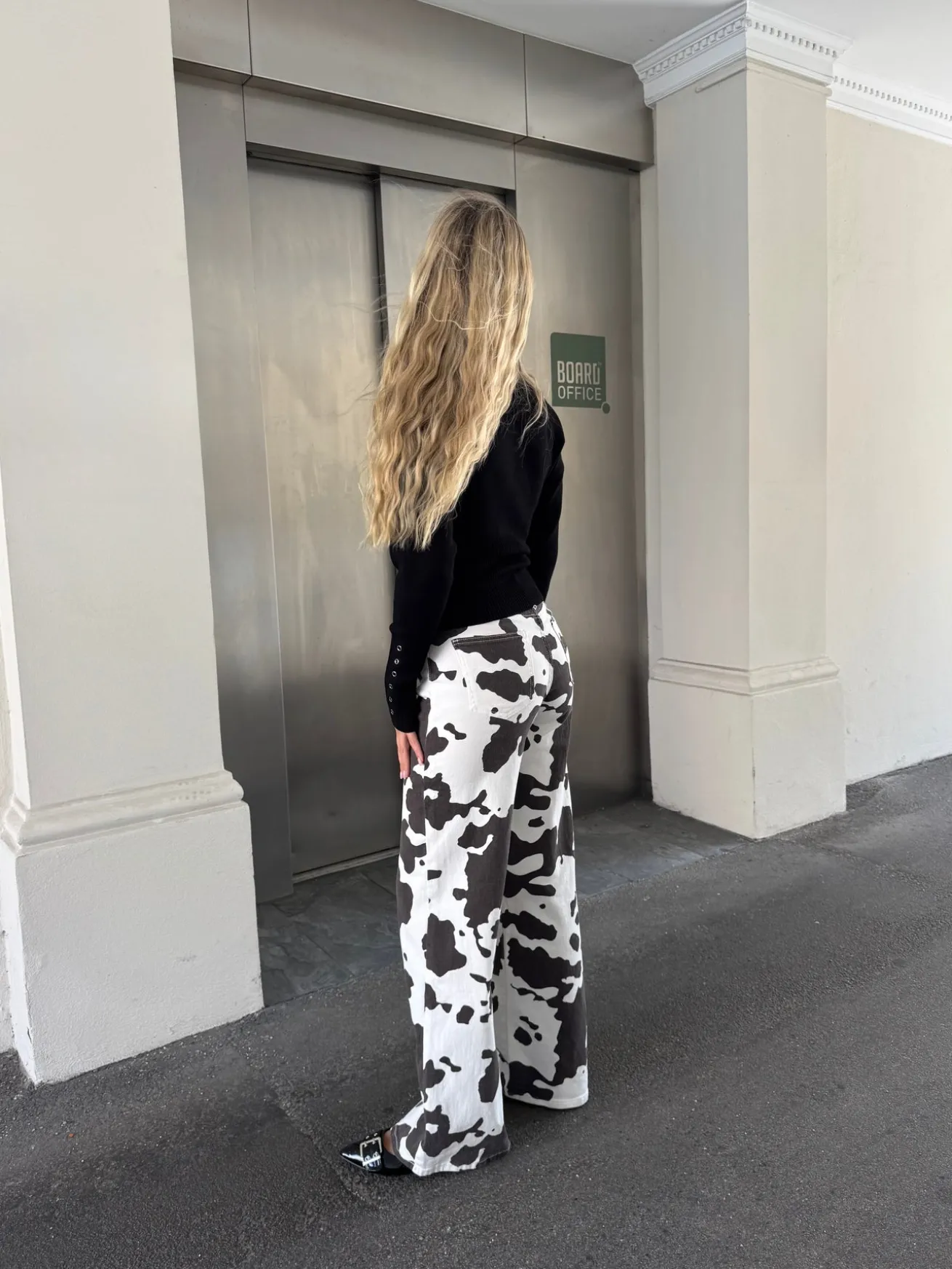 Valerie bukserne har det fineste ko-print. Bukserne har en bred pasform og en masse elastik.