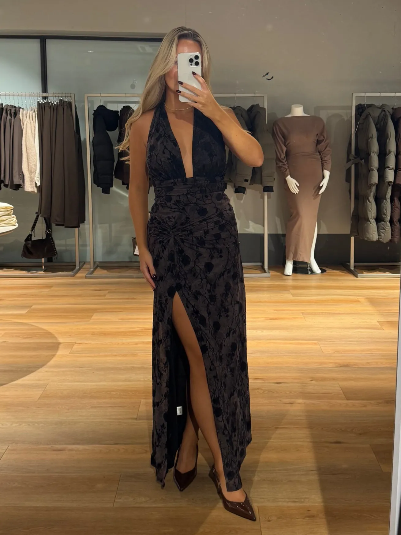 Vanessa kjolen har de smukkeste blomster i stoffet og går ind i taljen. Kjolen bindes i nakken og har en åben ryg. Kjolen er helt perfekt til fine begivenheder og til nytår.