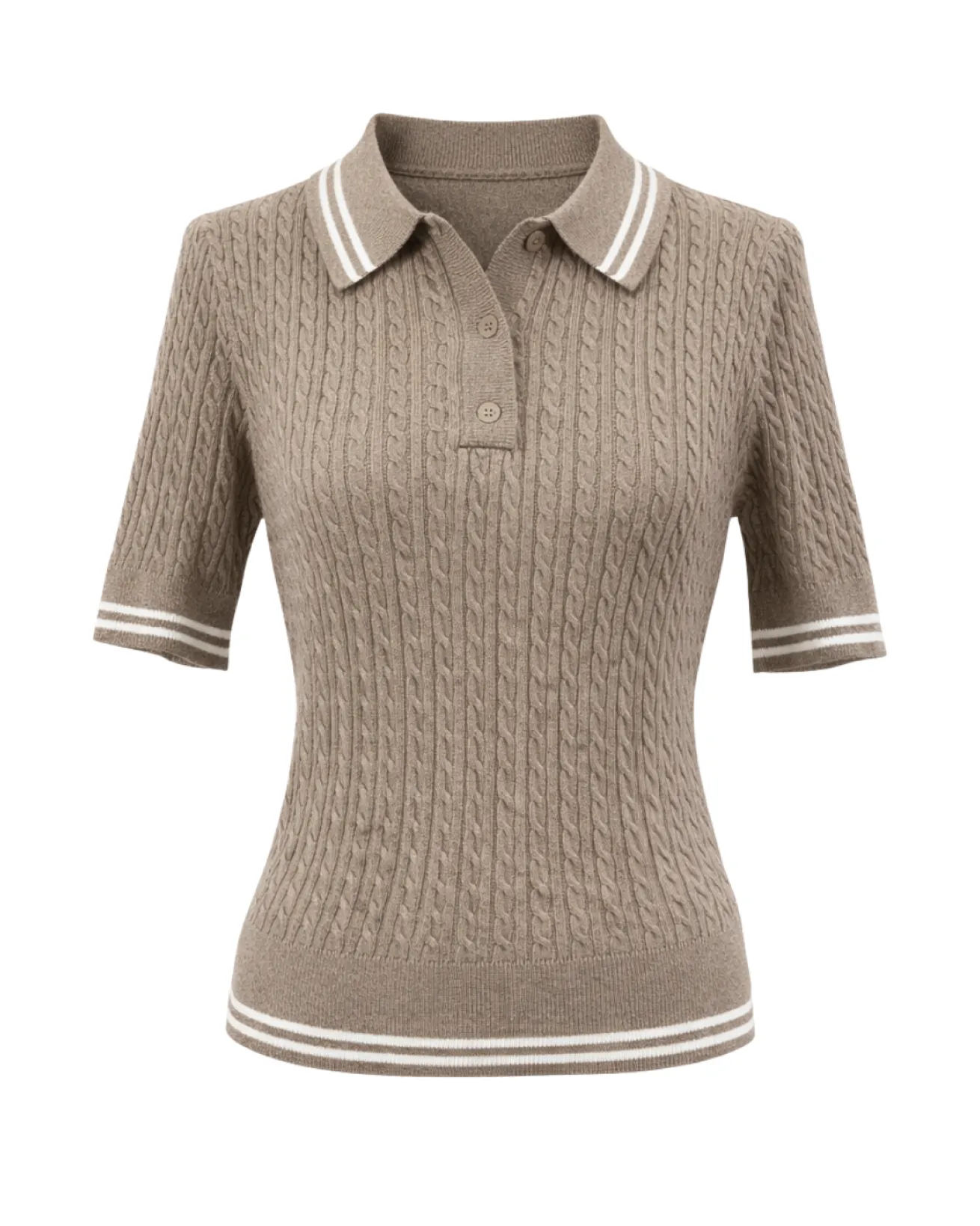 Denne lysebrune strikpolo med kabelstrik kombinerer et klassisk og sporty udtryk med elegant design. Den strukturerede strik giver et eksklusivt look, mens kraven med kontraststriber og knaplukning tilfører et stilrent touch. Det tætsiddende, men behagelige snit sikrer en flot pasform og høj komfort. En alsidig strikpolo, der er nem at style til både hverdag og mere pæne anledninger.