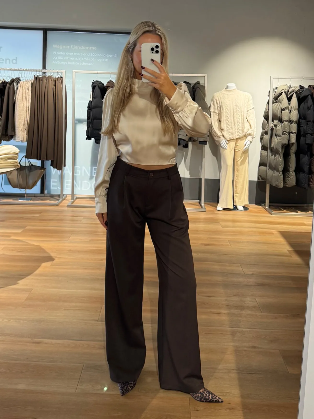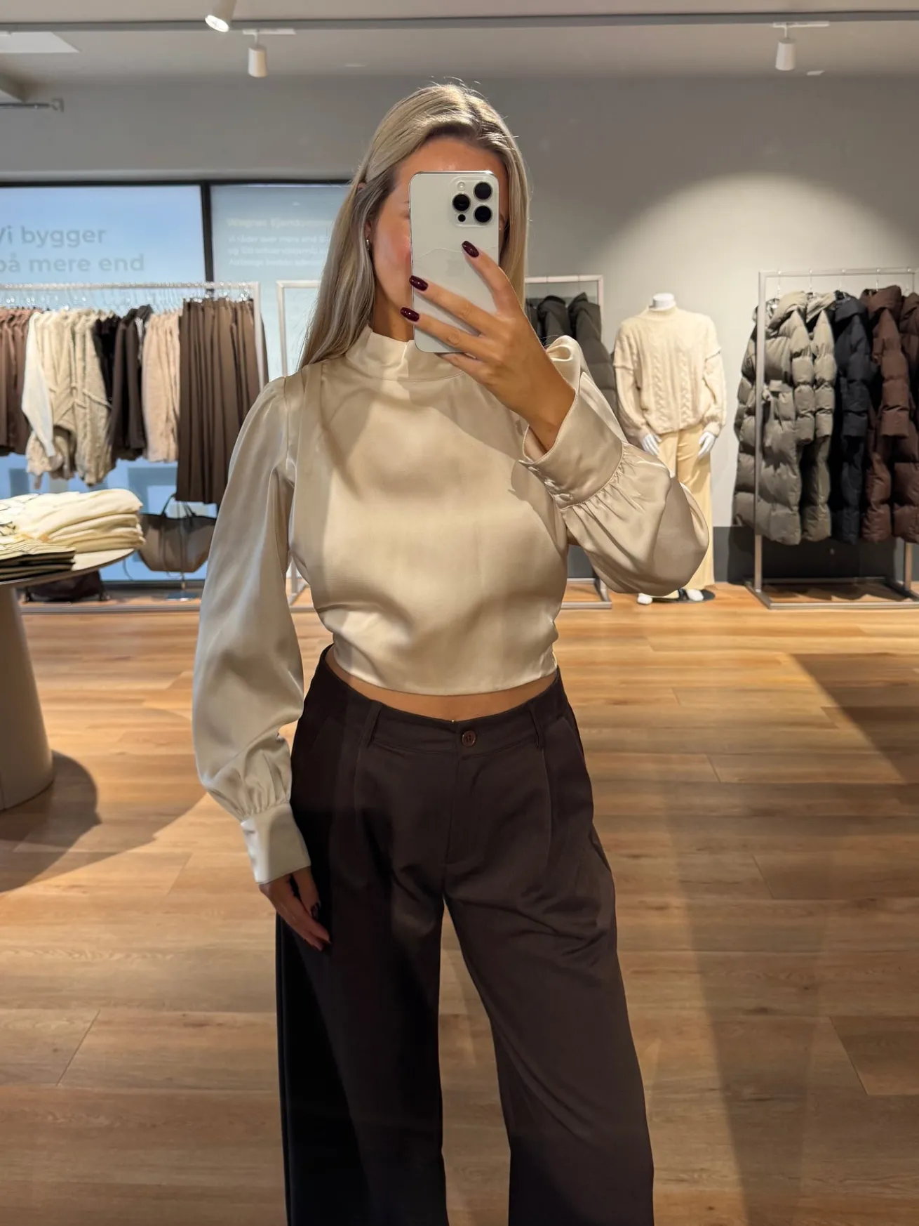 Ana blusen har en åben ryg og lukkes i nakken. Den har knapper på ærmerne som har en ballon form og går ind omkring håndleddet.