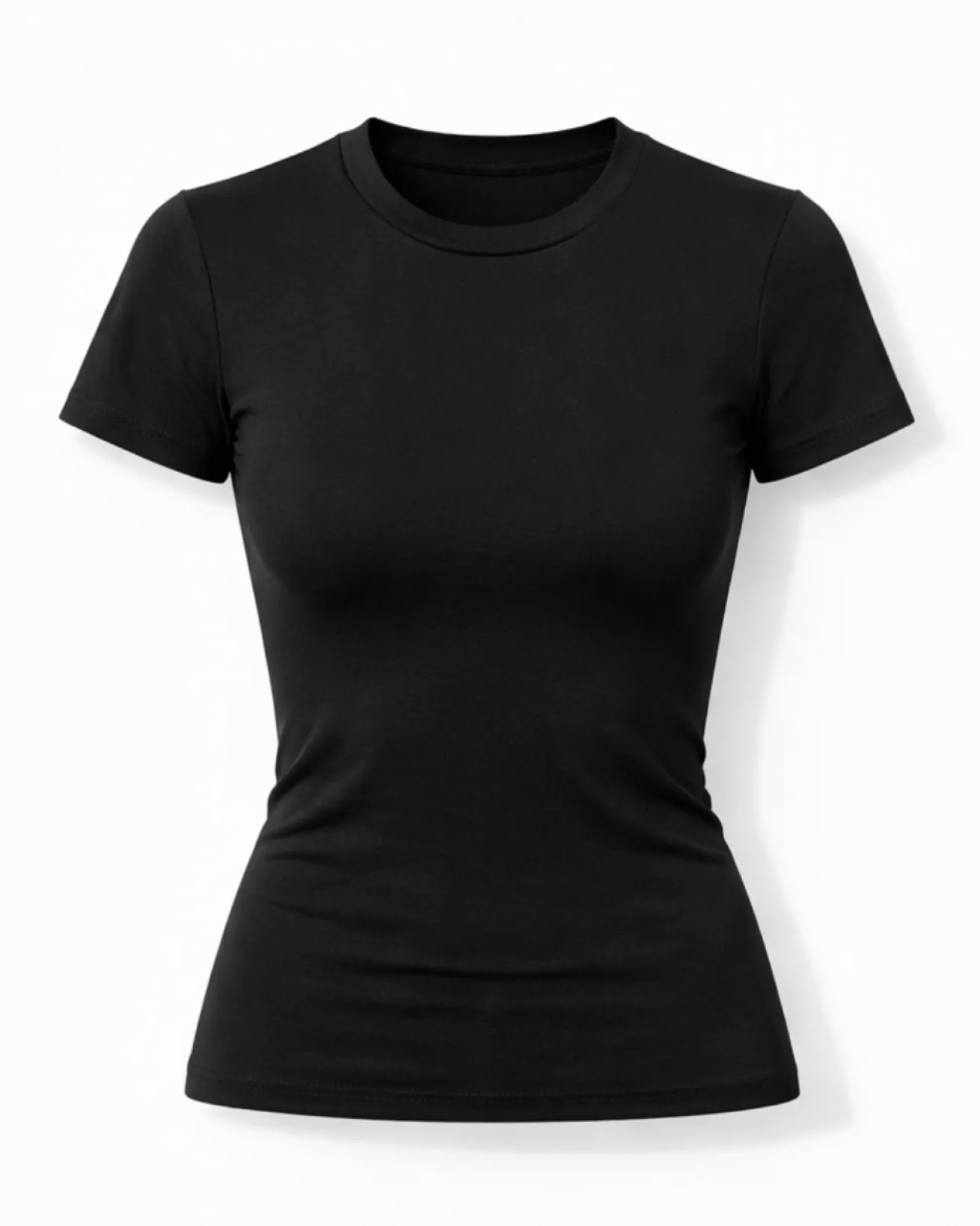 Denne strækbare sorte t-shirt er lavet i et blødt og behageligt stof, der giver maksimal komfort hele dagen. Den fleksible pasform følger kroppen uden at stramme og gør t-shirten ideel til både hverdag og mere afslappede anledninger.