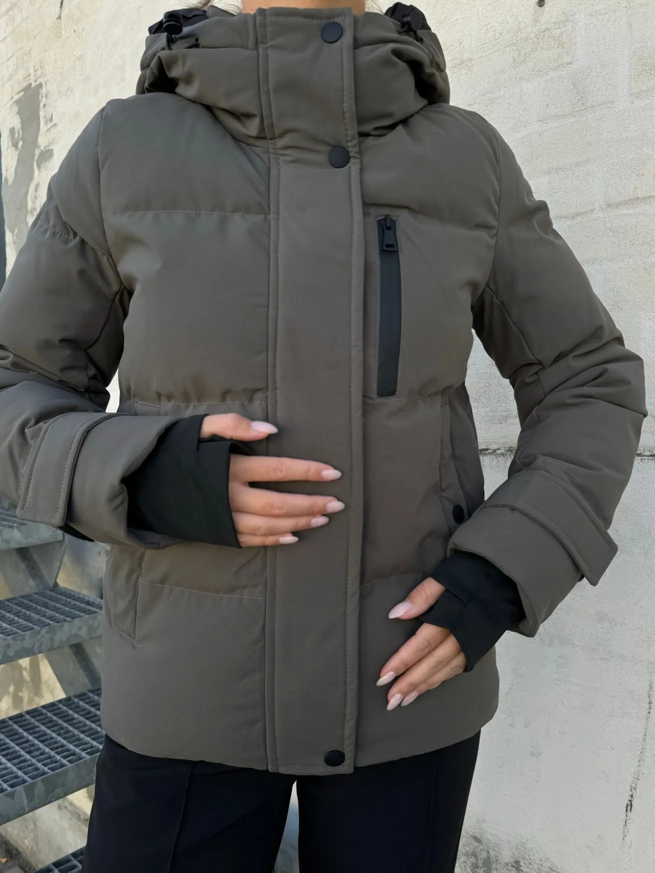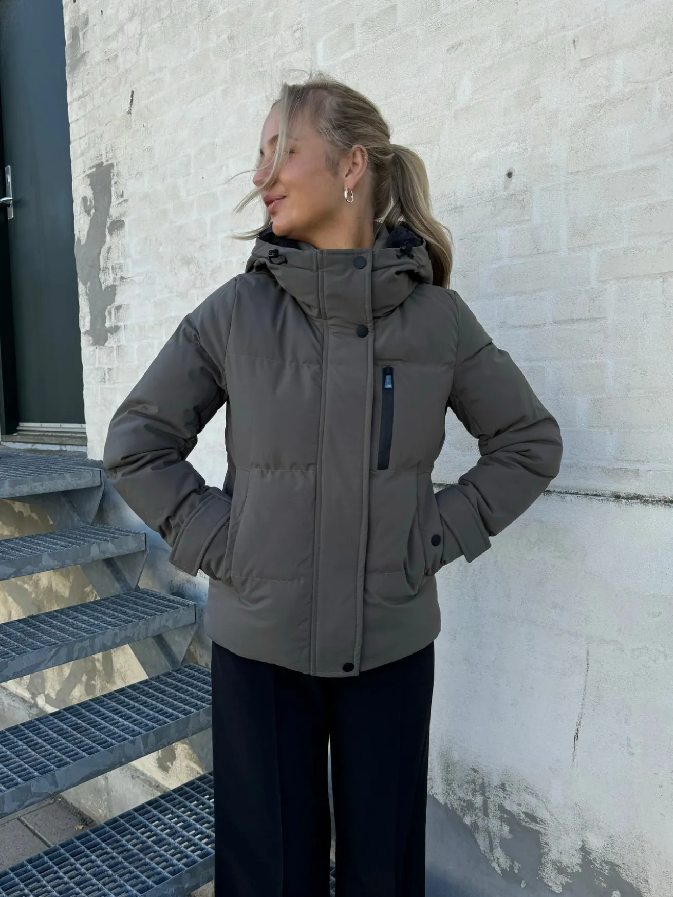 Caya jakken har har en høj hals og hætte den har en ekstra lomme ved brystet og 2 i siden.