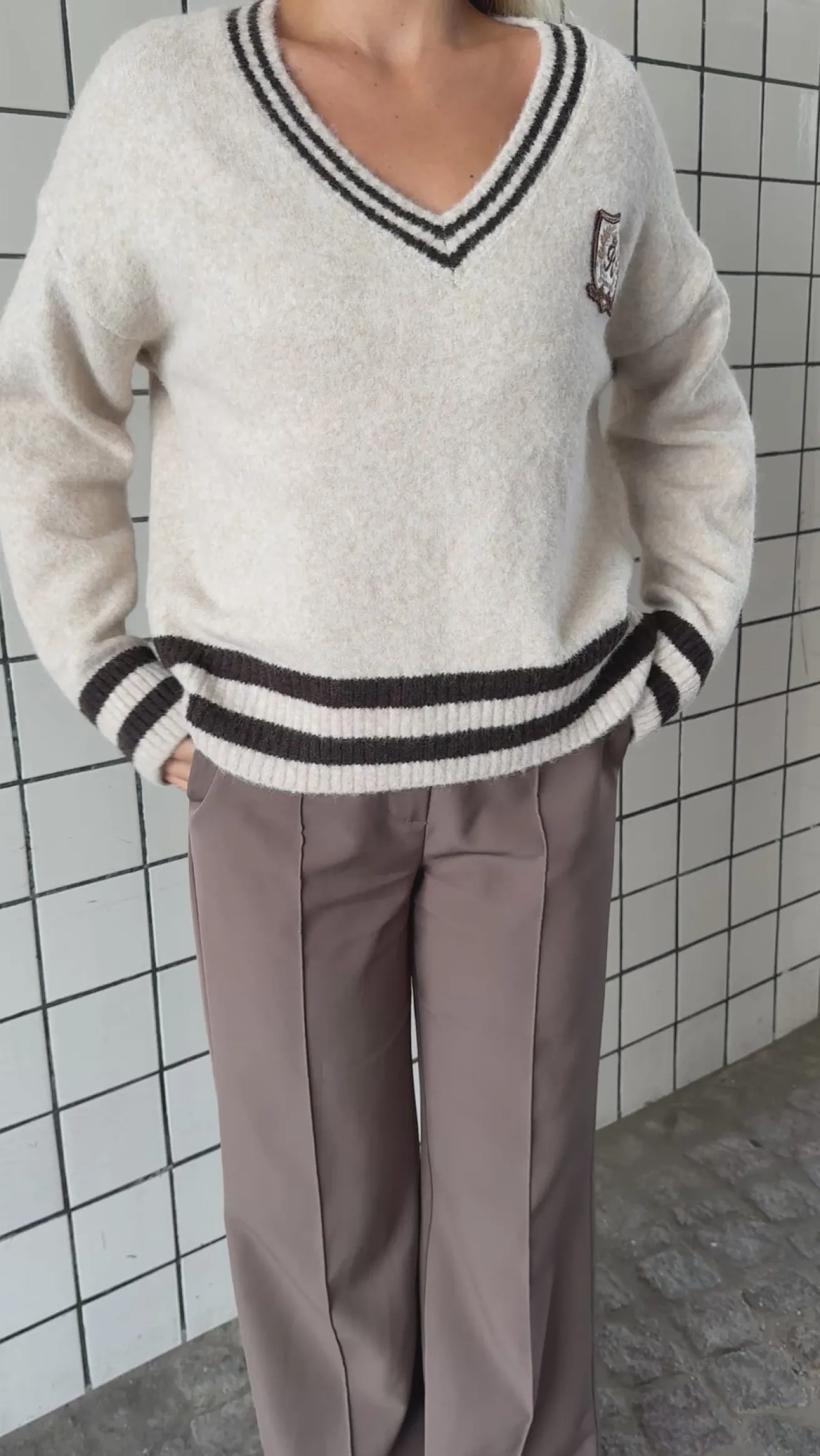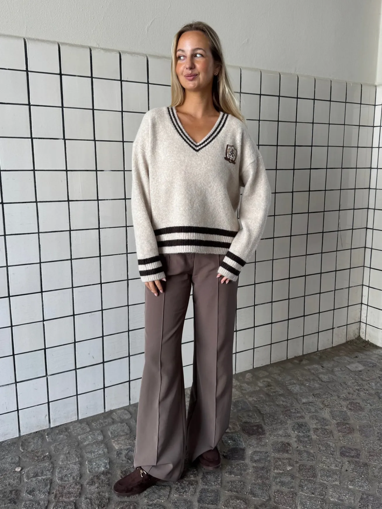 Chloe strikken har en dyb v-udskæring den har en bred bund og brede ærmer.