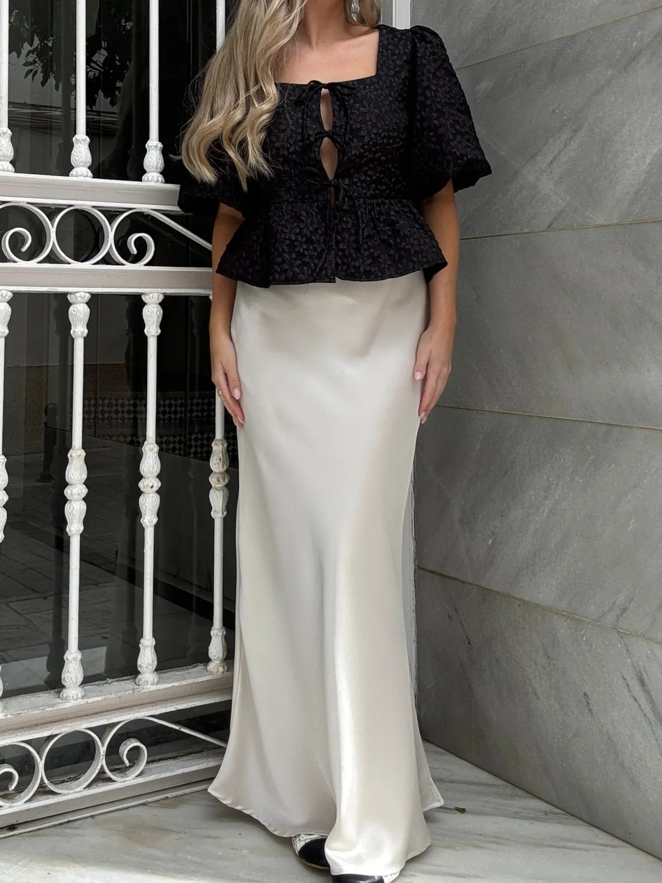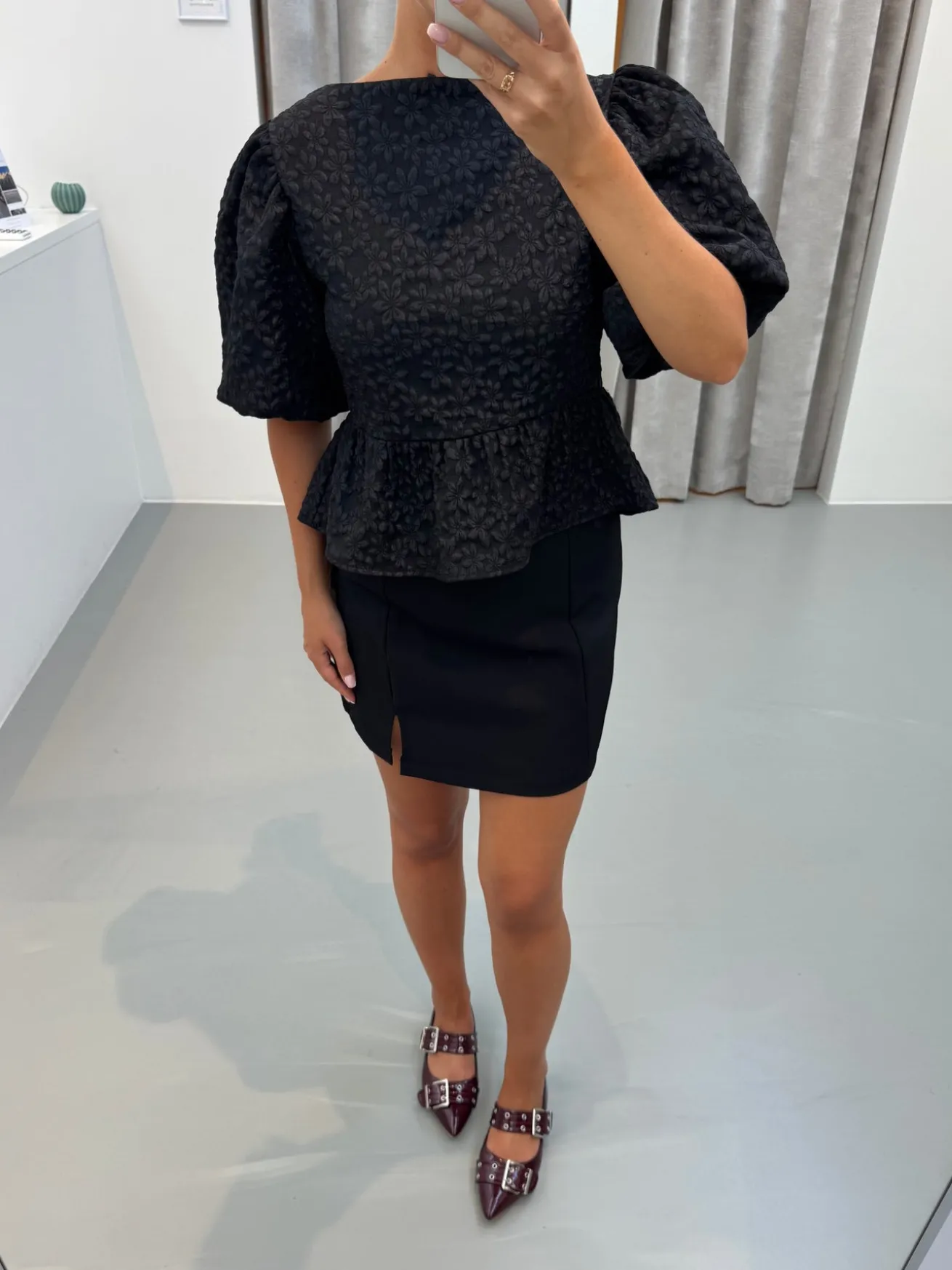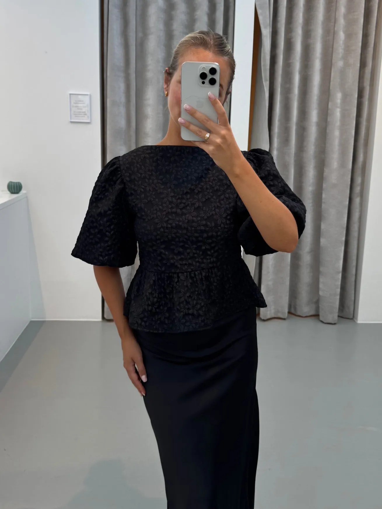 Elena blusen har de fineste puff-ærmer. Den bindes fortil og er den perfekte forårs bluse. Toppen kan vendes, så at du binder den på ryggen. Så giver den et klassisk og mindre åbent look.