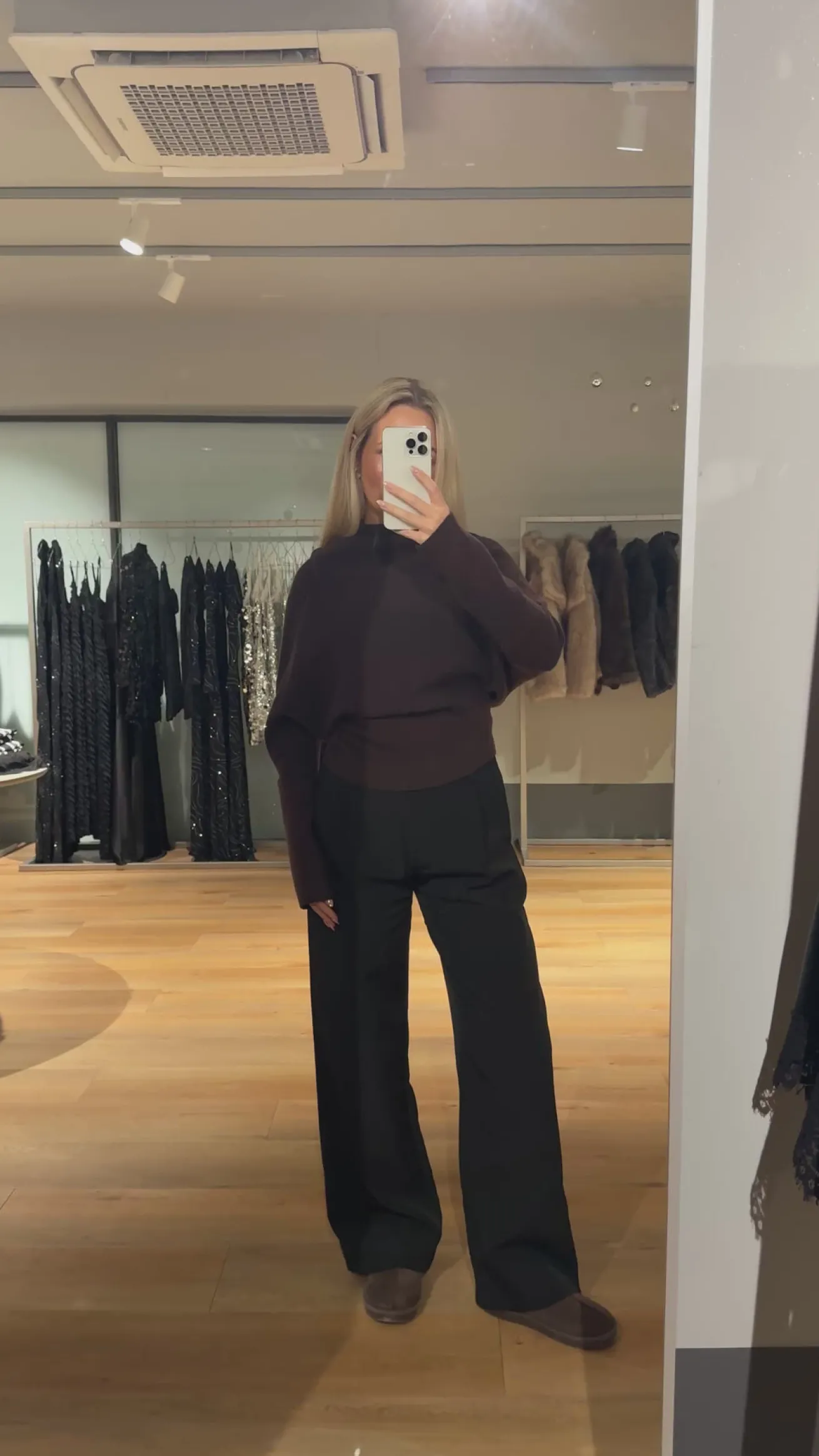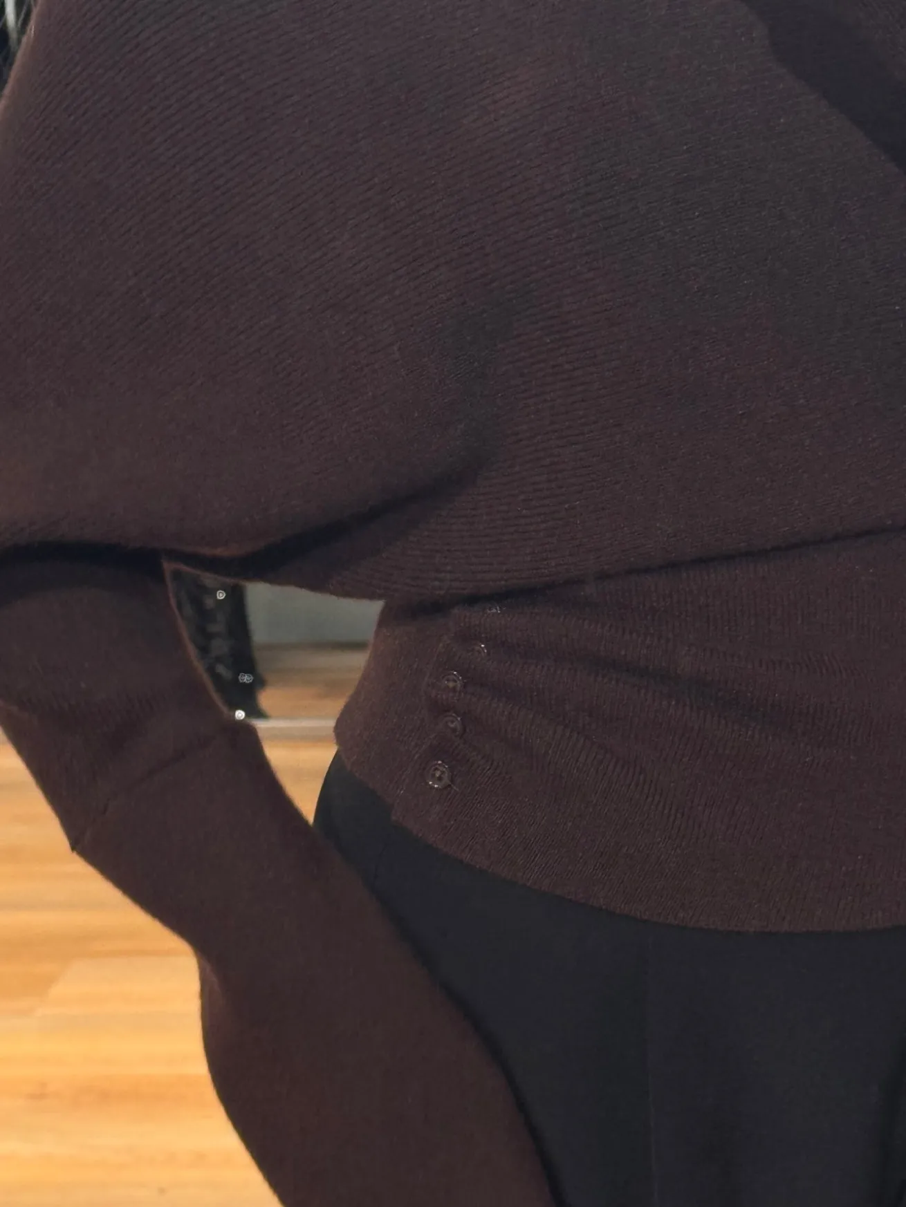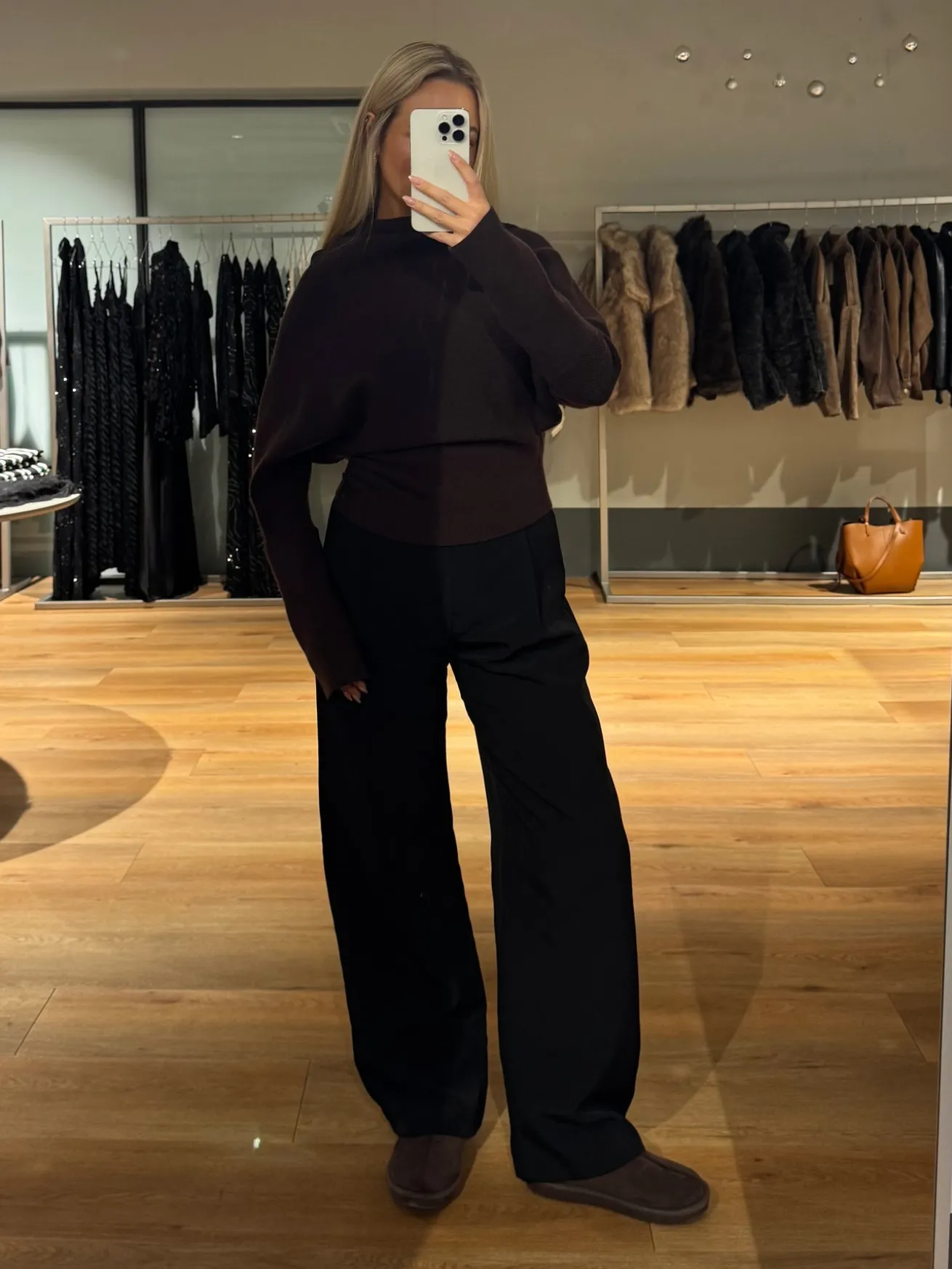 Ella strikken har en vandfalds hals og en løs pasform omkring bryst og mave. Den går ind omkring hoften og har ekstra lange ærmer.