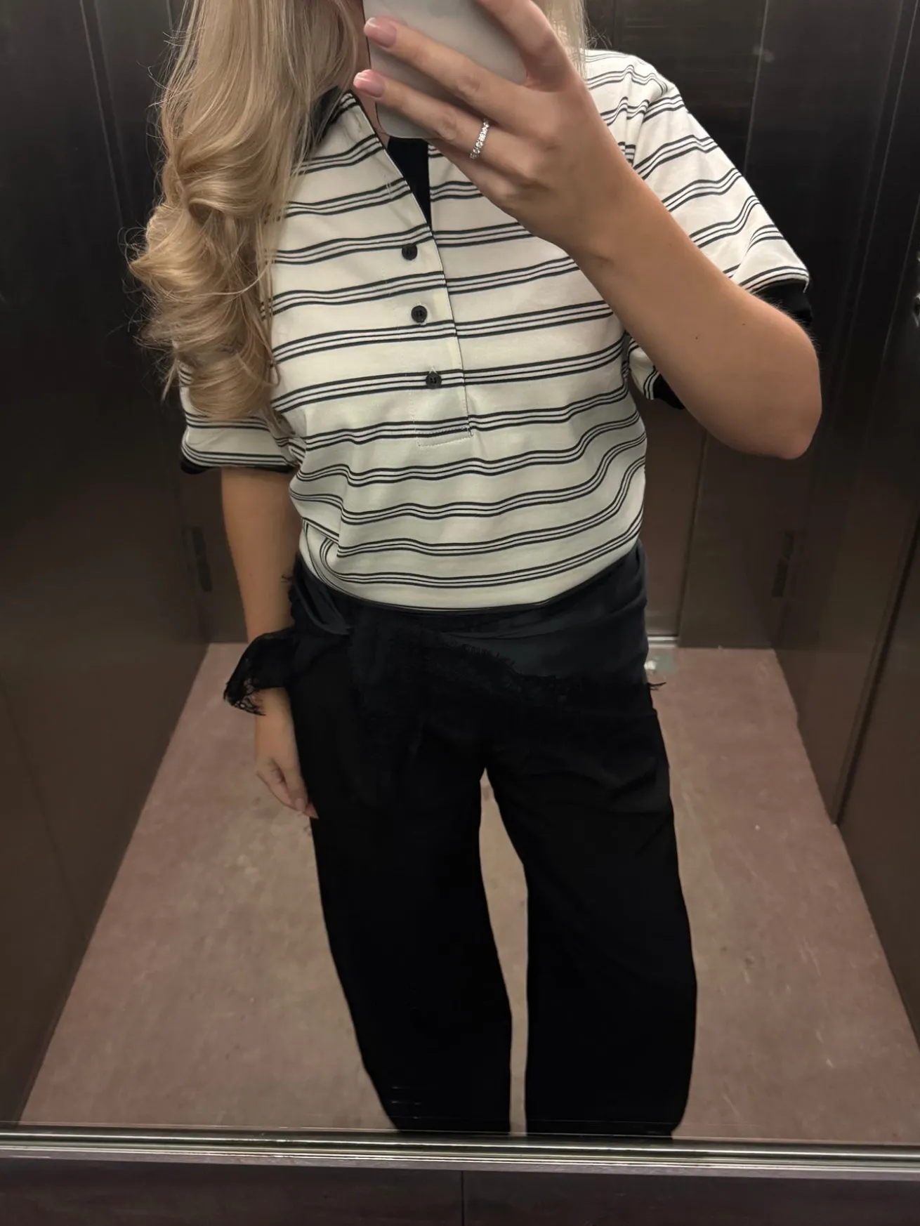 Denne stribede t-shirt skjorte har et klassisk og moderne udtryk med kontrastkrave og dekorativ knaplukning. Det let løstsiddende snit giver en behagelig pasform og god bevægelsesfrihed, mens det grafiske stribemønster tilfører et stilrent look. Skjorten er nem at style til både hverdag og arbejde og passer perfekt til både bukser og nederdel. Et tidløst valg med fokus på komfort og design.