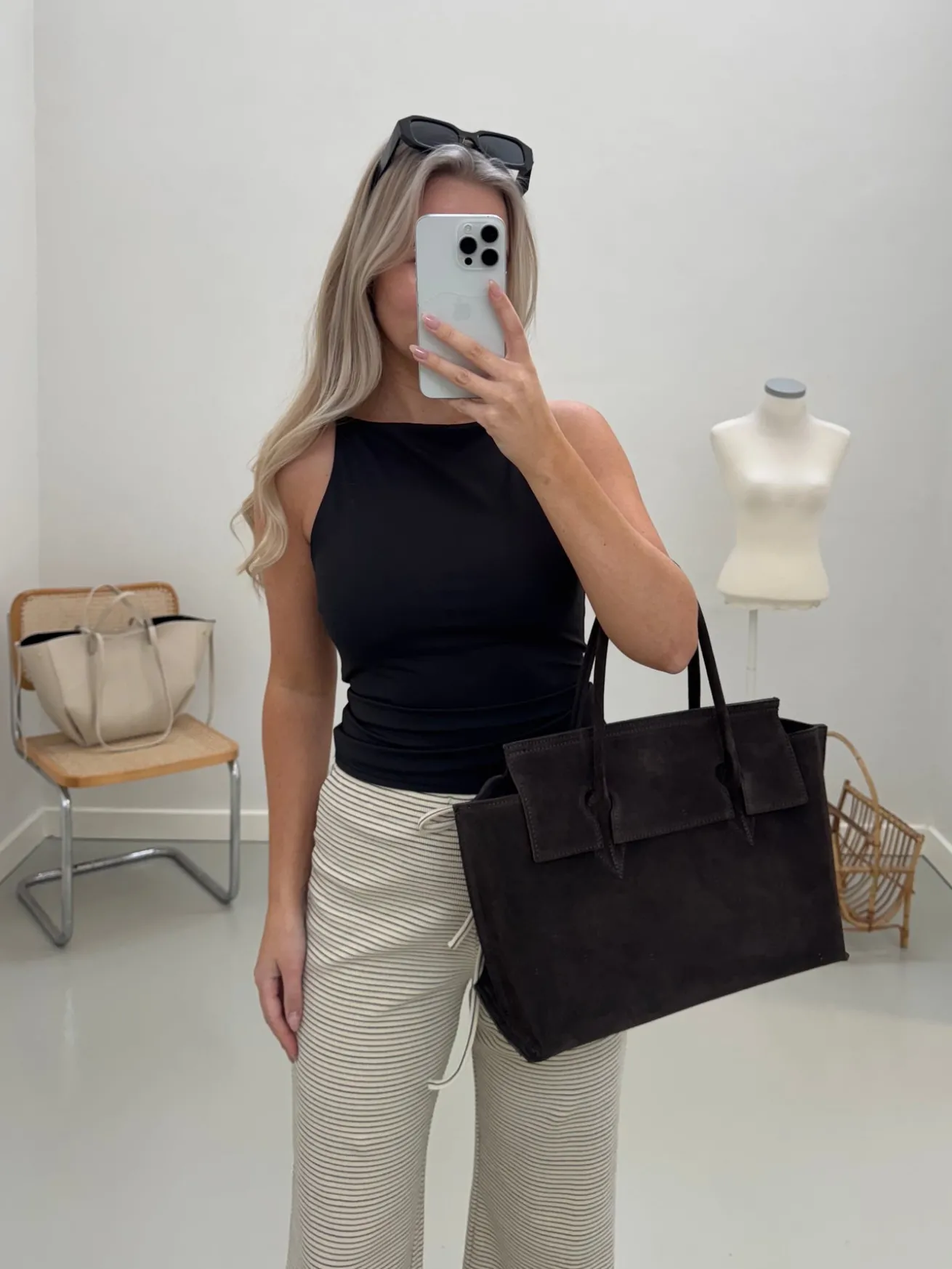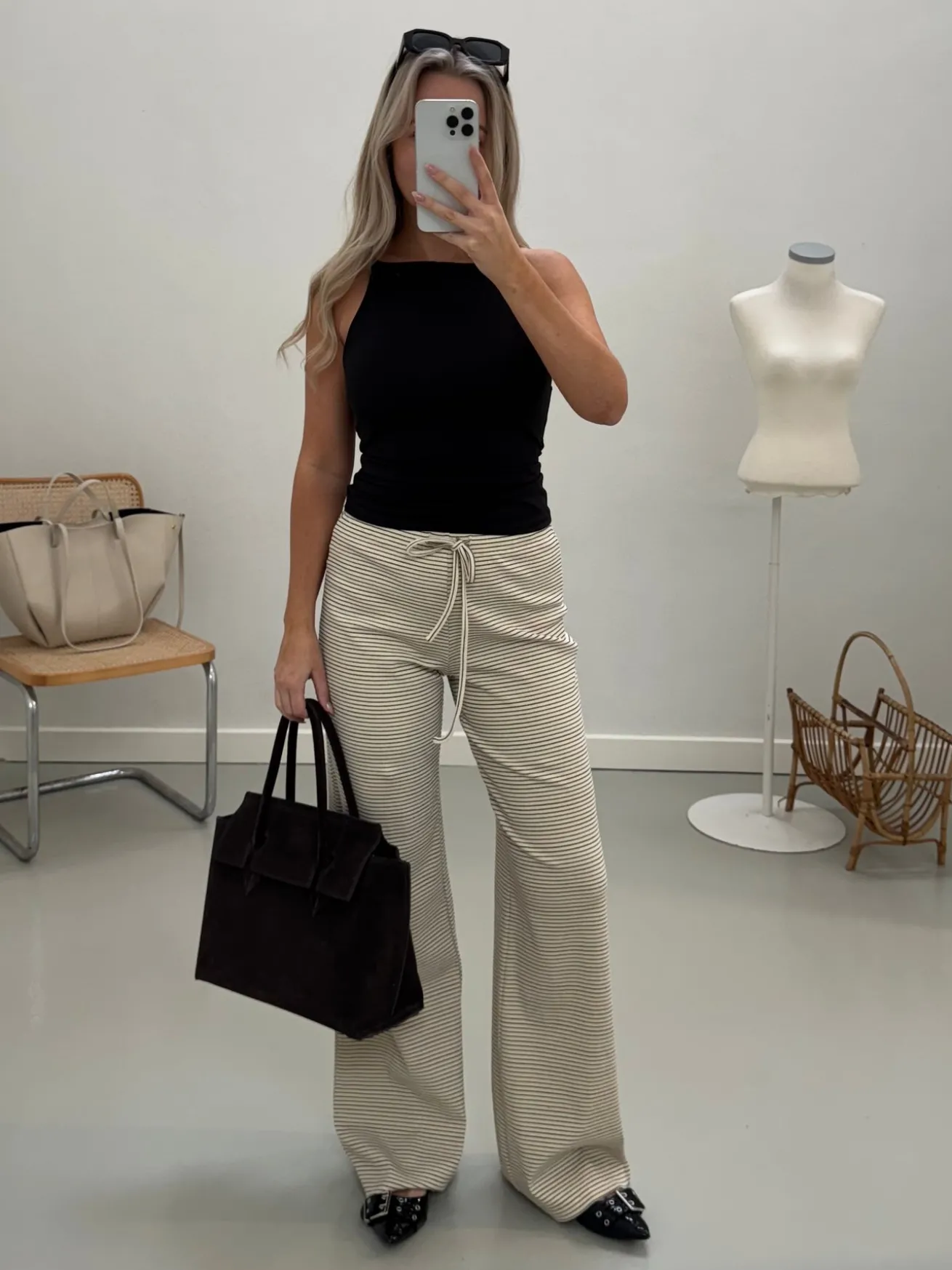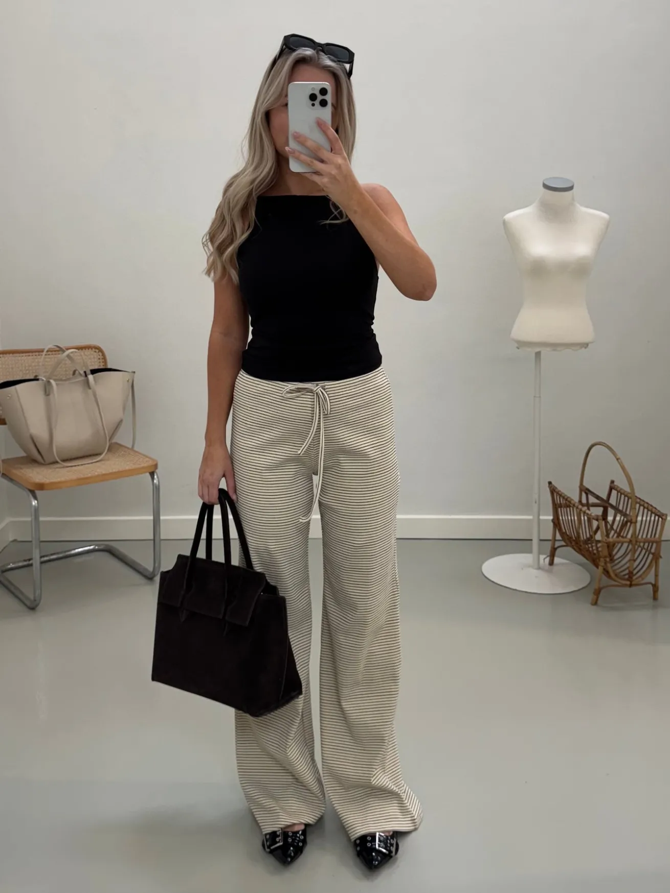 Vores Emma bukser er perfekte til både almindelig hverdag og afslapning. De er lange i benene og kan strammes ind med bindebånd i taljen. Bukserne er mid-rise.
