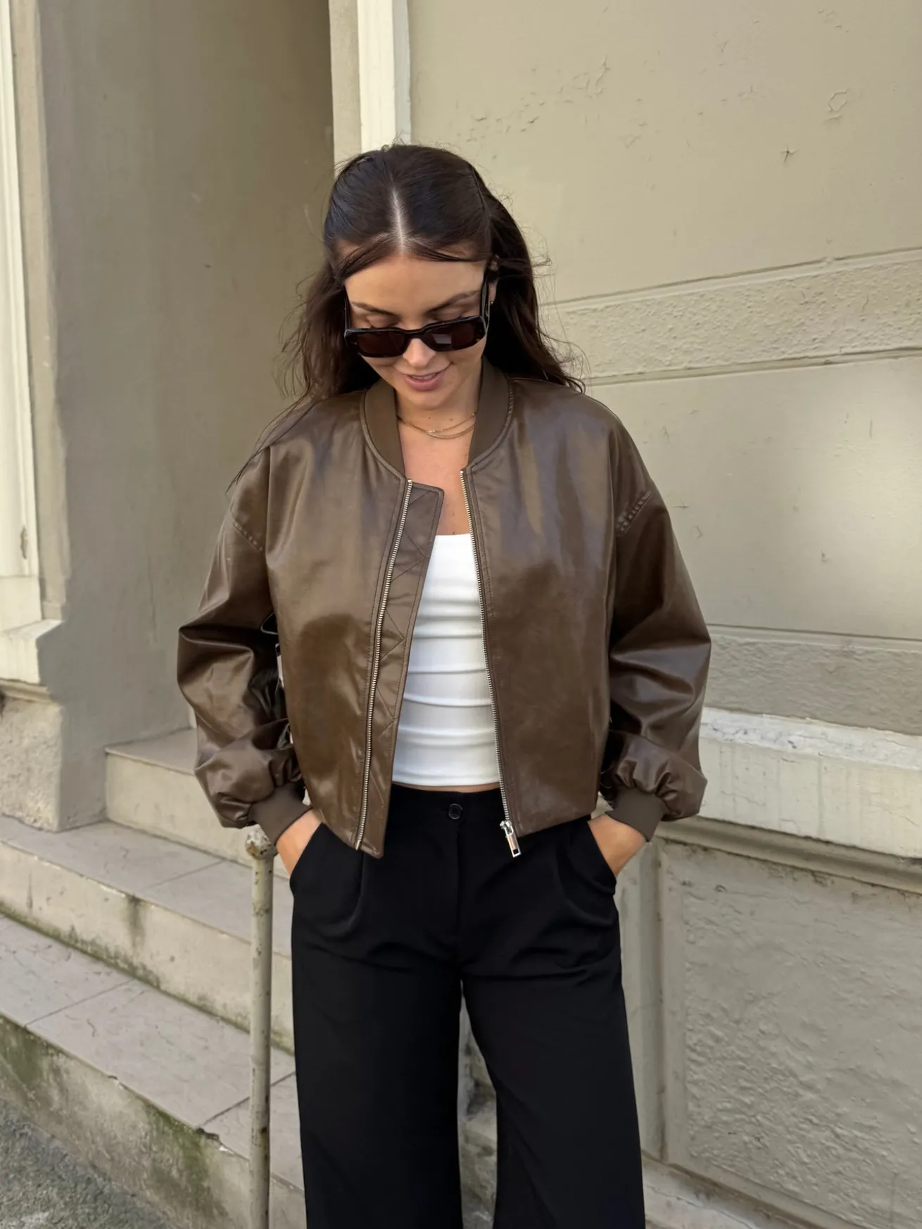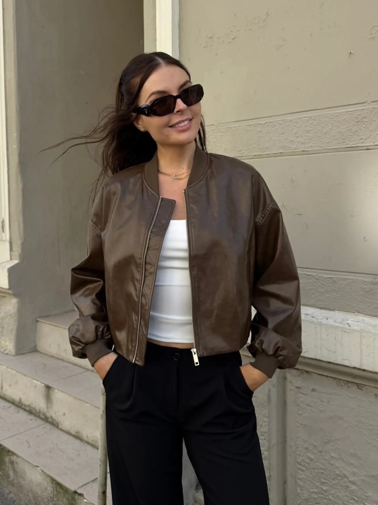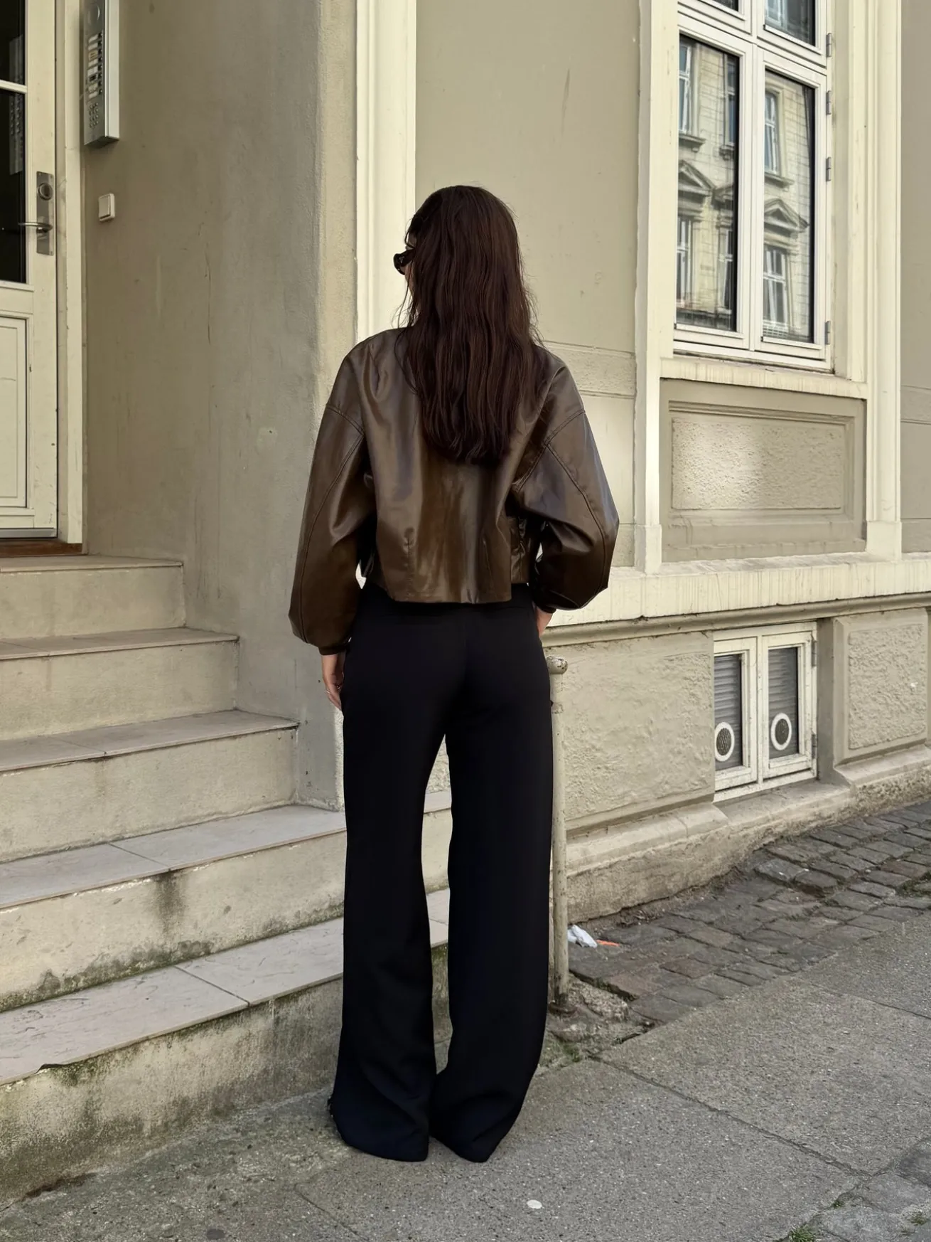 Estella jakken er kort og skær omkring hoften. Den har cuffs omkring håndleddet.