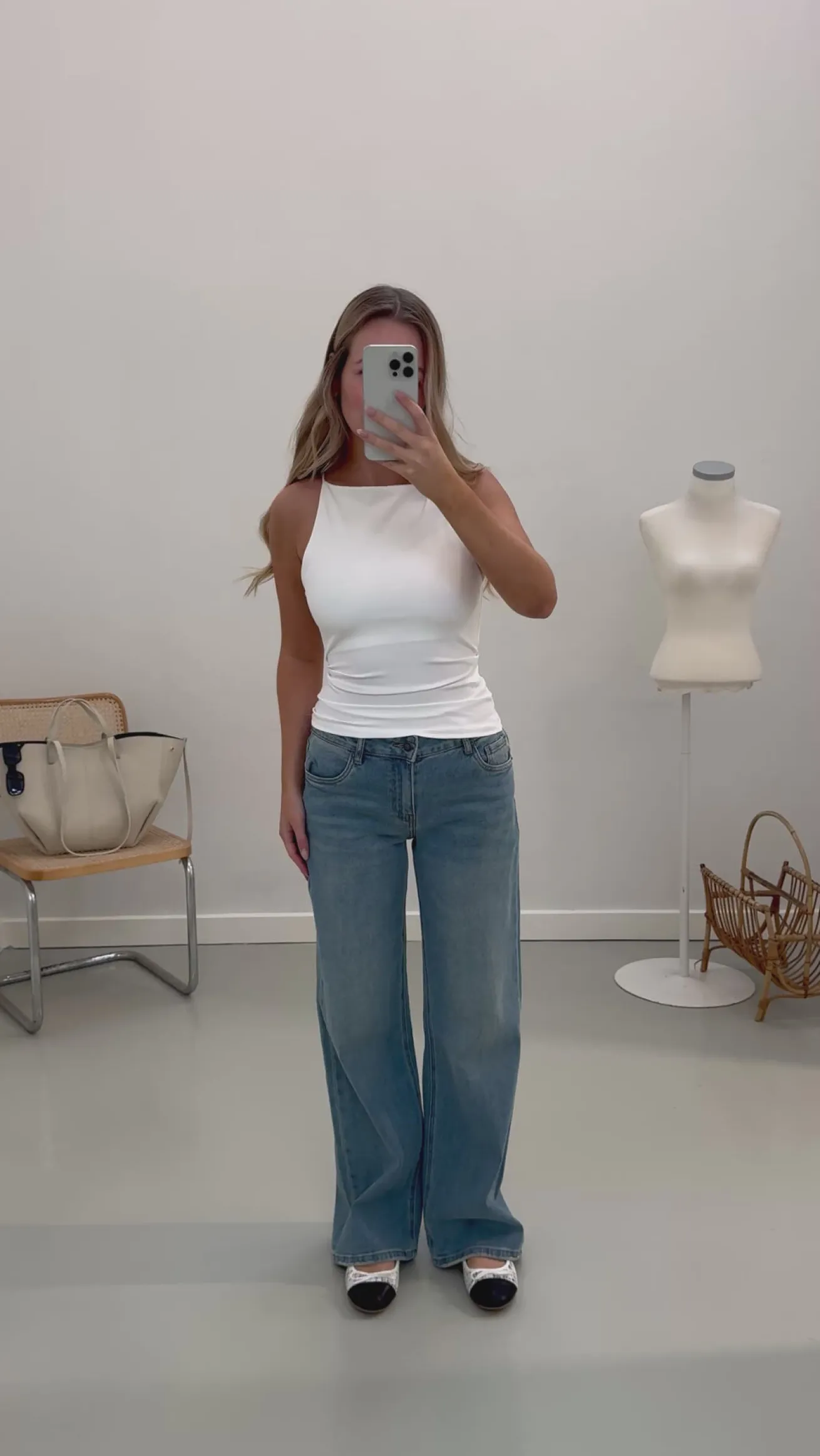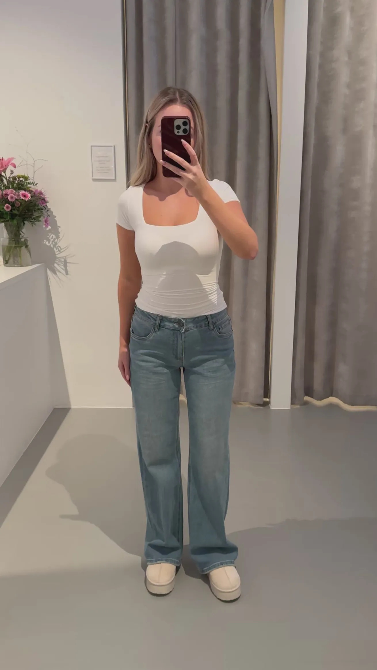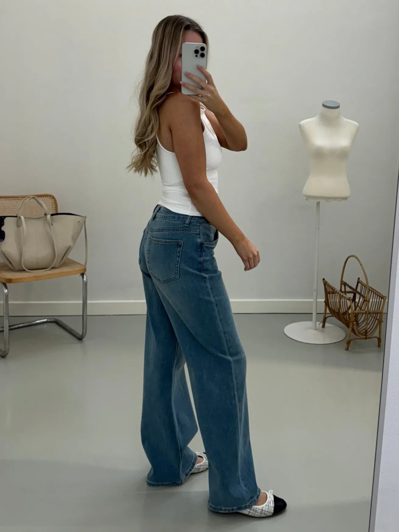Vores Esther jeans har brede ben. De er lavtaljet og er så behagelige. De er perfekte til hverdag med enten sneakers eller en ballerina.