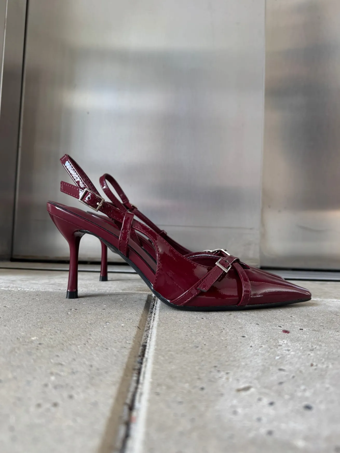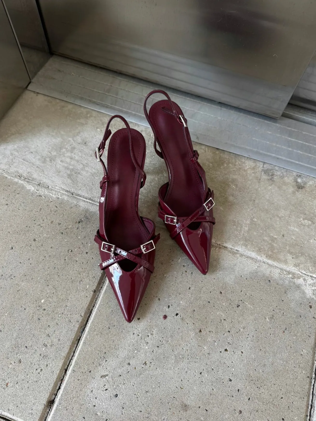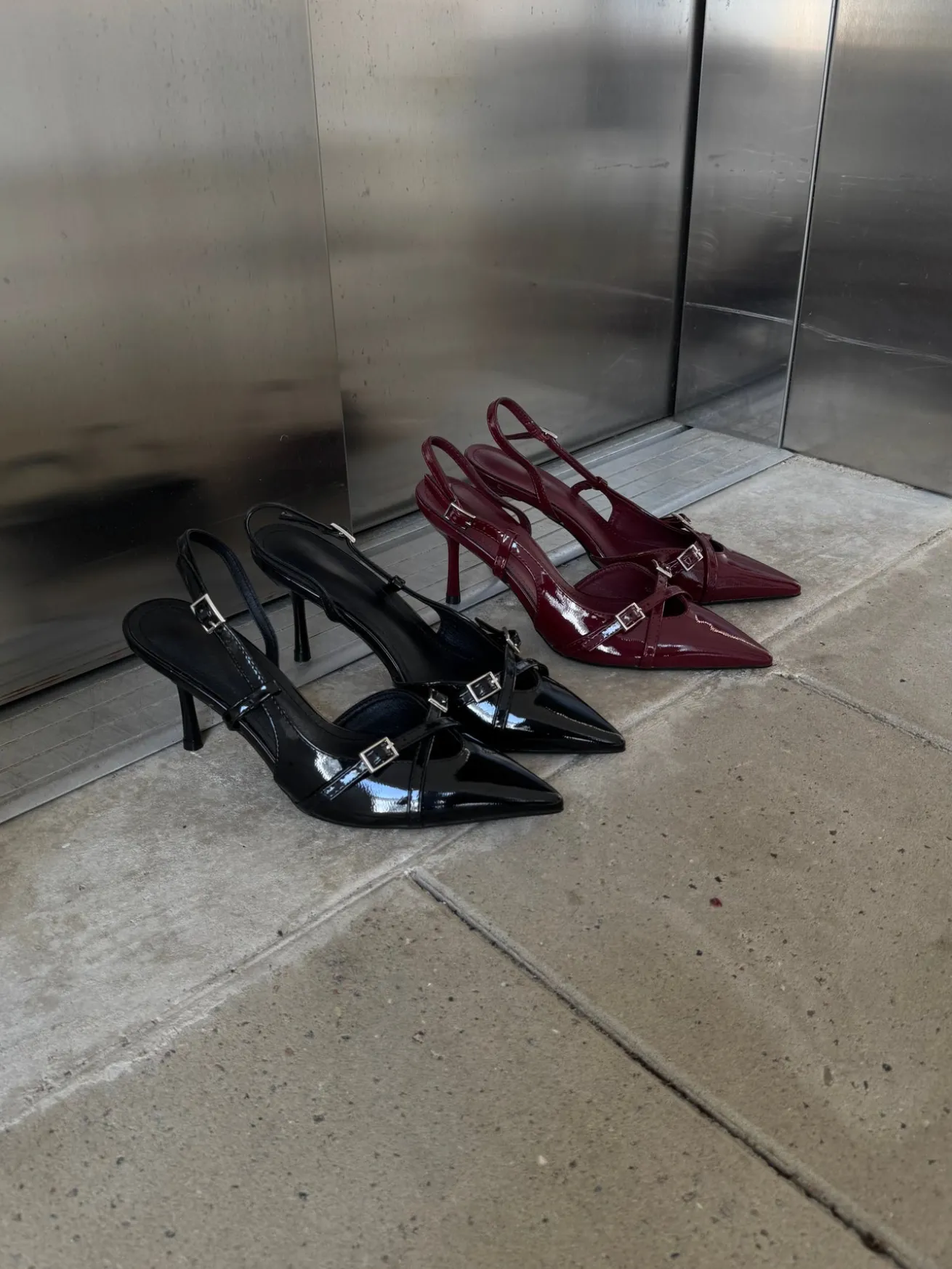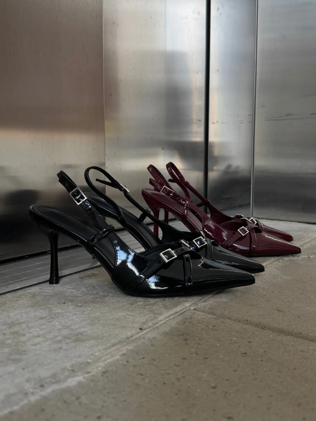 Flora stiletterne er perfekte til festlige begivenheder og kan også bruges til hverdag. Der er en justerbar rem omkring hælen, som kan justeres. der er to remme foran på stiletten som giver stiletten et råt look.