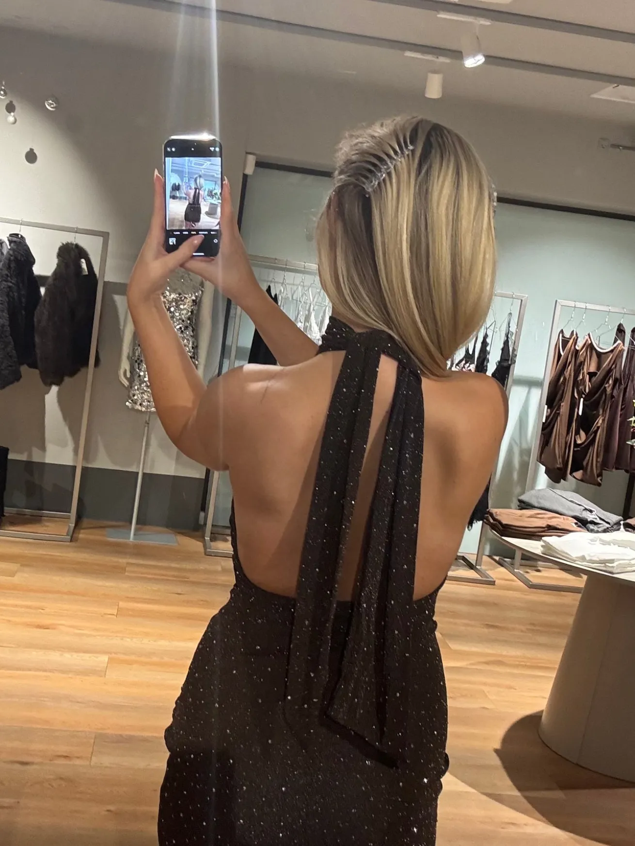 Denne smukke glimmer kjole er perfekt til nytåret – den bindes i nakken og er åben på ryggen. Kjolen er kort og tætsiddende.