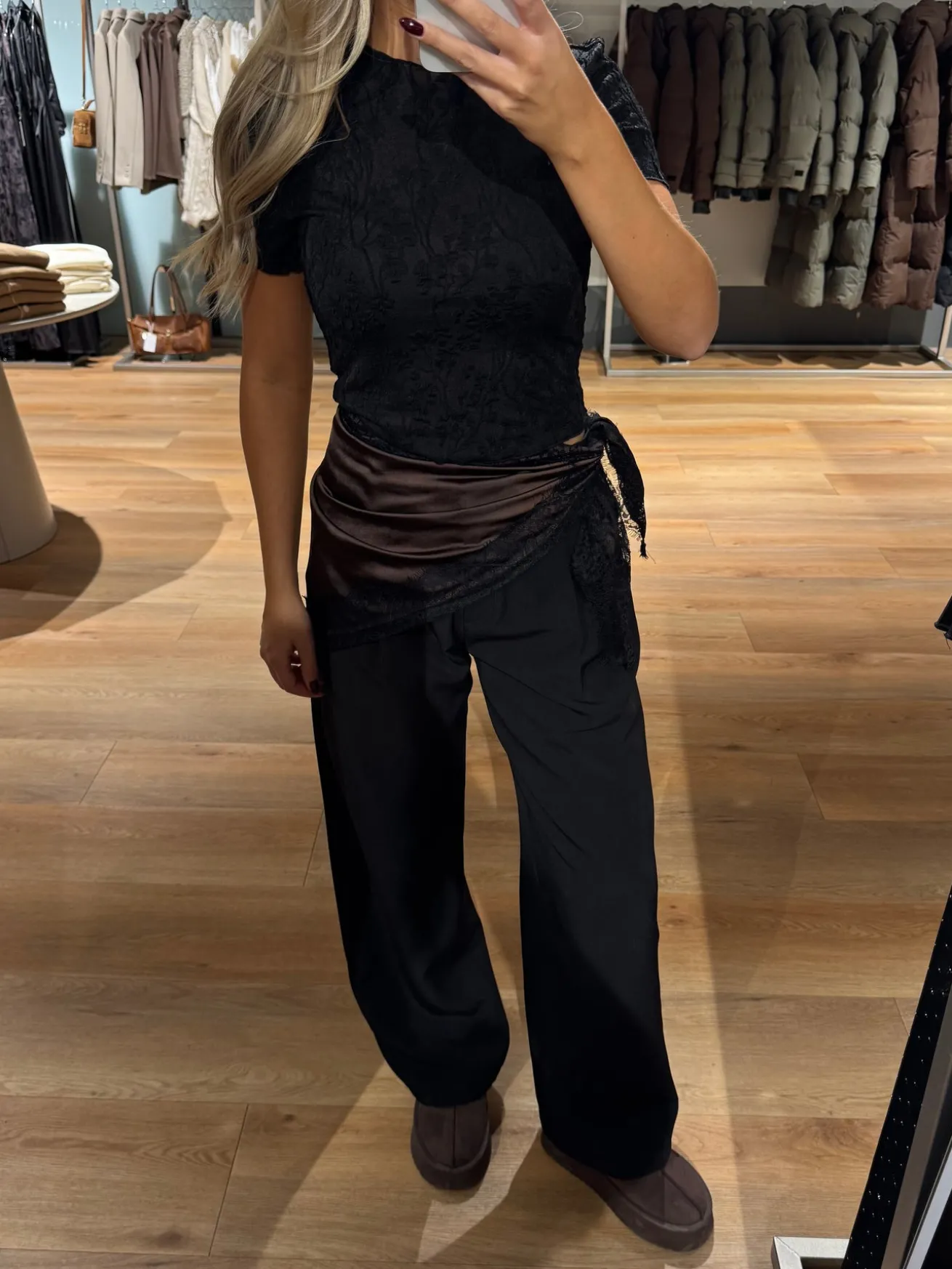 Lina tørklædet i er perfekt til at binde omkring hoften. Du kan sætte det under en oversized strik og til forskellige bukser.