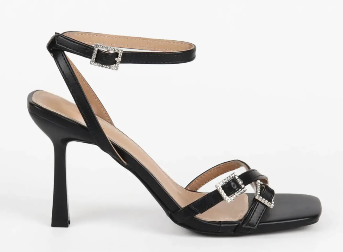 Lucia stiletterne går op omkring ankel of spændes der. De har en glimmer spænde omkring anklen, men også foran omkring fødderne.