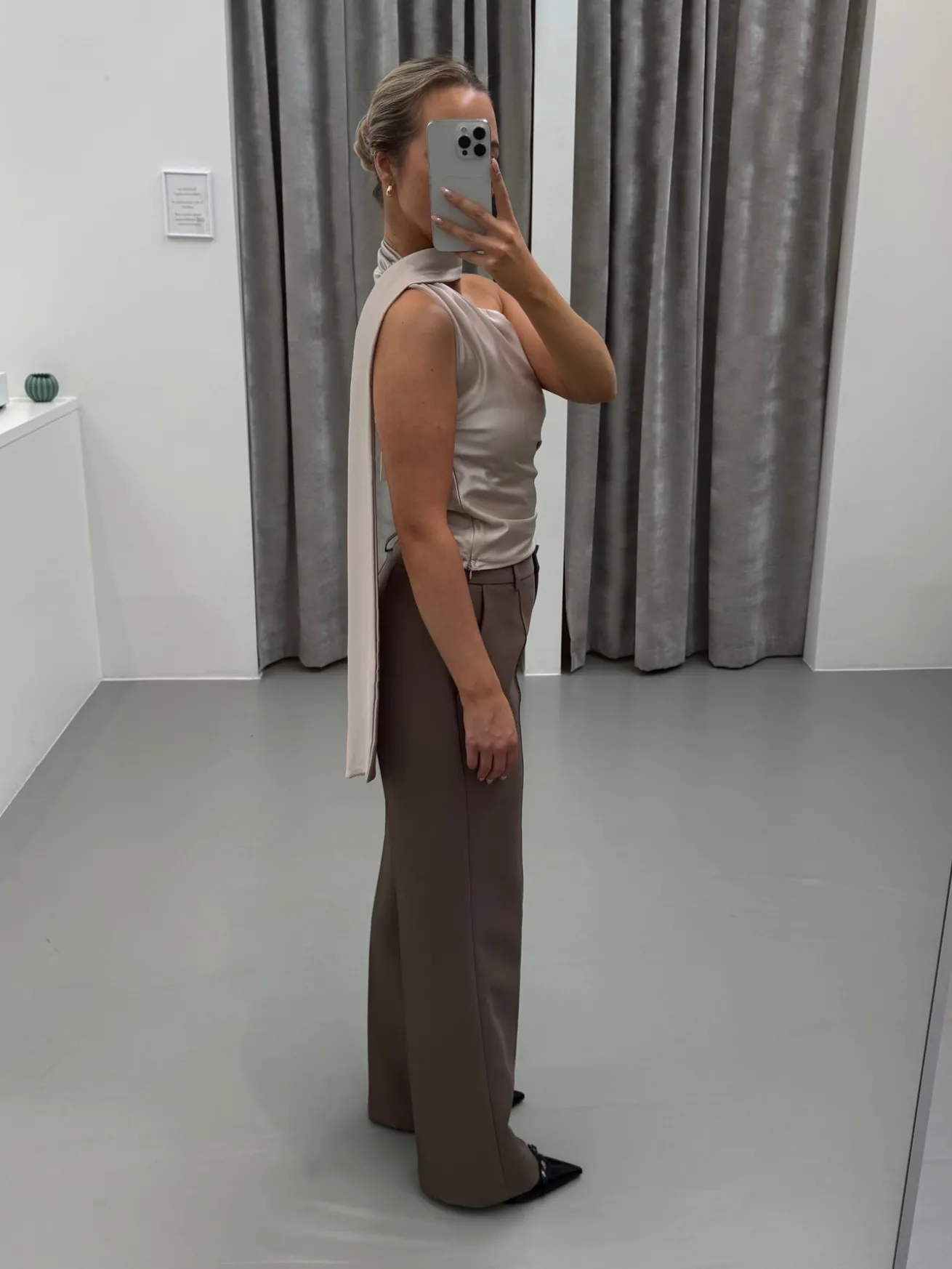 Margot toppen har en fri skulder og et fint stykke stof som går omkring halsen. Den er tætsiddende men har de fineste rynker, som giver blusen lidt mere form.