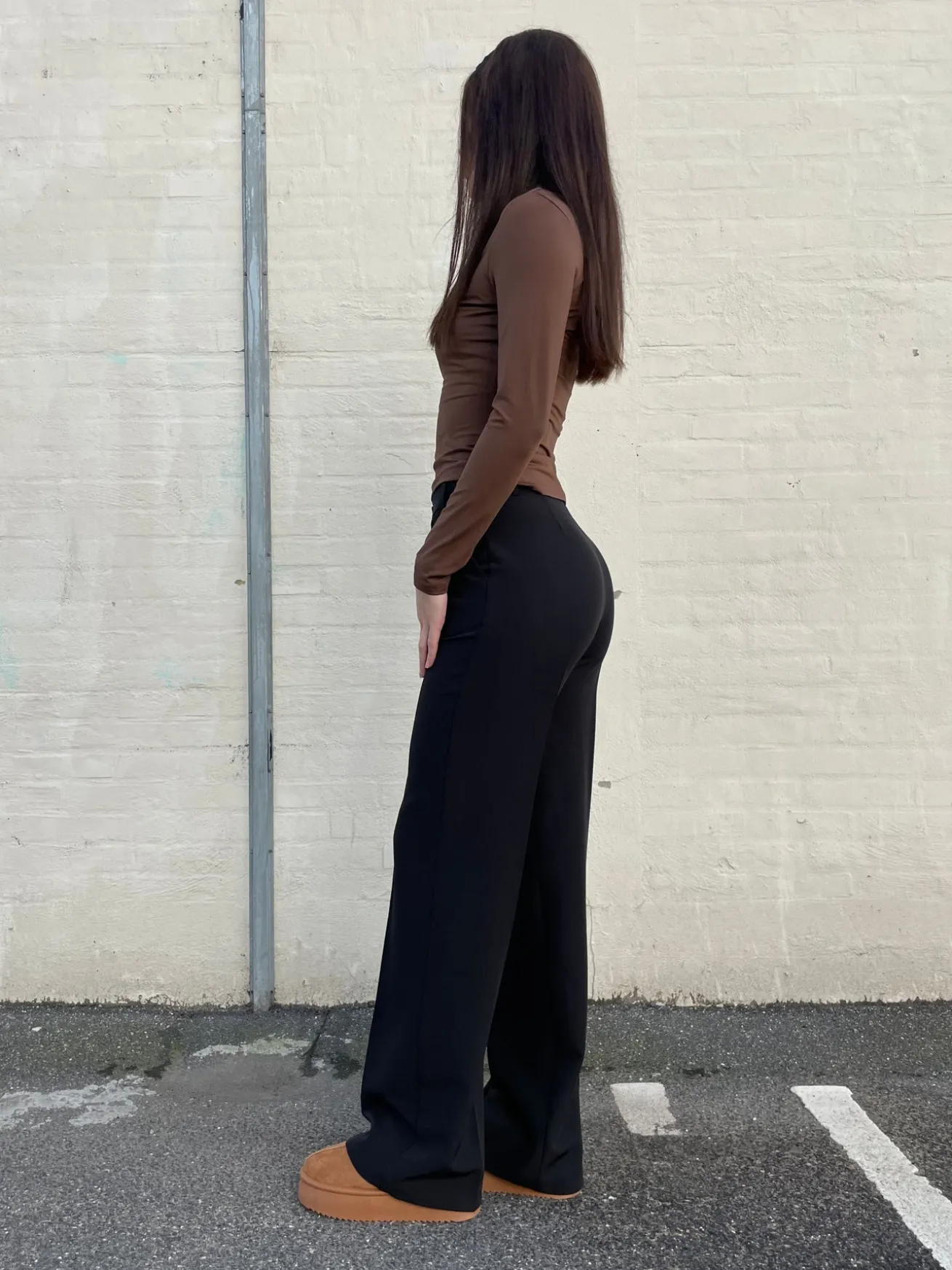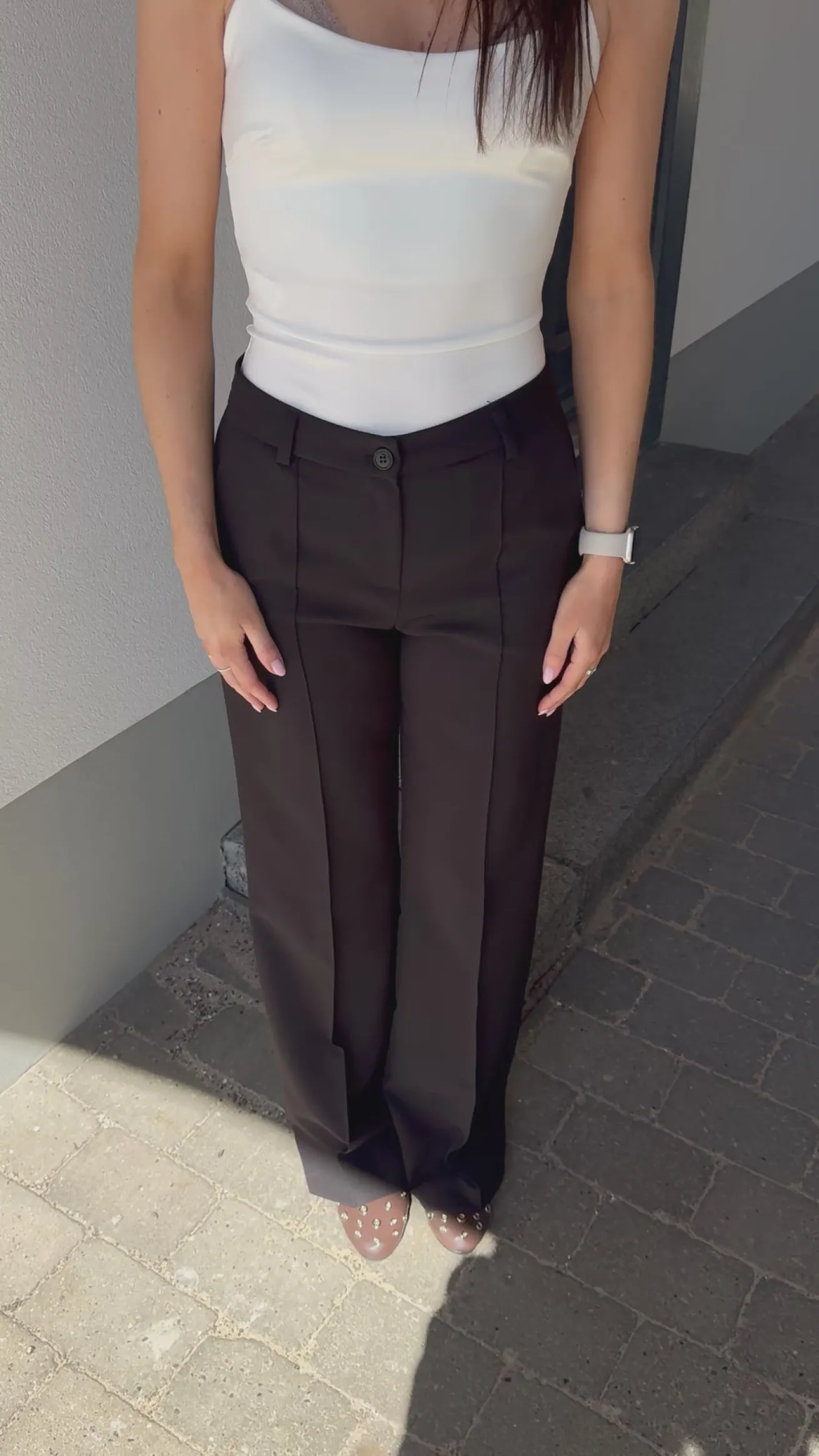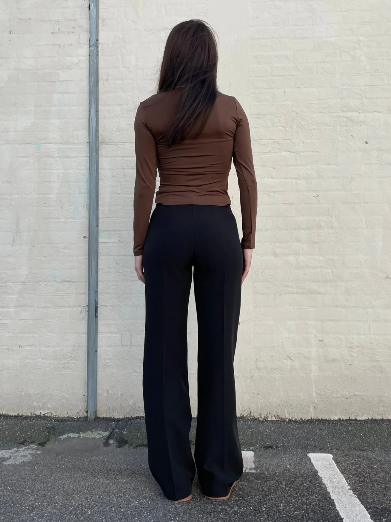 Elegante og strækbare habitbukser. Bukserne har vidde i bunden og spændes med en knap i livet. Styles perfekt med et par sneakers eller stiletter.