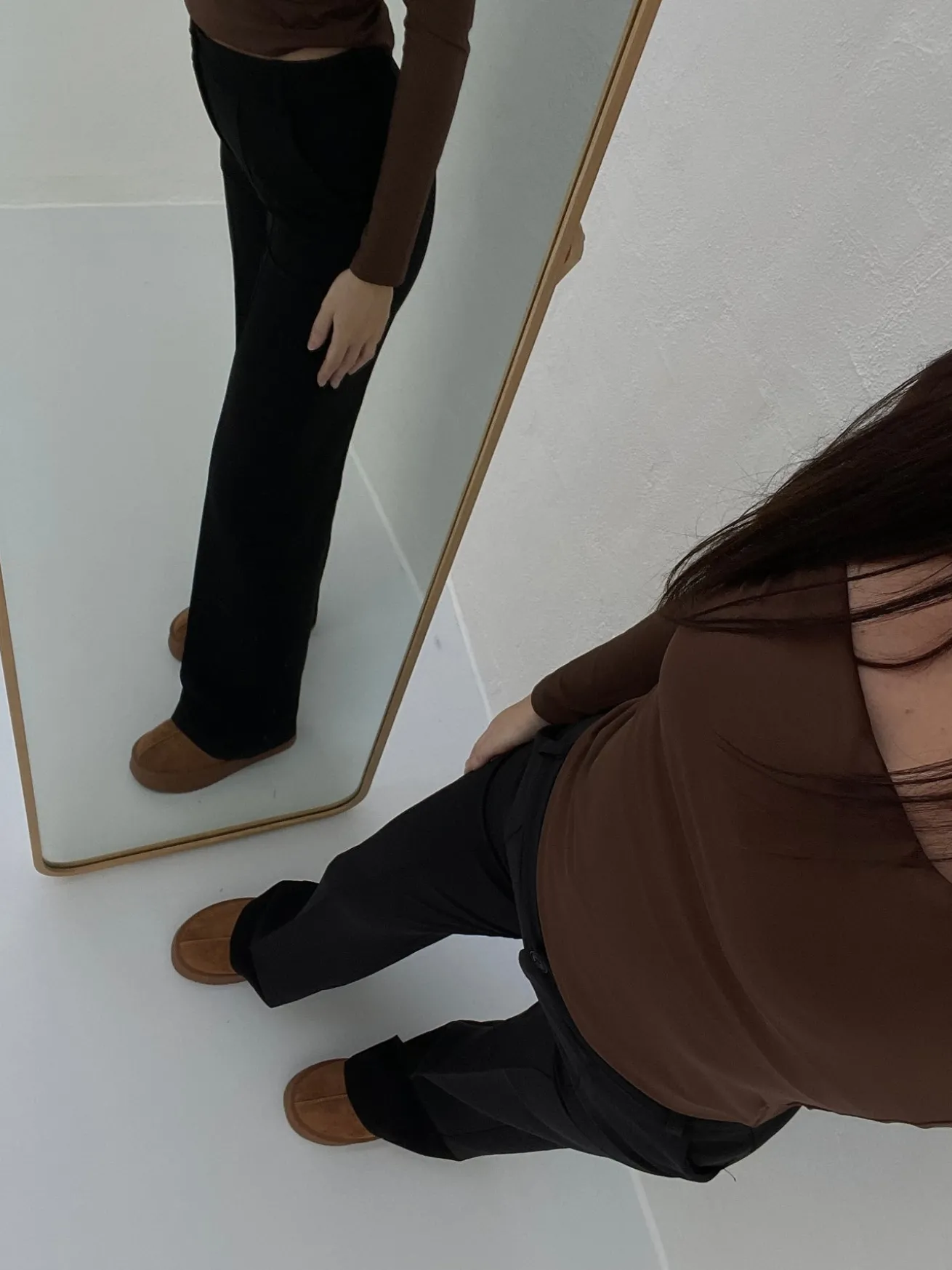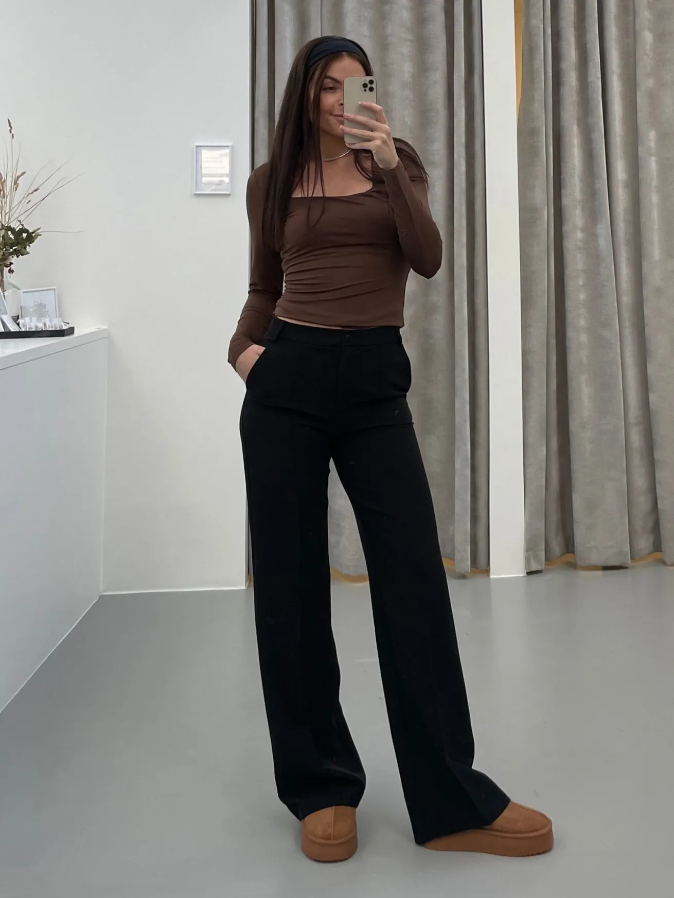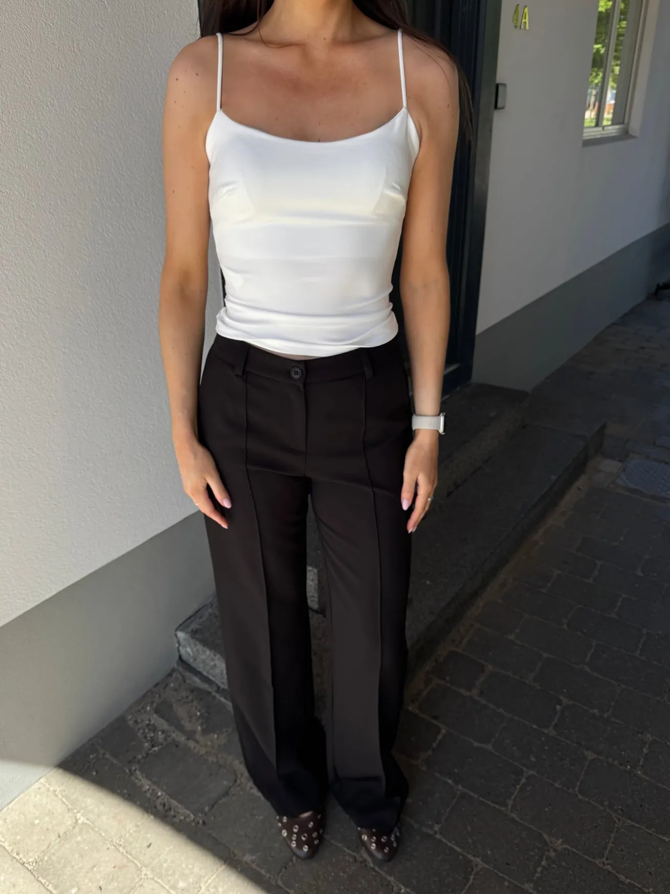 Elegante og strækbare habitbukser. Bukserne har vidde i bunden og spændes med en knap i livet. Styles perfekt med et par sneakers eller stiletter.