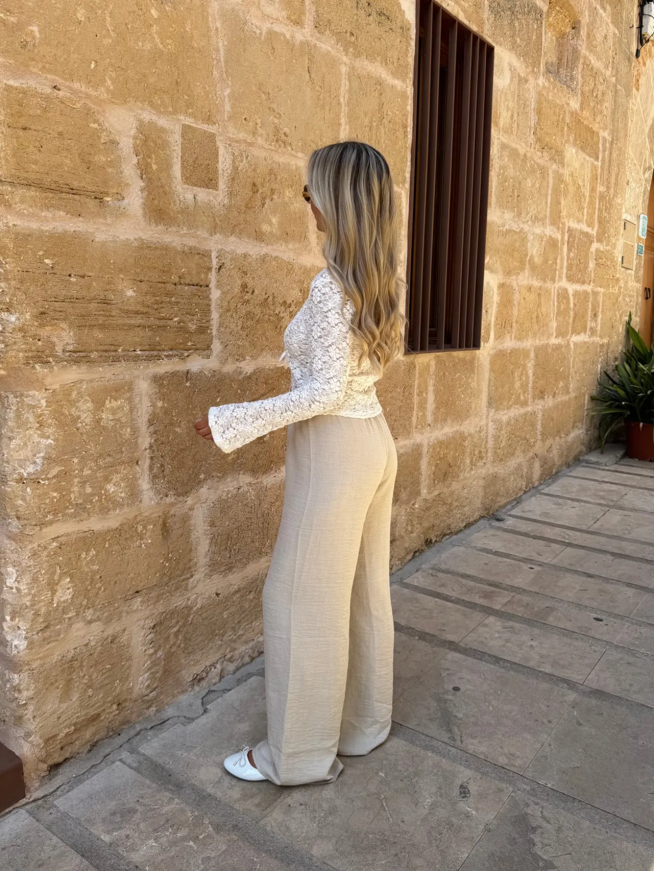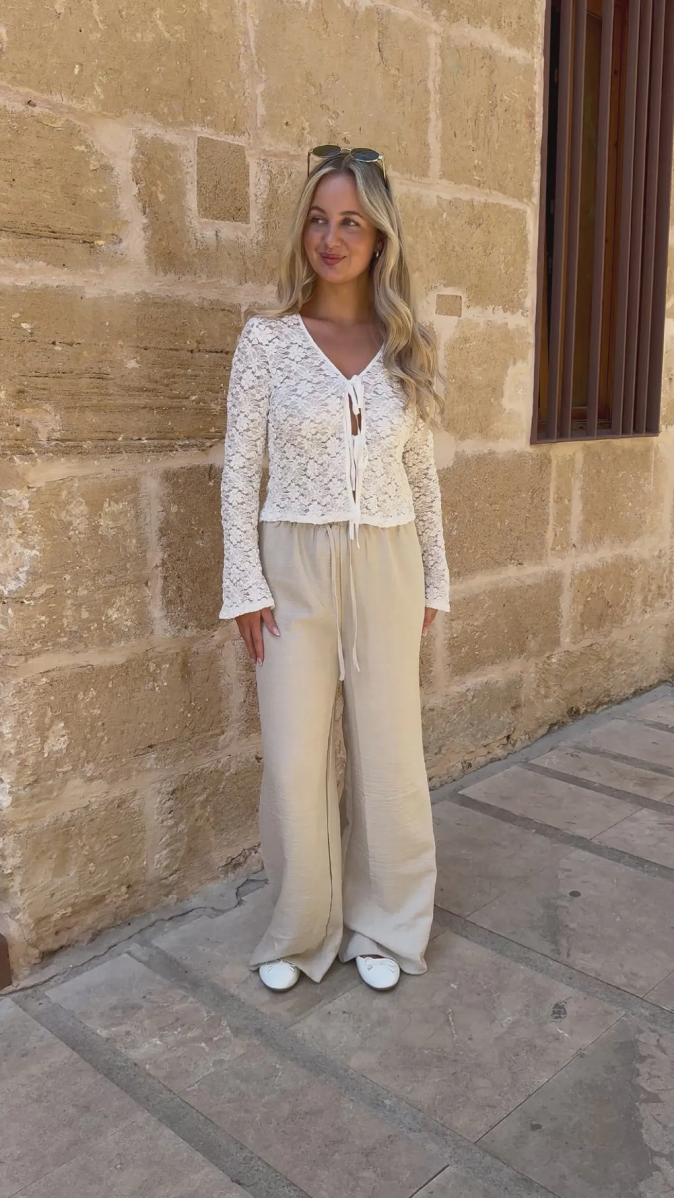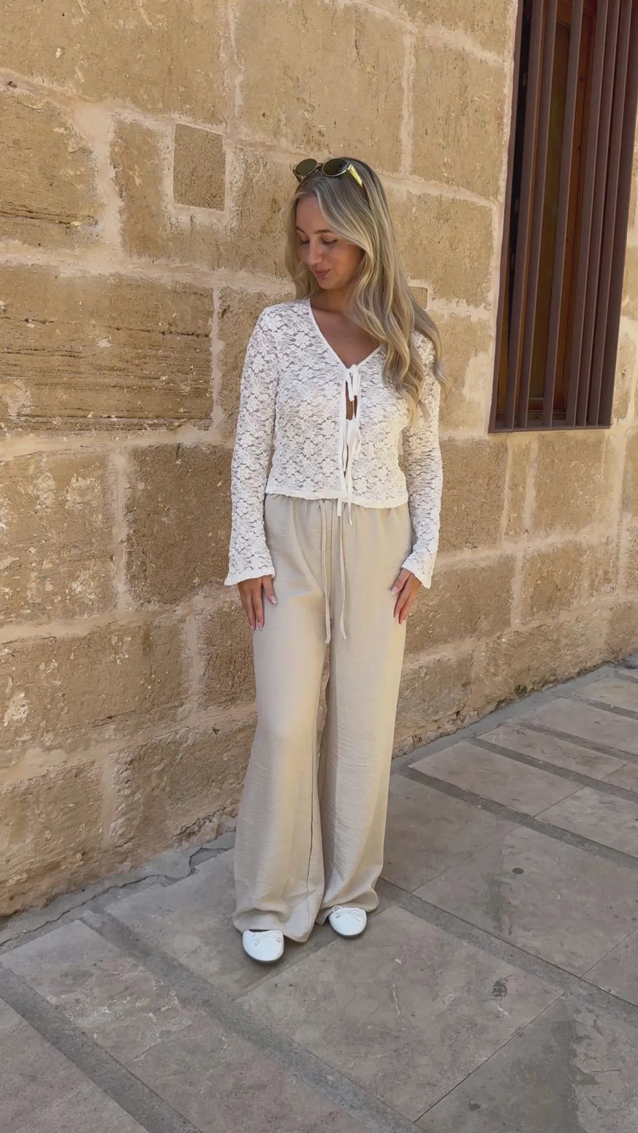Sara bukserne har et bindebånd i taljen. De er perfekte til sommeren og luftige i det varme vejr.