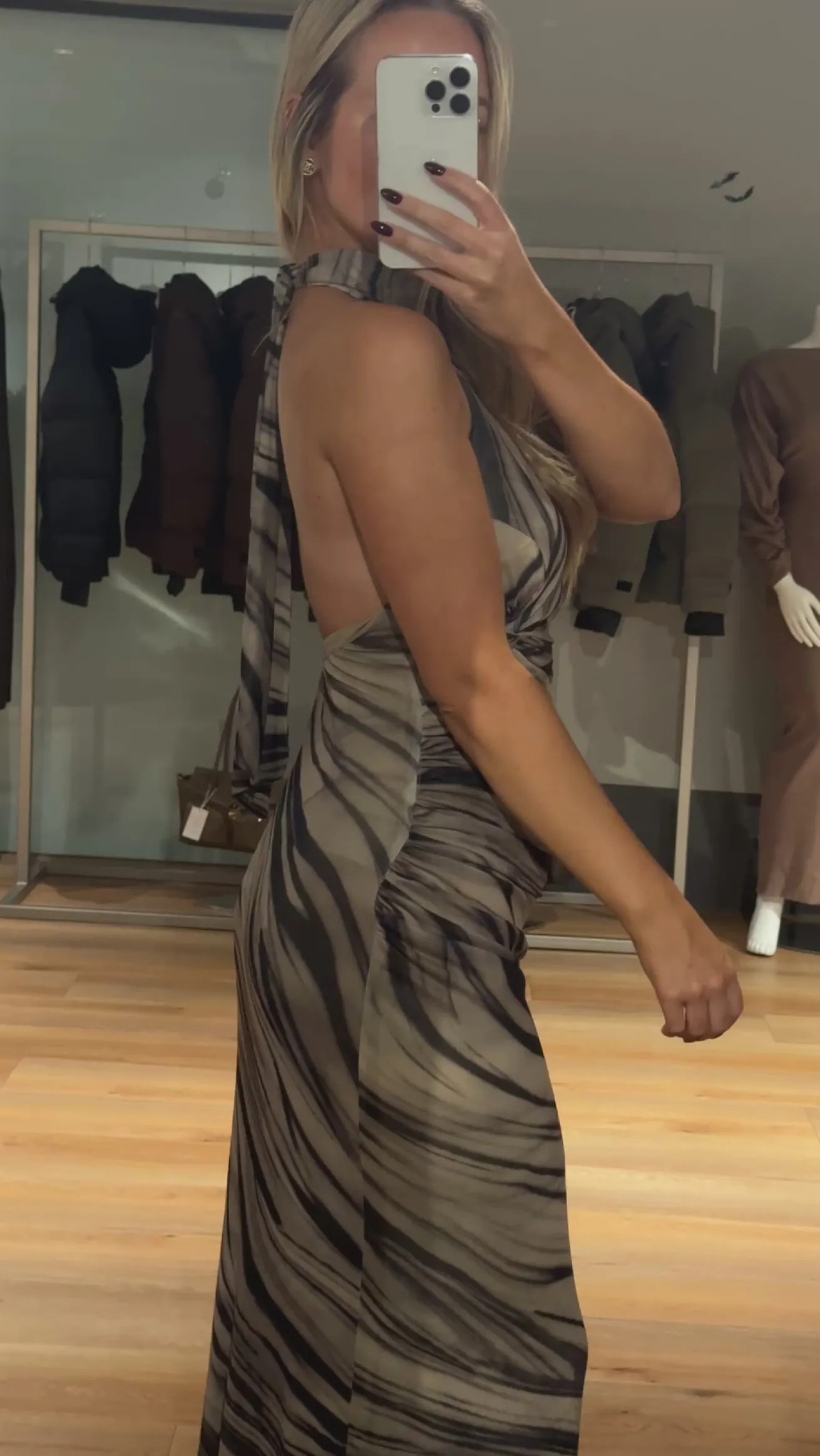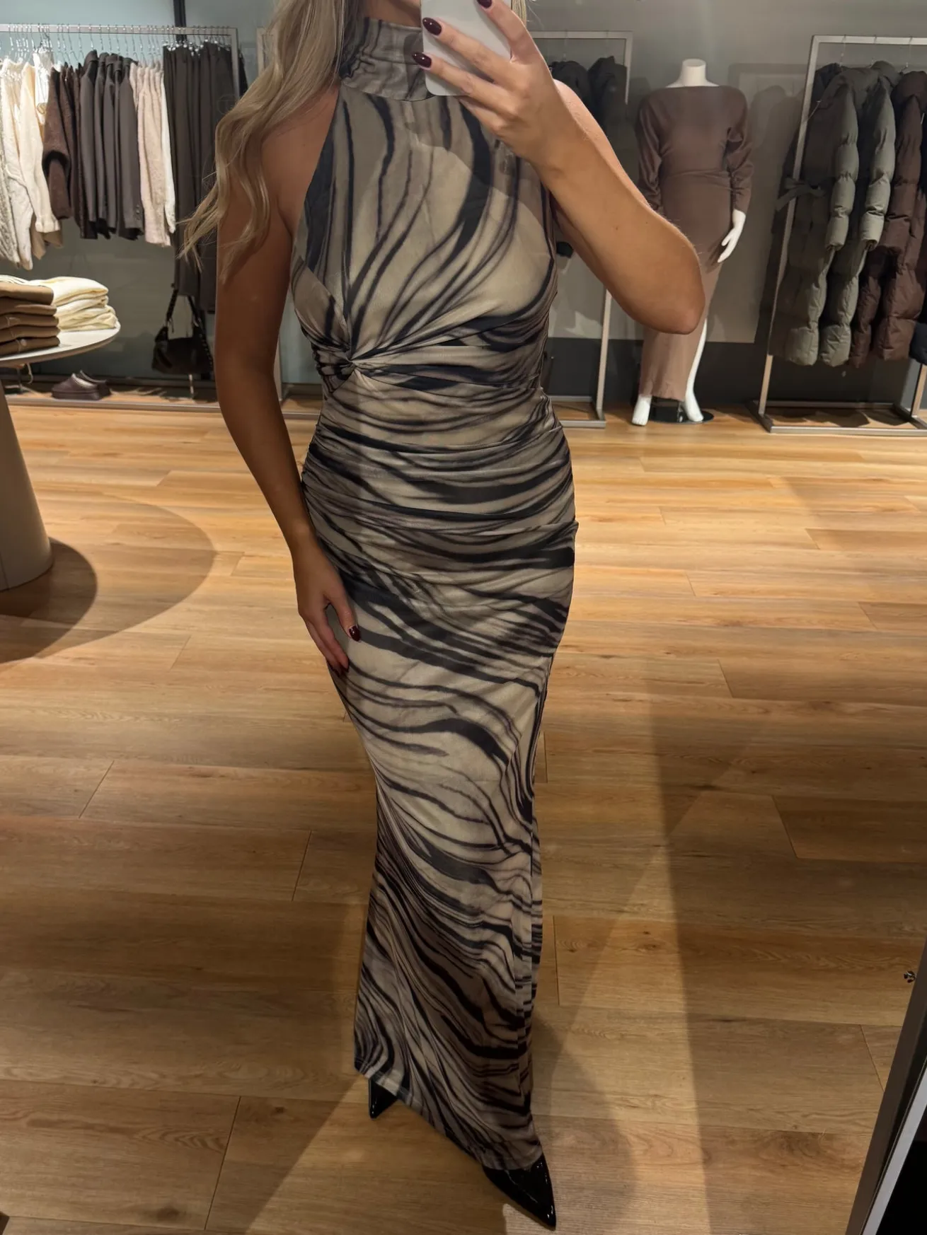 Sara kjolen går på omkring halsen og har en åben ryg, kjolen bliver bundet i nakken. Den har scrunch i siden, som giver kjolen mere form. Kjolen er tætsiddende. Denne smukke kjole er perfekt til årets sidste fester og nytår.