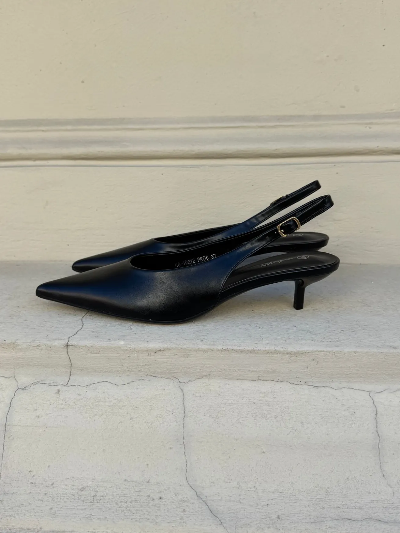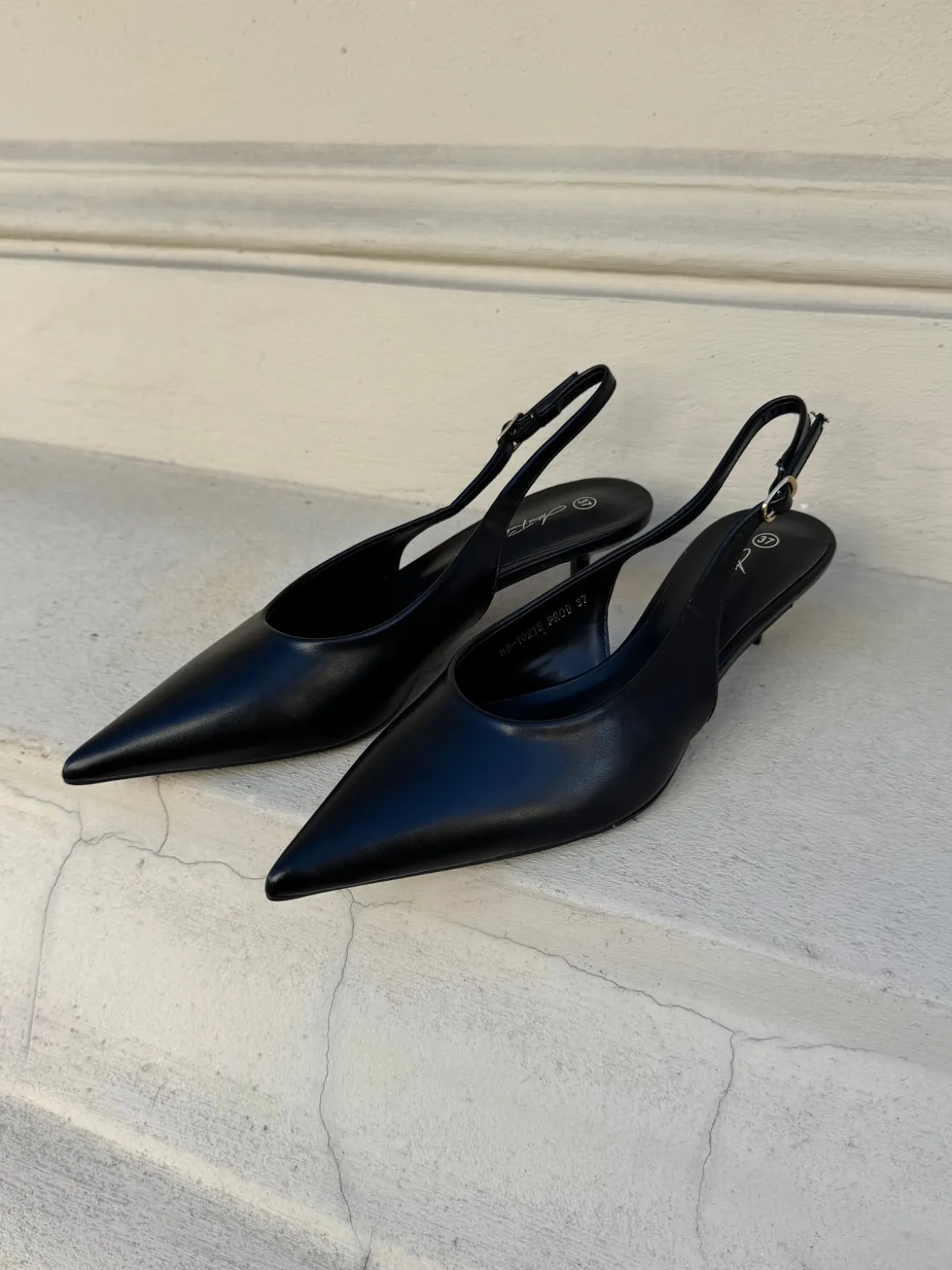 Sofia stiletterne har en spids snude og et læder-look. De har en rem bagtil som kan justeres efter behov.
