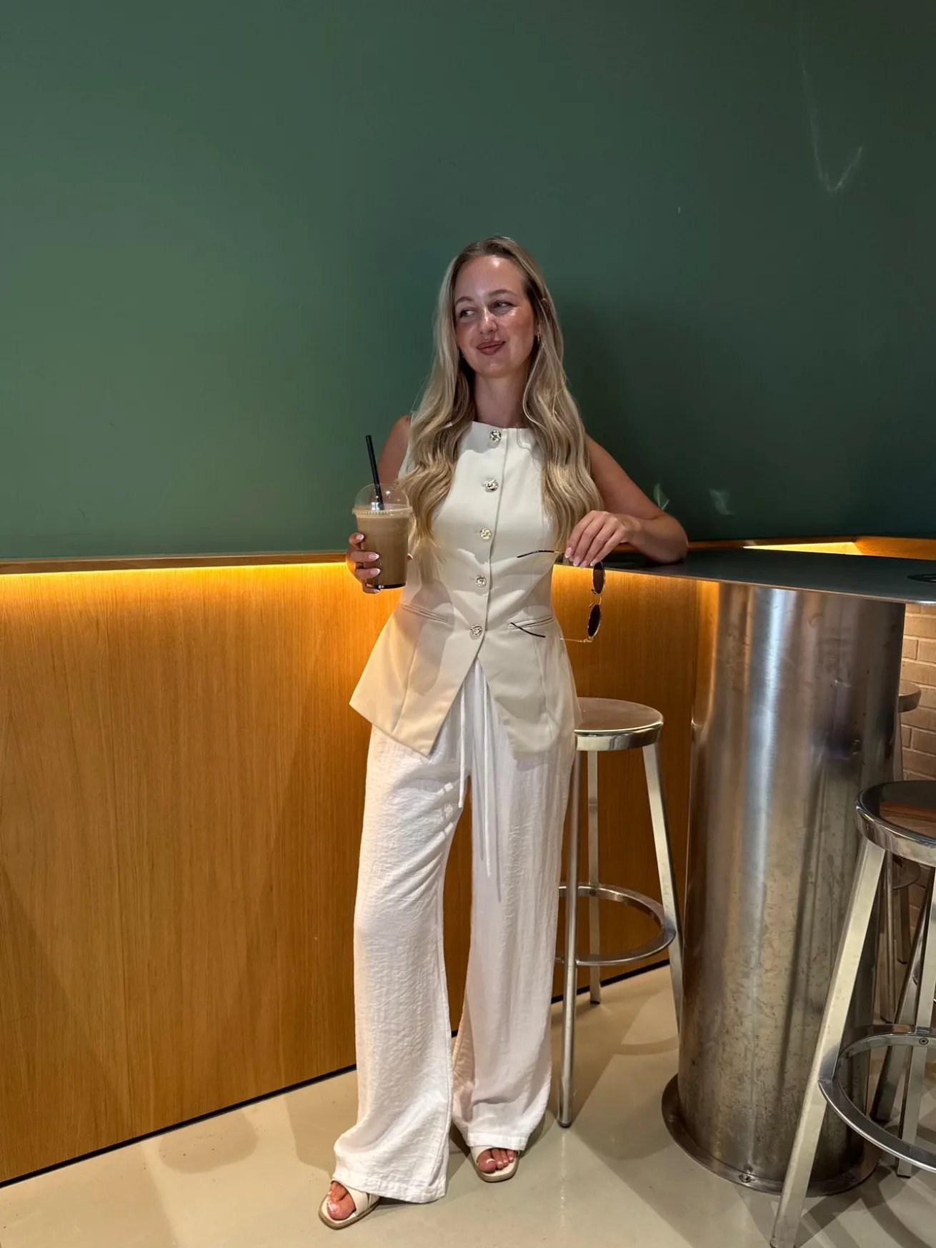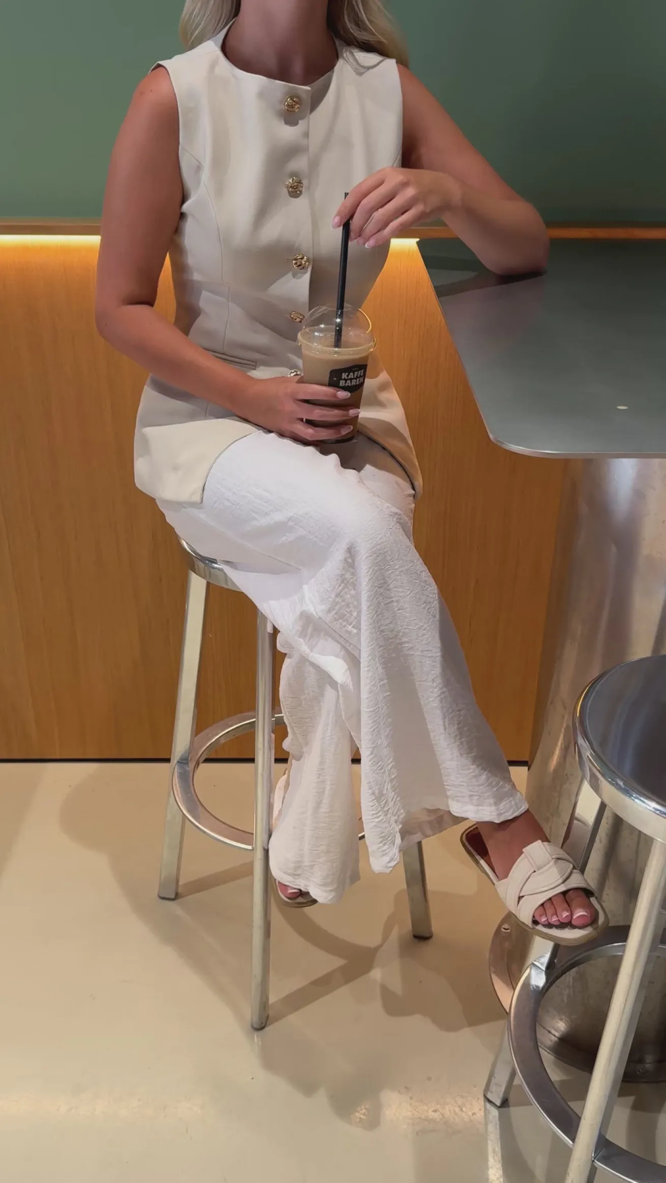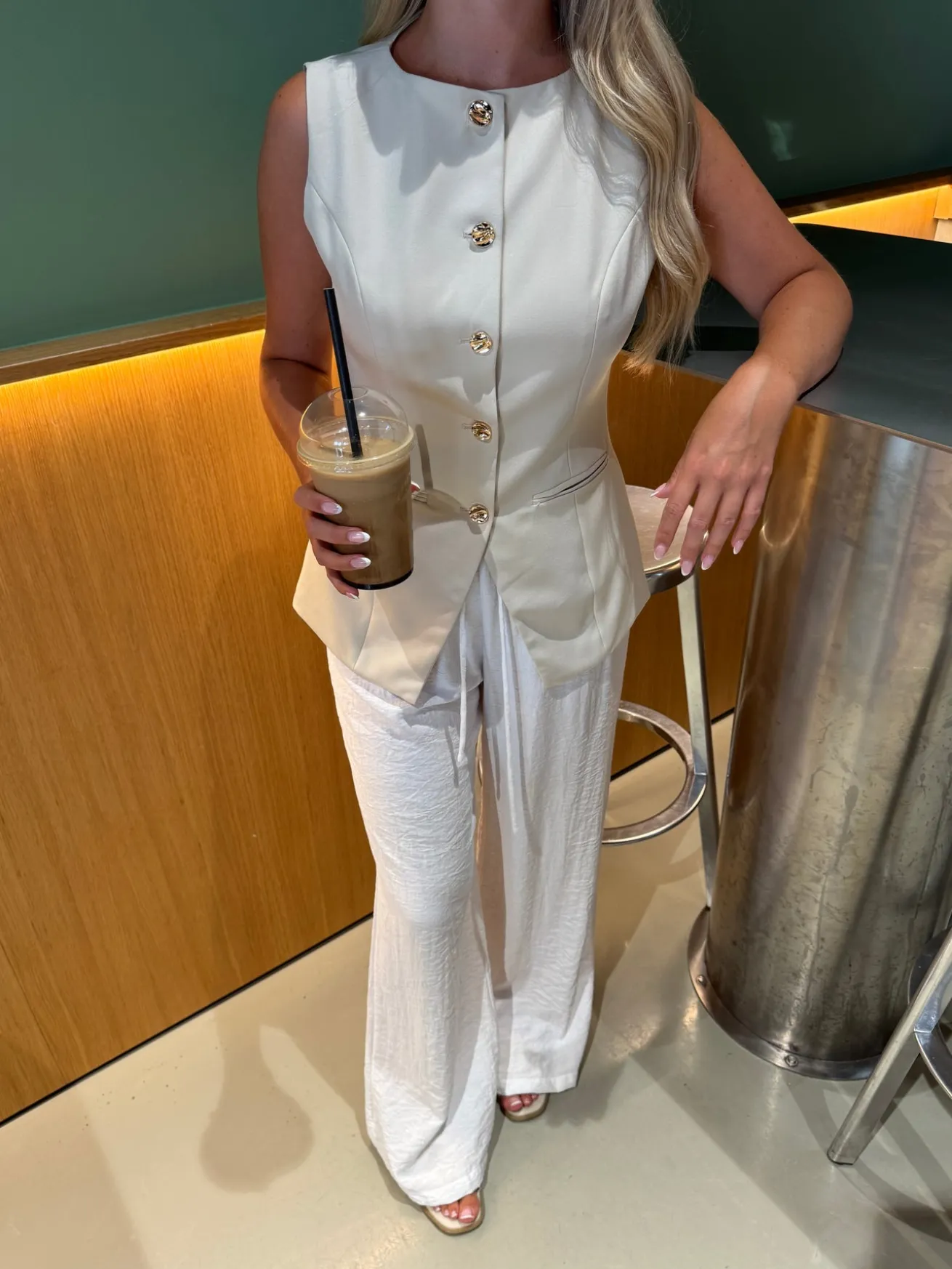 Stella vesten lukkes fortil. Den har en A-åbning i bunden og fremhæver taljen. Vesten er perfekt til hverdag og festlige begivenheder.