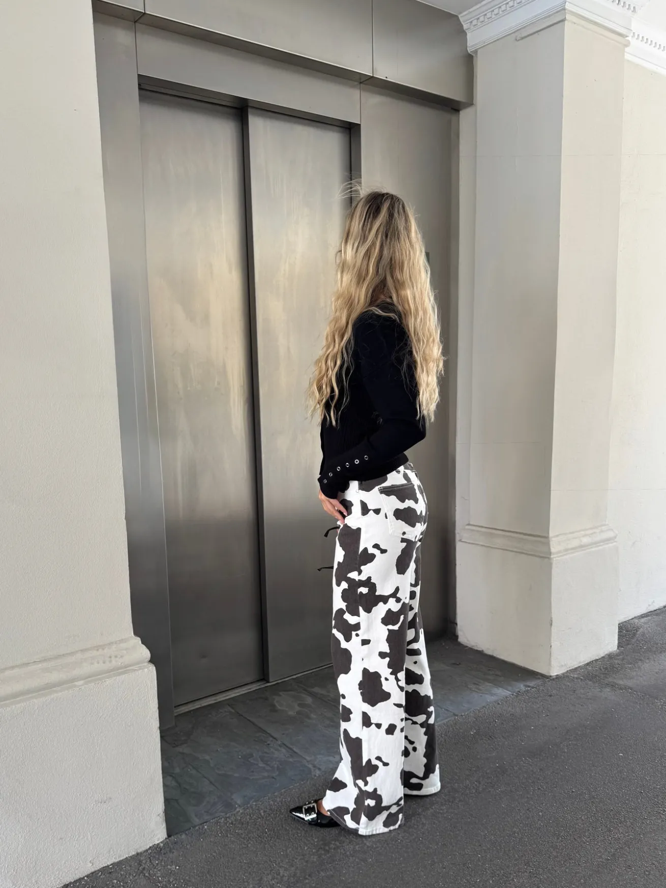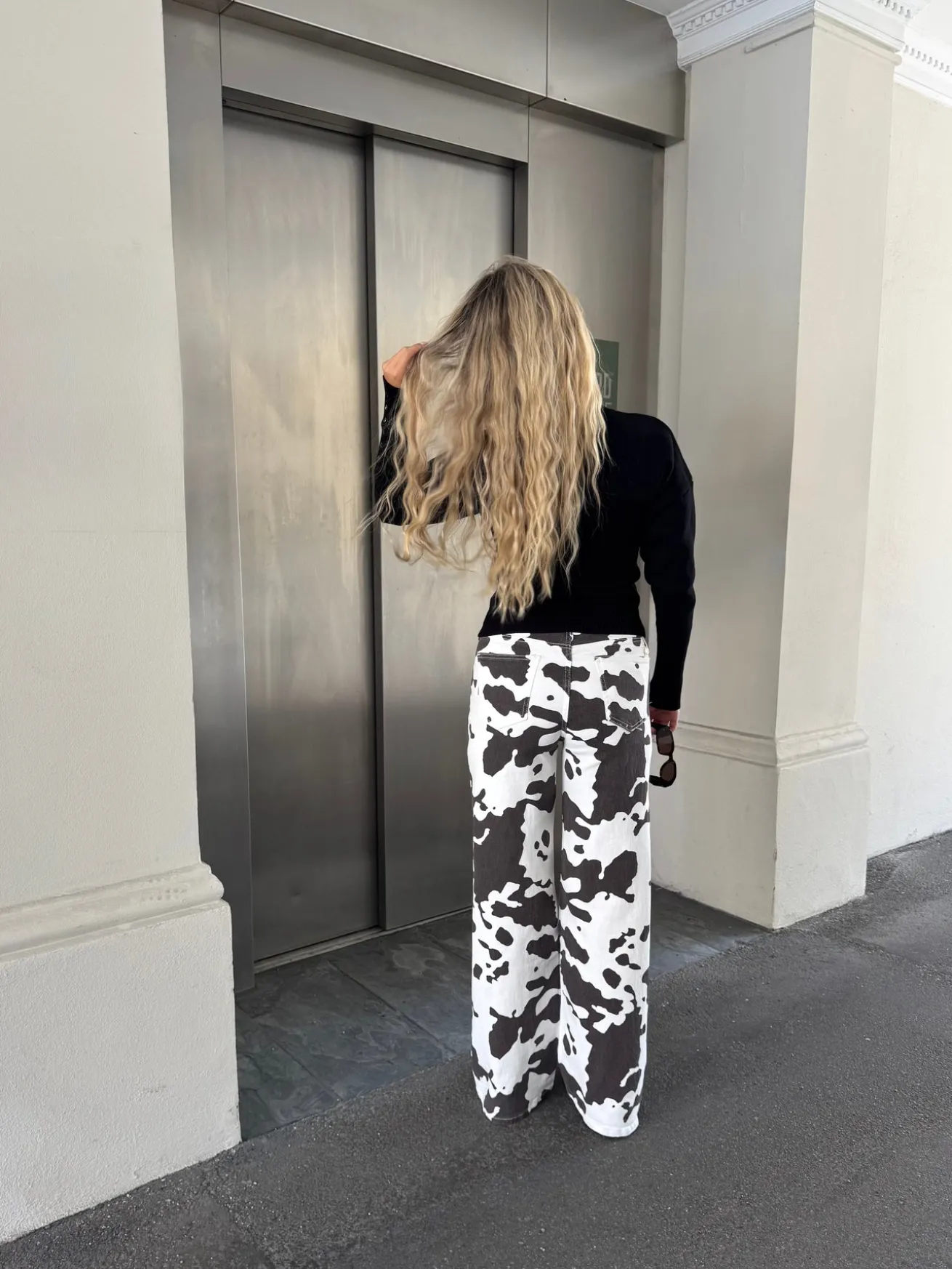 Valerie bukserne har det fineste ko-print. Bukserne har en bred pasform og en masse elastik.