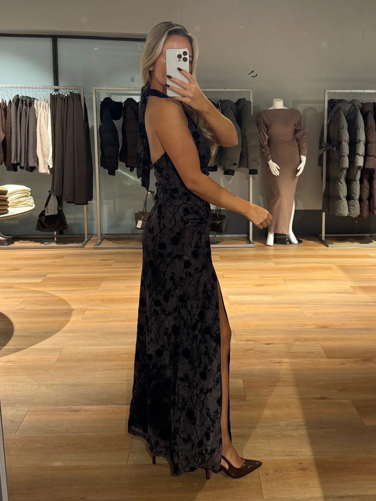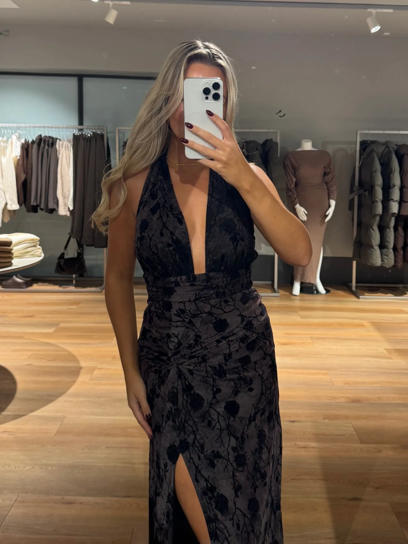 Vanessa kjolen har de smukkeste blomster i stoffet og går ind i taljen. Kjolen bindes i nakken og har en åben ryg. Kjolen er helt perfekt til fine begivenheder og til nytår.